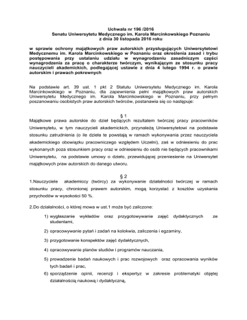 Uchwała nr 196 /2016 Senatu Uniwersytetu Medycznego im. Karola Marcinkowskiego Poznaniu z dnia 30 listopada 2016 roku w sprawie ochrony majątkowych praw autorskich przysługujących Uniwersytetowi Medycznemu im. Karola Marcinkowskiego w Poznaniu oraz określenia zasad i trybu postępowania przy ustalaniu udziału w wynagrodzeniu zasadniczym części wynagrodzenia za pracę o charakterze twórczym, wynikającym ze stosunku pracy nauczycieli akademickich, podlegającej ustawie z dnia 4 lutego 1994 r. o prawie autorskim i prawach pokrewnych Na podstawie art. 39 ust. 1 pkt 2 Statutu Uniwersytetu Medycznego im. Karola Marcinkowskiego w Poznaniu, dla zapewnienia pełni majątkowych praw autorskich Uniwersytetu Medycznego im. Karola Marcinkowskiego w Poznaniu, przy pełnym poszanowaniu osobistych praw autorskich twórców, postanawia się co następuje: §1 Majątkowe prawa autorskie do dzieł będących rezultatem twórczej pracy pracowników Uniwersytetu, w tym nauczycieli akademickich, przynależą Uniwersytetowi na podstawie stosunku zatrudnienia (o ile dzieła te powstają w ramach wykonywania przez nauczyciela akademickiego obowiązku pracowniczego względem Uczelni), zaś w odniesieniu do prac wykonanych poza stosunkiem pracy oraz w odniesieniu do osób nie będących pracownikami Uniwersytetu, na podstawie umowy o dzieło, przewidującej przeniesienie na Uniwersytet majątkowych praw autorskich do danego utworu. §2 1.Nauczyciele akademiccy (twórcy) za wykonywanie działalności twórczej w ramach stosunku pracy, chronionej prawem autorskim, mogą korzystać z kosztów uzyskania przychodów w wysokości 50 %. 2.Do działalności, o której mowa w ust.1 może być zaliczone: 1) wygłaszanie studentami, wykładów oraz przygotowywanie zajęć dydaktycznych ze 2) opracowywanie pytań i zadań na kolokwia, zaliczenia i egzaminy, 3) przygotowanie konspektów zajęć dydaktycznych, 4) opracowywanie planów studiów i programów nauczania, 5) prowadzenie badań naukowych i prac rozwojowych oraz opracowania wyników tych badań i prac, 6) sporządzenie opinii, recenzji i ekspertyz w zakresie problematyki objętej działalnością naukową i dydaktyczną, 7) inne prace wykonywane w ramach stosunku pracy o ile mają charakter działalności twórczej i podlegają ochronie przewidzianej prawem autorskim. 3.Wynagrodzenie nauczycieli akademickich za korzystanie z praw autorskich lub rozporządzanie nimi w zakresie w jakim w danym roku podatkowym nauczyciel akademicki realizuje zadania związane z przygotowaniem utworów oraz korzystaniem z nich i rozporządzaniem tymi utworami, stanowiące część wynagrodzenia zasadniczego, nie może przekraczać, w roku podatkowym: a/ 75 % wynagrodzenia zasadniczego pracownika naukowo-dydaktycznego, b/ 50 % wynagrodzenia zasadniczego pracownika dydaktycznego, c/ 75 % wynagrodzenia zasadniczego pracownika naukowego. 4.W uzasadnionych przypadkach, gdy udział działalności twórczej nauczyciela akademickiego w całości zadań realizowanych w ramach stosunku pracy będzie wyższy niż określony w ust. 3, Rektor, na pisemny wniosek pracownika, może ustalić wyższy procentowy udział wynagrodzenia z tytułu korzystania przez nauczyciela akademickiego z praw autorskich. 5. Nie stosuje się 50 % kosztów uzyskania przychodu do wynagrodzeń wypłacanych za okres: a/ urlopu wypoczynkowego, b/ urlopu dla poratowania zdrowia, c/ urlopu macierzyńskiego, rodzicielskiego, ojcowskiego i wychowawczego, d/ zwolnienia lekarskiego, e/ innej usprawiedliwionej nieobecności w pracy przewidzianej przepisami prawa pracy, za którą pracownik otrzymuje wynagrodzenie, za wyjątkiem urlopów naukowych i szkoleniowych, jeżeli w czasie trwania tego urlopu powstanie utwór w rozumieniu ustawy o prawie autorskim i prawach pokrewnych. 6.Udział realizacji zadań, o których mowa w ust. 1, we wszystkich zadaniach realizowanych w danym roku podatkowym nauczyciele akademiccy określają w oświadczeniu składanym w Dziale Płac do 10 grudnia roku poprzedzającego rok podatkowy. Treść oświadczenia zatwierdza kierownik jednostki organizacyjnej, w której zatrudniony jest nauczyciel akademicki składający oświadczenie, w przypadku kierowników jednostek organizacyjnych dziekan danego wydziału, a w przypadku kierowników jednostek ogólnouczelnianych, dziekanów i prorektorów Rektor. Wzór oświadczenia stanowi załącznik nr 1 do niniejszej uchwały. Nauczyciele akademiccy zatrudnieni w trakcie roku podatkowego składają oświadczenia najpóźniej w dniu rozpoczęcia pracy. 7.W przypadku zmiany w trakcie roku podatkowego udziału realizacji zadań, o których mowa w ust. 1 we wszystkich zadaniach realizowanych w danym roku podatkowym, nauczyciel akademicki jest zobowiązany powiadomić o tym fakcie Dział Płac w terminie 7 dni od zaistnienia zmian. 8.Do prac twórczych wykonywanych w ramach stosunku pracy nie mogą być zaliczane prace wykonywane przez nauczycieli akademickich na podstawie umów cywilnoprawnych zawieranych z Uniwersytetem Medycznym im. Karola Marcinkowskiego w Poznaniu. §3 1.Poczynając od dnia 1 stycznia 2017 r., czy to w celu ustalenia udziału w wynagrodzeniu zasadniczym części wynagrodzenia za pracę o charakterze twórczym, umożliwiającym skorzystanie przez pracownika z odliczenia 50 % kosztów uzyskania przychodu z tytułu wykonania dla Uniwersytetu utworu, bądź innego przedmiotu praw własności intelektualnej będącego przedmiotem prawa autorskiego, czy dla uznania umowy o dzieło za zrealizowaną i wypłaty należnego z tego tytułu wynagrodzenia, czy też każdego innego celu, konieczne jest przekazanie dzieła i jego przyjęcie przez Uniwersytet do Repozytorium UMP.Gdy utwór przybiera postać niematerialną przedmiotem przekazania jest, dający możliwość poddania utworu ocenie np. konspekt zajęć opracowany zgodnie z sylabusem przedmiotu. 2. Złożenie dzieła przez twórcę, w formie elektronicznej, potwierdzone numerem identyfikacyjnym w 