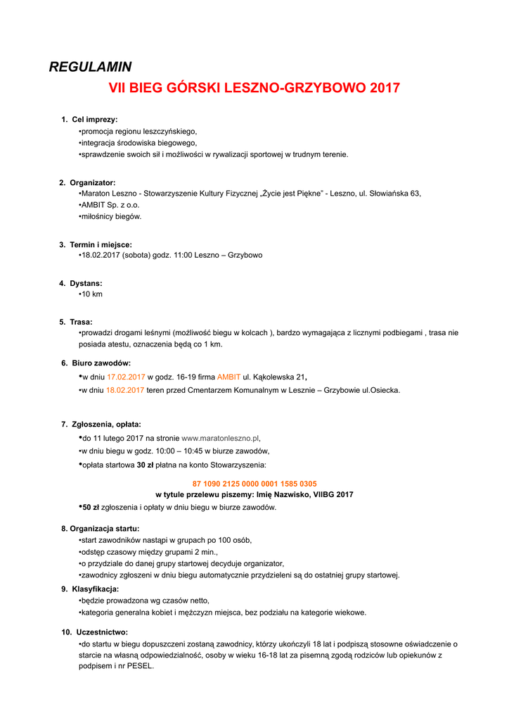 REGULAMIN VII BIEG GÓRSKI LESZNO-GRZYBOWO 2017 1. Cel imprezy: •promocja regionu leszczyńskiego, •integracja środowiska biegowego, •sprawdzenie swoich sił i możliwości w rywalizacji sportowej w trudnym terenie. 2. Organizator: •Maraton Leszno - Stowarzyszenie Kultury Fizycznej „Życie jest Piękne” - Leszno, ul. Słowiańska 63, •AMBIT Sp. z o.o. •miłośnicy biegów. 3. Termin i miejsce: •18.02.2017 (sobota) godz. 11:00 Leszno – Grzybowo 4. Dystans: •10 km 5. Trasa: •prowadzi drogami leśnymi (możliwość biegu w kolcach ), bardzo wymagająca z licznymi podbiegami , trasa nie posiada atestu, oznaczenia będą co 1 km. 6. Biuro zawodów: •w dniu 17.02.2017 w godz. 16-19 firma AMBIT ul. Kąkolewska 21, •w dniu 18.02.2017 teren przed Cmentarzem Komunalnym w Lesznie – Grzybowie ul.Osiecka. 7. Zgłoszenia, opłata: •do 11 lutego 2017 na stronie www.maratonleszno.pl, •w dniu biegu w godz. 10:00 – 10:45 w biurze zawodów, •opłata startowa 30 zł płatna na konto Stowarzyszenia: 87 1090 2125 0000 0001 1585 0305 w tytule przelewu piszemy: Imię Nazwisko, VIIBG 2017 •50 zł zgłoszenia i opłaty w dniu biegu w biurze zawodów. 8. Organizacja startu: •start zawodników nastąpi w grupach po 100 osób, •odstęp czasowy między grupami 2 min., •o przydziale do danej grupy startowej decyduje organizator, •zawodnicy zgłoszeni w dniu biegu automatycznie przydzieleni są do ostatniej grupy startowej. 9. Klasyfikacja: •będzie prowadzona wg czasów netto, •kategoria generalna kobiet i mężczyzn miejsca, bez podziału na kategorie wiekowe. 10. Uczestnictwo: •do startu w biegu dopuszczeni zostaną zawodnicy, którzy ukończyli 18 lat i podpiszą stosowne oświadczenie o starcie na własną odpowiedzialność, osoby w wieku 16-18 lat za pisemną zgodą rodziców lub opiekunów z podpisem i nr PESEL. 11. Wyżywienie: •każdy zawodnik na mecie otrzyma ciepłą herbatę i drożdżówkę. 12. Postanowienia końcowe: • organizator przewidział pamiątkowy medal dla wszystkich kończących bieg, • sklasyfikowani zostaną wszyscy uczestnicy, którzy ukończą bieg na podstawie indywidualnego pomiaru czasu, • organizator nie odpowiada za rzeczy zagubione, • organizator nie zapewnia kąpieli po biegu, • uczestnicy biorą udział w biegu na własną odpowiedzialność, wskazane jest ubezpieczenie na własny koszt od następstw nieszczęśliwych wypadków, •pobranie numeru startowego przez zawodnika jest równoznaczne z akceptacją powyższego regulaminu.