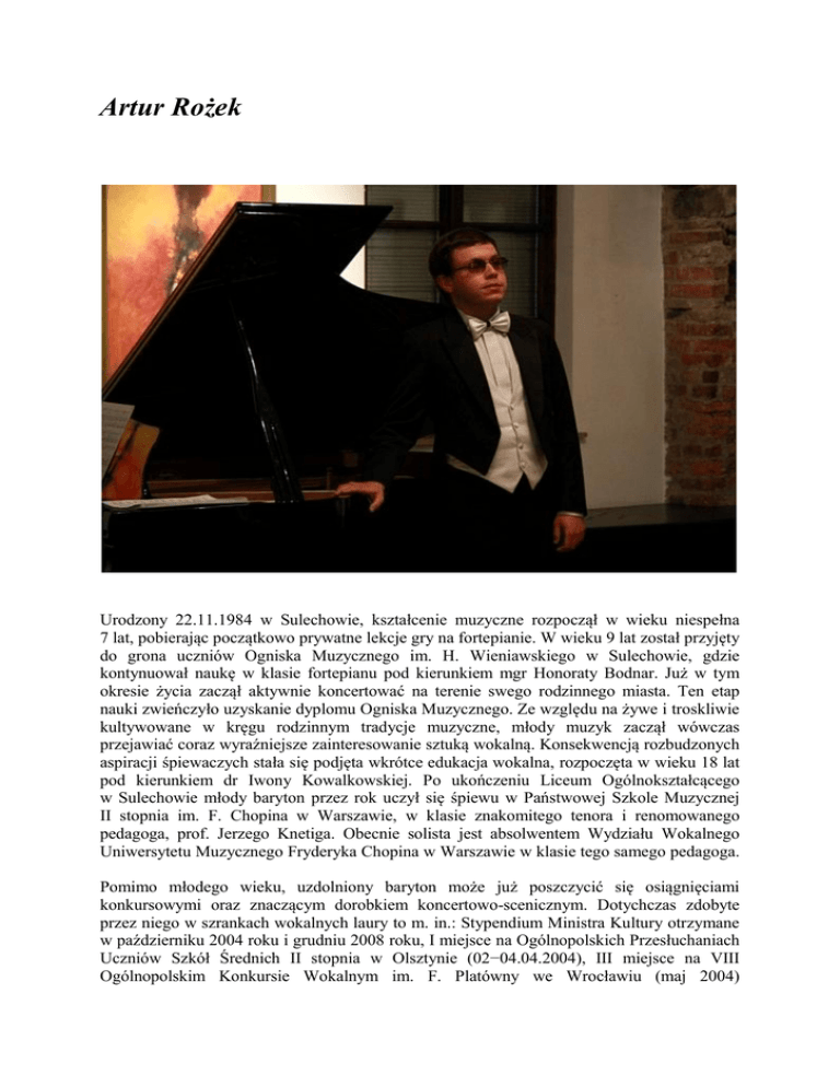 Artur Rożek Urodzony 22.11.1984 w Sulechowie, kształcenie muzyczne rozpoczął w wieku niespełna 7 lat, pobierając początkowo prywatne lekcje gry na fortepianie. W wieku 9 lat został przyjęty do grona uczniów Ogniska Muzycznego im. H. Wieniawskiego w Sulechowie, gdzie kontynuował naukę w klasie fortepianu pod kierunkiem mgr Honoraty Bodnar. Już w tym okresie życia zaczął aktywnie koncertować na terenie swego rodzinnego miasta. Ten etap nauki zwieńczyło uzyskanie dyplomu Ogniska Muzycznego. Ze względu na żywe i troskliwie kultywowane w kręgu rodzinnym tradycje muzyczne, młody muzyk zaczął wówczas przejawiać coraz wyraźniejsze zainteresowanie sztuką wokalną. Konsekwencją rozbudzonych aspiracji śpiewaczych stała się podjęta wkrótce edukacja wokalna, rozpoczęta w wieku 18 lat pod kierunkiem dr Iwony Kowalkowskiej. Po ukończeniu Liceum Ogólnokształcącego w Sulechowie młody baryton przez rok uczył się śpiewu w Państwowej Szkole Muzycznej II stopnia im. F. Chopina w Warszawie, w klasie znakomitego tenora i renomowanego pedagoga, prof. Jerzego Knetiga. Obecnie solista jest absolwentem Wydziału Wokalnego Uniwersytetu Muzycznego Fryderyka Chopina w Warszawie w klasie tego samego pedagoga. Pomimo młodego wieku, uzdolniony baryton może już poszczycić się osiągnięciami konkursowymi oraz znaczącym dorobkiem koncertowo-scenicznym. Dotychczas zdobyte przez niego w szrankach wokalnych laury to m. in.: Stypendium Ministra Kultury otrzymane w październiku 2004 roku i grudniu 2008 roku, I miejsce na Ogólnopolskich Przesłuchaniach Uczniów Szkół Średnich II stopnia w Olsztynie (02−04.04.2004), III miejsce na VIII Ogólnopolskim Konkursie Wokalnym im. F. Platówny we Wrocławiu (maj 2004) oraz I miejsce na Ogólnopolskim Konkursie „Polska Muzyka Wokalna” w Warszawie (czerwiec 2005). Od kwietnia 2007 r. młody śpiewak jest laureatem Nagrody Specjalnej na VI Międzynarodowym Konkursie im. Stanisława Moniuszki w Warszawie, a od maja tego samego roku jest laureatem Nagrody Specjalnej na XII Międzynarodowym Konkursie im. Ady Sari w Nowym Sączu. We wrześniu roku 2008 zdobył także II Nagrodę na Ogólnopolskim Konkursie „Złote Głosy Mazowsza”. W kwietniu 2010 roku zdobył III Nagrodę na VII Międzynarodowym Konkursie Muzyki Kameralnej im. Kiejstuta Bacewicza w Łodzi. Artur Rożek ma na swoim koncie wiele spektakli operowych. Dotychczas wystąpił w partii Antonia w arcykomedii muzycznej „Wesele Figara” W. A. Mozarta (16.04.2004), oraz w roli Blinda w operetce „Zemsta nietoperza” J. Straussa-syna (11.01.2005). Na przełomie marca i kwietnia 2008 r. brał udział w inscenizacji opery T. Szeligowskiego „Bunt żaków” w warszawskim Teatrze Wielkim, a w kwietniu br. kreował postać Janusza w „Halce wileńskiej” w tym samym teatrze. W Warszawskiej Operze Kameralnej występował na przełomie marca i kwietnia roku 2006, a także w listopadzie roku 2008. Kreował wówczas główne postaci w operach: Josepha Haydna „Il mondo della luna” (Buonafede) i Baldassare Galuppiego „L'amante di tutte” (Don Orazio). Śpiewak prowadzi ożywioną działalność koncertową w kraju i za granicą. Koncertował m. in. wspólnie z Małgorzatą Walewską i Markiem Torzewskim. Obecnie współpracuje m. in. z Krakowską Operą Kameralną i Filharmonią Narodową w Warszawie. Dotychczas współpracował z takimi dyrygentami, jak: Tadeusz Wicherek, Jerzy Salwarowski, Piotr Sułkowski, Sławek A. Wróblewski, Mieczysław Nowakowski, Jan Miłosz Zarzycki, Simon Standage, Łukasz Borowicz, Sławomir Chrzanowski, Tadeusz Karolak, Jerzy Swoboda. Swoje umiejętności doskonalił na kursach wokalnych pod okiem m. in.: Wiesława Ochmana, Heleny Łazarskiej, Janusza Niziołka, Teresy Berganzy, Francisco Araizy, Andrzeja Dobbera, Marcina Habeli, Anny Ferrante, Rudolpha Piernata, Izabelli Kłosińskiej, Adama Kruszewskiego.