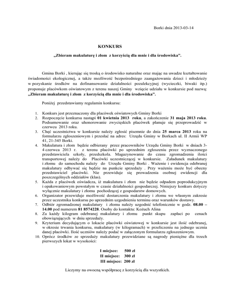 Borki dnia 2013-03-14 KONKURS „Zbieram makulaturę i złom z korzyścią dla mnie i dla środowiska”. Gmina Borki , kierując się troską o środowisko naturalne oraz mając na uwadze kształtowanie świadomości ekologicznej, a także możliwość bezpośredniego zaangażowania dzieci i młodzieży w pozyskanie środków na dofinansowanie działalności pozalekcyjnej (wycieczki, biwaki itp.) proponuje placówkom oświatowym z terenu naszej Gminy wzięcie udziału w konkursie pod nazwą: „Zbieram makulaturę i złom z korzyścią dla mnie i dla środowiska”. Poniżej przedstawiamy regulamin konkursu: 1. 2. 3. 4. 5. 6. 7. 8. 9. 10. Konkurs jest przeznaczony dla placówek oświatowych Gminy Borki Rozpoczęcie konkursu nastąpi 01 kwietnia 2013 roku, a zakończenie 31 maja 2013 roku. Podsumowanie oraz uhonorowanie zwycięskich placówek planuje się przeprowadzić w czerwcu 2013 roku. Chęć uczestnictwa w konkursie należy zgłosić pisemnie do dnia 25 marca 2013 roku na formularzu zgłoszeniowym i przesłać na adres: Urzędu Gminy w Borkach ul. II Armii WP 41, 21-345 Borki. Makulatura i złom będzie odbierany przez pracowników Urzędu Gminy Borki w dniach 34 czerwca 2013 r. z terenu placówki po uprzednim zgłoszeniu przez wyznaczonego przedstawiciela szkoły, przedszkola. Magazynowanie do czasu zgromadzenia ilości transportowej należy do Placówki uczestniczącej w konkursie. Załadunek makulatury i złomu do samochodu należy do Urzędu Gminy Borki . Ważenie i ewidencja odebranej makulatury odbywać się będzie na punkcie sprzedaży . Przy ważeniu może być obecny przedstawiciel placówki. Nie przewiduje się prowadzenia osobnej ewidencji dla poszczególnych oddziałów (klas). Każda z placówek oświadcza, iż makulatura i złom nie będzie odpadem poprodukcyjnym i opakowaniowym powstałym w czasie działalności gospodarczej. Niniejszy konkurs dotyczy wyłącznie makulatury i złomu pochodzącej z gospodarstw domowych. Organizator przewiduje możliwość dostarczenia makulatury i złomu we własnym zakresie przez uczestnika konkursu po uprzednim uzgodnieniu terminu oraz warunków dostawy. Odbiór zgromadzonej makulatury i złomu należy uzgodnić telefonicznie w godz. 08.00 – 14.00 pod numerem 81 8574228. Osoby do kontaktu: Kożuch Alina Za każdy kilogram odebranej makulatury i złomu punkt skupu zapłaci po cenach obowiązujących w dniu sprzedaży. Kryterium decydującym o lokacie placówki oświatowej w konkursie jest ilość odebranej, w okresie trwania konkursu, makulatury (w kilogramach) w przeliczeniu na jednego ucznia danej placówki. Ilość uczniów należy podać w załączonym formularzu zgłoszeniowym. Oprócz środków ze sprzedaży makulatury przewidziane są nagrody pieniężne dla trzech pierwszych lokat w wysokości: I miejsce: 500 zł II miejsce: 300 zł III miejsce: 200 zł Liczymy na owocną współpracę z korzyścią dla wszystkich. FORMULARZ ZGŁOSZENIOWY DO KONKURSU NA ZBIÓRKĘ MAKULATURY I ZŁOMU NAZWA I ADRES PLACÓWKI OŚWIATOWEJ ( LUB PIECZĄTKA) OSOBA NADZORUJĄCA KONKURS Z RAMIENIA PLACÓWKI TELEFON KONTAKTOWY LOŚĆ UCZNIÓW W PLACÓWCE * *Oświadczam, że podana ilość obejmuje wszystkich uczniów w/w placówki oświatowej i jest zgodna ze stanem faktycznym w dniu wypełnienia formularza. Podpisanie niniejszego formularza oznacza akceptację regulaminu konkursu. Data ………………………. …………………………………….. ( PODPIS DYREKTORA SZKOŁY)