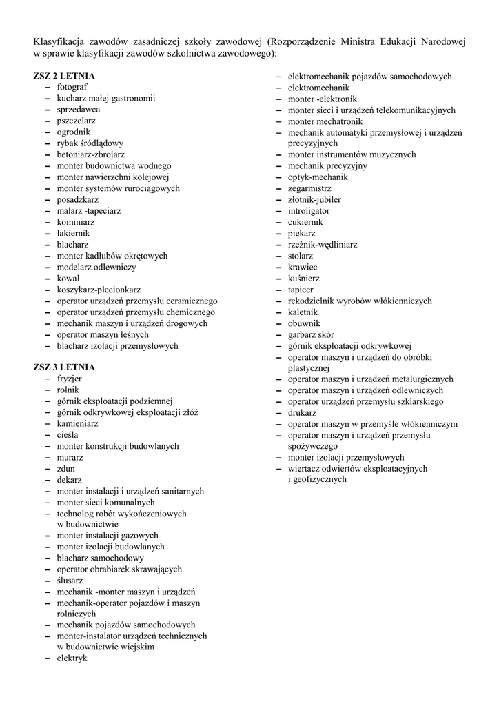 Klasyfikacja zawodów zasadniczej szkoły zawodowej (Rozporządzenie Ministra Edukacji Narodowej w sprawie klasyfikacji zawodów szkolnictwa zawodowego): ZSZ 2 LETNIA − fotograf − kucharz małej gastronomii − sprzedawca − pszczelarz − ogrodnik − rybak śródlądowy − betoniarz-zbrojarz − monter budownictwa wodnego − monter nawierzchni kolejowej − monter systemów rurociągowych − posadzkarz − malarz -tapeciarz − kominiarz − lakiernik − blacharz − monter kadłubów okrętowych − modelarz odlewniczy − kowal − koszykarz-plecionkarz − operator urządzeń przemysłu ceramicznego − operator urządzeń przemysłu chemicznego − mechanik maszyn i urządzeń drogowych − operator maszyn leśnych − blacharz izolacji przemysłowych ZSZ 3 LETNIA − fryzjer − rolnik − górnik eksploatacji podziemnej − górnik odkrywkowej eksploatacji złóż − kamieniarz − cieśla − monter konstrukcji budowlanych − murarz − zdun − dekarz − monter instalacji i urządzeń sanitarnych − monter sieci komunalnych − technolog robót wykończeniowych w budownictwie − monter instalacji gazowych − monter izolacji budowlanych − blacharz samochodowy − operator obrabiarek skrawających − ślusarz − mechanik -monter maszyn i urządzeń − mechanik-operator pojazdów i maszyn rolniczych − mechanik pojazdów samochodowych − monter-instalator urządzeń technicznych w budownictwie wiejskim − elektryk − − − − − − − − − − − − − − − − − − − − − − − − − − − − − − − − − elektromechanik pojazdów samochodowych elektromechanik monter -elektronik monter sieci i urządzeń telekomunikacyjnych monter mechatronik mechanik automatyki przemysłowej i urządzeń precyzyjnych monter instrumentów muzycznych mechanik precyzyjny optyk-mechanik zegarmistrz złotnik-jubiler introligator cukiernik piekarz rzeźnik-wędliniarz stolarz krawiec kuśnierz tapicer rękodzielnik wyrobów włókienniczych kaletnik obuwnik garbarz skór górnik eksploatacji odkrywkowej operator maszyn i urządzeń do obróbki plastycznej operator maszyn i urządzeń metalurgicznych operator maszyn i urządzeń odlewniczych operator urządzeń przemysłu szklarskiego drukarz operator maszyn w przemyśle włókienniczym operator maszyn i urządzeń przemysłu spożywczego monter izolacji przemysłowych wiertacz odwiertów eksploatacyjnych i geofizycznych
