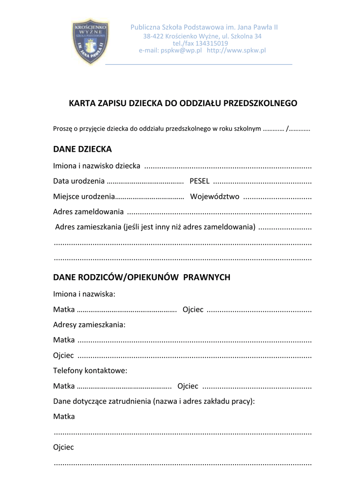 Publiczna Szkoła Podstawowa im. Jana Pawła II 38-422 Krościenko Wyżne, ul. Szkolna 34 tel./fax 134315019 e-mail: [email protected] http://www.spkw.pl KARTA ZAPISU DZIECKA DO ODDZIAŁU PRZEDSZKOLNEGO Proszę o przyjęcie dziecka do oddziału przedszkolnego w roku szkolnym ……….… /…………. DANE DZIECKA Imiona i nazwisko dziecka .............................................................................. Data urodzenia …………………………………. PESEL .............................................. Miejsce urodzenia……………………………… Województwo ................................ Adres zameldowania ...................................................................................... Adres zamieszkania (jeśli jest inny niż adres zameldowania) ......................... ........................................................................................................................ ........................................................................................................................ DANE RODZICÓW/OPIEKUNÓW PRAWNYCH Imiona i nazwiska: Matka ……………………………………………. Ojciec ................................................. Adresy zamieszkania: Matka ............................................................................................................. Ojciec ............................................................................................................. Telefony kontaktowe: Matka ……………..………………………….. Ojciec ................................................... Dane dotyczące zatrudnienia (nazwa i adres zakładu pracy): Matka ........................................................................................................................ Ojciec ........................................................................................................................ OŚWIADCZENIE RODZICÓW/ PRAWNYCH OPIEKUNÓW 1. Podane w karcie informacje są zgodne ze stanem faktycznym. 2. Akceptuję statut szkoły, obowiązujące w niej procedury i regulaminy. 3. Deklaruję, że moje dziecko będzie/ nie będzie (niepotrzebne skreślid) uczestniczyd w zajęciach religii katolickiej. 4. Deklaruję, że moje dziecka będzie/ nie będzie (niepotrzebne skreślid) korzystało ze świetlicy szkolnej. 5. Wyrażam zgodę/nie wyrażam zgody (niepotrzebne skreślid) na udział mojego dziecka w dodatkowych płatnych zajęciach (np. język angielski) organizowanych w oddziale przedszkolnym. 6. Wyrażam zgodę/ nie wyrażam zgody (niepotrzebne skreślid) na publikację imienia i nazwiska oraz zdjęd mojego dziecka na stronie internetowej szkoły. 7. Przyprowadzał i odbierał dziecko z oddziału przedszkolnego będzie ............................ .......................................................................................................................................... 8. Wyrażam zgodę na przetwarzanie danych osobowych zawartych w niniejszym formularzu dla potrzeb procesu rekrutacji (zgodnie z ustawą o ochronie danych osobowych z dnia 29.08.1997 Dz.U.Nr 133, pozycja 883 z późn. zm.) Krościenko Wyżne, ...................................................... ....................................................................... podpis rodziców INFORMACJA MEDYCZNA 1. Wyrażam zgodę/ nie wyrażam zgody (niepotrzebne skreślid) na udzielanie pierwszej pomocy przedmedycznej 2. Czy dziecko jest uczulone na leki ? …………………. Jeśli tak to jakie ? ............................................................................................................. 3. Czy dziecko przyjmuje stale jakieś leki ? ………………. Jeśli tak to jakie ? ............................................................................................................. Zgody, które wyrażają lub nie wyrażają rodzice obowiązują na cały cykl nauki dziecka w szkole. W przypadku zmiany decyzji rodzic zobowiązany jest powiadomid o tym fakcie wychowawcę klasy. Krościenko Wyżne, ...................................................... ....................................................................... podpis rodziców