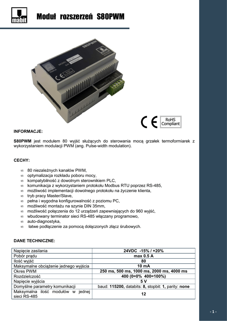 Moduł rozszerzeń S80PWM INFORMACJE: S80PWM jest modułem 80 wyjść służących do sterowania mocą grzałek termoformiarek z wykorzystaniem modulacji PWM (ang. Pulse-width modulation). CECHY: • • • • • • • • • • • • 80 niezależnych kanałów PWM, optymalizacja rozkładu poboru mocy, kompatybilność z dowolnym sterownikiem PLC, komunikacja z wykorzystaniem protokołu Modbus RTU poprzez RS-485, możliwość implementacji dowolnego protokołu na życzenie klienta, tryb pracy Master/Slave, pełna i wygodna konfigurowalność z poziomu PC, możliwość montażu na szynie DIN 35mm, możliwość połączenia do 12 urządzeń zapewniających do 960 wyjść, wbudowany terminator sieci RS-485 włączany programowo, auto-diagnostyka, łatwe podłączenie za pomocą dołączonych złącz śrubowych. DANE TECHNICZNE: Napięcie zasilania Pobór prądu Ilość wyjść Maksymalne obciążenie jednego wyjścia Okres PWM Rozdzielczość Napięcie wyjścia Domyślne parametry komunikacji Maksymalna ilość modułów w jednej sieci RS-485 24VDC -15% / +20% max 0.5 A 80 10 mA 250 ms, 500 ms, 1000 ms, 2000 ms, 4000 ms 400 (0=0% 400=100%) 5V baud: 115200, databits: 8, stopbit: 1, parity: none 12 -1- PRZYKŁAD POŁĄCZENIA: DANE MECHANICZNE: Pracownia Automatyki Przemysłowej MABIT ul. Wielicka 25 30-552 Kraków Polska www.mabit.pl [email protected] tel: (+48) 502136623 fax: (+48) 12 350 47 86 -2-