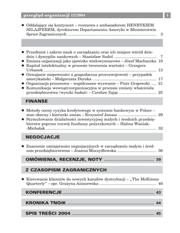 przegląd organizacji 12/2004 Oddalający się kontynent – rozmowa z ambasadorem HENRYKIEM SZLAJFEREM, dyrektorem Departamentu Ameryki w Ministerstwie Spraw Zagranicznych ................................................................................ Przedmiot i zakres nauk o zarządzaniu oraz ich miejsce wśród dziedzin i dyscyplin naukowych – Stanisław Sudoł ...................................... Zmiana organizacji jako zjawisko wielowymiarowe – Józef Machaczka Kapitał intelektualny w procesie tworzenia wartości – Grzegorz Urbanek ..................................................................................................... Oswajanie niepewności a gospodarcza prorozwojowość – przypadek amerykański – Małgorzata Durska ......................................................... Organizacja procesowa – współczesne wyzwanie – Piotr Grajewski ..... Komunikacja wewnątrzorganizacyjna w procesie zmiany właściciela przedsiębiorstwa (wyniki badań) – Czesław Zając ................................. 1 3 7 10 13 17 21 25 FINANSE Metody oceny ryzyka kredytowego w systemie bankowym w Polsce – stan obecny i kierunki zmian – Krzysztof Janasz .................................. 29 Stymulowanie działalności inwestycyjnej małych i średnich przedsiębiorstw poprzez rozwój funduszy pożyczkowych – Halina Waniak-Michalak ................................................................................................... 32 NEGOCJACJE Znaczenie umiejętności negocjacyjnych w zarządzaniu małym i średnim przedsiębiorstwem – Joanna Moczydłowska ................................... 36 OMÓWIENIA, RECENZJE, NOTY .......................................... 39 Z CZASOPISM ZAGRANICZNYCH Kierowanie klientów do nowych kanałów dystrybucji – „The McKinsey Quarterly” – opr. Grażyna Aniszewska ................................................... 40 KONFERENCJE .............................................................................. 43 KRONIKA TNOiK ......................................................................... 44 SPIS TREŚCI 2004 ..................................................................... 45 2 przegląd PRENUMERATA MIESIĘCZNIK TNOiK ZAŁOŻYŁ KAROL ADAMIECKI w 1926 r. NR 12 (779) 2004 CZY PAMIĘTAJĄ PAŃSTWO O PRENUMERACIE „PRZEGLĄDU ORGANIZACJI” Rada Programowa: dr Grażyna Aniszewska, dr Mieczysław Ciurla, prof. Zbigniew Dworzecki, prof. Bogdan Nogalski, prof. Janusz Pyka Prenumerata: Renata Jaworska Korekta: Jarosław Lendzion Adres redakcji: ul. Boduena 4 m. 22 00-011 Warszawa tel./faks 827-15-10 e-mail: [email protected] [email protected] Wydawca: Towarzystwo Naukowe Organizacji i Kierownictwa Indeks: ISSN-0137-7221. Nakład nie przekracza 15 tys. Łamanie: STAND’s, tel. 757-38-02 Montaż i druk: EFEKT, Warszawa ul. Lubelska 30/32 Redakcja nie odpowiada za treść ogłoszeń, nie płaci za nie zamówione materiały i nie zwraca ich oraz zastrzega sobie prawo do zmiany tytułów i skracania tekstów. Prenumerata w „RUCH” SA Prenumerata krajowa: Przez „RUCH” SA – wpłaty na prenumeratę przyjmują jednostki kolportażowe „RUCH” SA właściwe dla miejsca zamieszkania. Termin przyjmowania wpłat na prenumeratę krajową do 5 każdego miesiąca poprzedzającego okres rozpoczęcia prenumeraty. W internecie http://www.prenumerata.ruch.com.pl q uf u y Korespondenci: Białystok – tel. 654-52-46 mgr Julita Nowakowska; Bydgoszcz – tel. 341-27-06 dr Andrzej Chajęcki; Częstochowa – tel. 324-34-76, tel./fax 324-55-36 dr Edward Jędrzejewski; Gdańsk – tel. 341-93-70, 341-45-11 mgr Wanda Stankiewicz; Gorzów Wlkp. – tel./fax 722-75-23 mgr inż. Aleksy Wołoszyn; Katowice – tel. 258-16-06 dr inż. Krzysztof Pałucha; Kraków – tel. 633-40-82, dr Andrzej Jaki; Lublin – tel. 532-99-18 prof. dr hab. Ewa Bojar; Opole – tel. 454-41-07 dr Stanisław Grycner; Radom – tel. 362-56-63 Bożena Makowska; Rzeszów – tel. 86-36-398 dr hab. Jan Łukasiewicz; Toruń – tel. 622-29-98 mgr Bronisław Stawicki; Zielona Góra – tel. 327-00-99, tel./fax 327-14-47 mgr inż. Artur Kot Prenumerata opłacana w dewizach przez odbiorcę z zagranicy: przelewem na nasze konto w banku w USD – PEKAO SA IV O/W-wa 54124010531787000004430508 w EUR – PEKAO SA IV O/W-wa 46124010531978000004430511 po dokonaniu przelewu prosimy o przesłanie kserokopii polecenia przelewu z podaniem adresu i tytułu pod nr faksu +48 (22) 532-87-32. Opłaty za prenumeratę można dokonać również czekiem wystawionym na firmę „RUCH SA OKDP” i przesłanym razem z zamówieniem, listem poleconym na nasz adres jak wyżej. Informujemy, że klienci płacący z zagranicy mogą też dokonać wpłaty na prenumeratę kartami kredytowymi VISA i MASTERCARD w internecie http://www.ruch.pol.pl u f w f yu Wszystkiego Najlepszego t z okazji Świąt Bożego Narodzenia f i Wszelkiej Pomyślności w Nowym Roku w f u q y naszym Czytelnikom i Autorom życzy Redakcja f Kolegium Redakcyjne: Zamówienia przyjmujemy w dowolnym terminie na dowolny okres, przy czym prenumeratę automatycznie przedłużamy. Aby zamówić prenumeratę „Przeglądu”, wystarczy uiścić odpowiednią opłatę na konto: Redakcja „Przeglądu Organizacji”, Bank Millennium SA, IV O/Warszawa nr 85 1160 2202 0000 0000 5515 9488. Na odwrocie przekazu (na przelewie) prosimy podać dokładny adres zamawiającego, liczbę zamawianych egzemplarzy oraz okres, za jaki opłata jest wnoszona. Fakturę na przelaną kwotę redakcja wyśle razem z najbliższym numerem. Fakturę na prenumeratę automatycznie przedłużoną – osobnym listem poleconym. Cena prenumeraty na 2005 r.: – kwartalna – 57 zł, – półroczna – 114 zł, – całoroczna – 228 zł. Opłata za prenumeratę ze zleceniem wysyłki za granicę jest o 100% wyższa. Opłaty pocztowe wliczone są zarówno w cenę prenumeraty krajowej, jak i zagranicznej. Prenumerata opłacana w złotówkach ze zleceniem wysyłki za gran