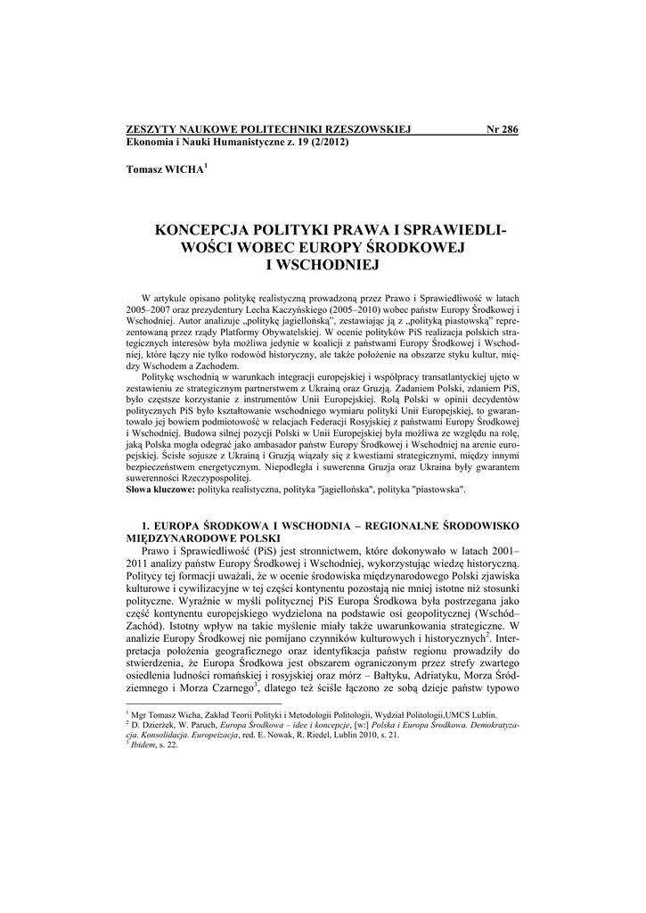 ZESZYTY NAUKOWE POLITECHNIKI RZESZOWSKIEJ Ekonomia i Nauki Humanistyczne z. 19 (2/2012) Nr 286 Tomasz WICHA1 KONCEPCJA POLITYKI PRAWA I SPRAWIEDLIWOŚCI WOBEC EUROPY ŚRODKOWEJ I WSCHODNIEJ W artykule opisano politykę realistyczną prowadzoną przez Prawo i Sprawiedliwość w latach 2005–2007 oraz prezydentury Lecha Kaczyńskiego (2005–2010) wobec państw Europy Środkowej i Wschodniej. Autor analizuje „politykę jagiellońską”, zestawiając ją z „polityką piastowską” reprezentowaną przez rządy Platformy Obywatelskiej. W ocenie polityków PiS realizacja polskich strategicznych interesów była możliwa jedynie w koalicji z państwami Europy Środkowej i Wschodniej, które łączy nie tylko rodowód historyczny, ale także położenie na obszarze styku kultur, między Wschodem a Zachodem. Politykę wschodnią w warunkach integracji europejskiej i współpracy transatlantyckiej ujęto w zestawieniu ze strategicznym partnerstwem z Ukrainą oraz Gruzją. Zadaniem Polski, zdaniem PiS, było częstsze korzystanie z instrumentów Unii Europejskiej. Rolą Polski w opinii decydentów politycznych PiS było kształtowanie wschodniego wymiaru polityki Unii Europejskiej, to gwarantowało jej bowiem podmiotowość w relacjach Federacji Rosyjskiej z państwami Europy Środkowej i Wschodniej. Budowa silnej pozycji Polski w Unii Europejskiej była możliwa ze względu na rolę, jaką Polska mogła odegrać jako ambasador państw Europy Środkowej i Wschodniej na arenie europejskiej. Ścisłe sojusze z Ukrainą i Gruzją wiązały się z kwestiami strategicznymi, między innymi bezpieczeństwem energetycznym. Niepodległa i suwerenna Gruzja oraz Ukraina były gwarantem suwerenności Rzeczypospolitej. Słowa kluczowe: polityka realistyczna, polityka "jagiellońska", polityka "piastowska". 1. EUROPA ŚRODKOWA I WSCHODNIA – REGIONALNE ŚRODOWISKO MIĘDZYNARODOWE POLSKI Prawo i Sprawiedliwość (PiS) jest stronnictwem, które dokonywało w latach 2001– 2011 analizy państw Europy Środkowej i Wschodniej, wykorzystując wiedzę historyczną. Politycy tej formacji uważali, że w ocenie środowiska międzynarodowego Polski zjawiska kulturowe i cywilizacyjne w tej części kontynentu pozostają nie mniej istotne niż stosunki polityczne. Wyraźnie w myśli politycznej PiS Europa Środkowa była postrzegana jako część kontynentu europejskiego wydzielona na podstawie osi geopolitycznej (Wschód– Zachód). Istotny wpływ na takie myślenie miały także uwarunkowania strategiczne. W analizie Europy Środkowej nie pomijano czynników kulturowych i historycznych2. Interpretacja położenia geograficznego oraz identyfikacja państw regionu prowadziły do stwierdzenia, że Europa Środkowa jest obszarem ograniczonym przez strefy zwartego osiedlenia ludności romańskiej i rosyjskiej oraz mórz – Bałtyku, Adriatyku, Morza Śródziemnego i Morza Czarnego3, dlatego też ściśle łączono ze sobą dzieje państw typowo Mgr Tomasz Wicha, Zakład Teorii Polityki i Metodologii Politologii, Wydział Politologii,UMCS Lublin. D. Dzierżek, W. Paruch, Europa Środkowa – idee i koncepcje, [w:] Polska i Europa Środkowa. Demokratyzacja. Konsolidacja. Europeizacja, red. E. Nowak, R. Riedel, Lublin 2010, s. 21. 3 Ibidem, s. 22. 1 2 66 T. Wicha środkowoeuropejskich (Republika Czeska, Węgry, Polska) z sytuacją na terenach postradzieckich (państwa kaukaskie, Rosja, państwa bałtyckie). Poszukiwano wyznaczników polityki zagranicznej wobec całego regionu określanego jako Europa Środkowa i Wschodnia, a nie tylko wobec poszczególnych państw. Tożsamość regionu (jako region autor określa obszar między Morzem Czarnym a Morzem Bałtyckim) jest budowana na podstawie aspiracji decydentów politycznych, a także czynników kulturowych i historycznych, które należy zbadać, aby zrozumieć specyfikę ziem położonych na tym obszarze. Według PiS Europa Środkowa i Wschodnia miała istotne znaczenie nie tylko w sensie regionalnym, ale także w ujęciu kontynentalnym, a nawet powszechnym, władza nad tym terenem bowiem implikowała mocną pozycję w Europie, co skutkowało podniesieniem rangi oraz statusu poszczególnych państw europejskich. Teren Europy Środkowej stanowił obszar polsko-rosyjskich napięć, co skutkowało osłabieniem relacji bilateralnych oraz działaniami, które Polska i Rosja podejmowały wobec mniejszych państw regionu Europy Środkowej i Wschodniej. Taki splot czynników mocno eksponowano w myśleniu politycznym PiS. Zdaniem PiS, brak politycznej woli, aby zajmować się państwami Europy Środkowej i Wschodniej, może wpłynąć na ożywienie imperialnych aspiracji Federacji Rosyjskiej. Polska polityka wobec Wschodu powinna zostać zaktywizowana oraz wymaga konsensusu na wewnętrznej scenie politycznej w kwestii precyzyjnie zdefiniowanych interesów narodowych i racji stanu. Polska polityka wschodnia ma pozostać realistyczna, a jednocześnie zachować elementy idealizmu w stosunkach międzynarodowych4. Państwa Europy Środkowej i Wschodniej są terenem zróżnicowanym geograficznie, o różnej przeszłości historycznej oraz rozbieżnych formach organizacji społeczeństw. Badacze Europy Środkowej i Wschodniej, między innymi Charles Crawford, zauważyli, że to państwa znajdujące się pomiędzy wpływami krajów Wschodu i Zachodu5. Państwa Europy Środkowej i Wschodniej znajdują się między Niemcami a Rosją – państwami, odwiecznie rywalizującymi o dominację w Europie Środkowej i Wschodniej, z aspiracjami, aby siłę na arenie europejskiej przenosić na arenę globalną. Państwa Europy Środkowej i Wschodniej są terenami na granicy kultur Wschodu i Zachodu, co implikowało zróżnicowanie kulturowe oraz miało wpływ na podejmowane działania obywatelskie w regionie. Zróżnicowanie polityczne, a także społeczne regionu było warunkowane także kulturowo. W myśli politycznej PiS wyraźnie widać pogląd, że decydenci polityczni rządzący w państwac