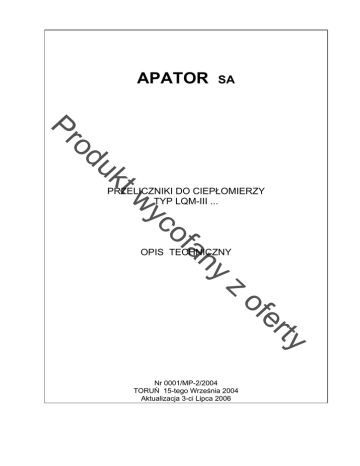 APATOR SA kt du o Pr of yc w PRZELICZNIKI DO CIEPŁOMIERZY TYP LQM-III ... y an OPIS TECHNICZNY z rty e of Nr 0001/MP-2/2004 TORUŃ 15-tego Września 2004 Aktualizacja 3-ci Lipca 2006 -1- kt du o Pr SPIS TREŚCI STRONA 1.Przedmiot instrukcji. ................................................................. 2 2.Przeznaczenie. ........................................................................... 2 3.Zgodność z normami. ................................................................ 2 4.Podstawowe dane techniczne przelicznika typu LQM-III... . ....... 2 5.Zasada działania. ........................................................................... 3 6.Rodzaje danych i obsługa ich wyświetlania. ................................. 4 6.1. Dane aktualne. ................................................................. 5 6.1.1. Suma energii cieplnej. ...................................................... 5 6.1.2. Suma objętości nośnika. ........................................... 5 6.1.3. Suma energii drugiej taryfy. ........................................... 5 6.1.4. Temperatury zasilania i powrotu, różnica temperatur, nieczułość różnicy. ...................................................... 5 6.1.5. Moc i przepływ. ............................................................... 5 6.1.6. Kod błędów. ................................................................ 6 6.1.7. Test metrologiczny. ...................................................... 6 6.2. Dane konfiguracyjne i serwisowe. ........................................... 7 6.2.1. Wejścia impulsowe i stałe impulsu. ................................ 7 6.2.2. Czas pracy, zegar czasu rzeczywistego. ...................... 7 6.2.3. Parametry rejestracji danych. ................................ 8 6.2.4. Prędkość transmisji, parzystość i numer użytkownika. .. 8 6.2.5. Napięcie baterii i numer wersji programu. ...................... 8 6.2.6. Młodsze cyfry sumy ciepła. ........................................... 8 6.2.7. Czas pracy niepoprawnej. ........................................... 8 6.2.8. Progi do obliczeń drugiej taryfy ciepła. ........................... 8 6.2.9. Miejsce montażu przetwornika przepływu. ..................... 9 6.2.10.Numer sieciowy. ................................................................ 9 6.3. Dane za okres obliczeniowy. ...................................................... 9 6.4. Dane archiwizowane. ................................................................ 9 6.4.1. Dane godzinne. ................................................................ 10 6.4.2. Dane dobowe. ................................................................. 10 6.4.3. Dane miesięczne i roczne. ........................................... 10 6.5. Wielkości ustawialne. ................................................................ 11 7. Obsługa wyświetlania. ................................................................. 12 7.1. Przewodnik po menu wyświetlania. ........................................... 13 7.2. Tryb podstawowy – dane aktualne. ........................................... 15 7.3. FLo - tryb serwisowy – dane ogólne. ........................................... 15 7.4. FL0 – przejście do FL1 –FL7. ........................................... 17 7.5. FL1 – parametry za okres (ustawialny – standardowo 1 godzina). 17 7.6. FL2 - tryb serwisowy – dane konkretnego układu. ........... 18 7.7. FL3 – dane godzinne. ................................................................ 18 7.8. FL4 – dane dobowe. ................................................................ 19 7.9. FL5,FL6 – dane miesięczne i roczne. ................................ 20 7.10. FL7 – wyjście z archiwum danych. ........................................... 22 8. Zdalny odczyt danych. ................................................................ 22 9. Transport, montaż i podłączanie przewodów. ................................ 22 9.1.Plombowanie. .......................................................................... 25 10. Zakłócenia elektryczne. ................................................................ 25 11. Kontrola okresowa, konserwacja i wymiana baterii. ........... 26 12. Gwarancja. ..................................................................................... 26 13. Sposób oznaczania. ................................................................ 27 y an of yc w z rty e of 1 -2- 1. Przedmiot instrukcji. Niniejsza instrukcja obsługi ma na celu zapoznanie użytkowników z właściwościami, parametrami i obsługą przelicznika LQM-III... do ciepłomierzy. 2. Przeznaczenie. o Pr Przeliczniki typu LQM-III ... przeznaczone są do pomiaru zużycia energii cieplnej pobieranej z sieci cieplnych poprzez węzły cieplne o mocy cieplnej od 100 W do 100 MW, w których czynnikiem grzewczym jest woda. Przeliczniki te są częścią ciepłomierzy składanych, w skład których wchodzą ponadto: - przetwornik przepływu z nadajnikiem impulsów, - para czujników temperatury typu Pt 500 wraz z osłonami. 3. kt 4. PN-EN 1434 części 1 do 6, PN-EN 61107, znak typu PLT 05127. du - Zgodność z normami. Podstawowe dane techniczne przelicznika typu LQM-III... . Symbol Jednostka Wartość GJ 0.001 do 1 Qe MWh 0.001 do 0.1 3 Ve m 0.001 do 1 t °C od 1 do 180 of yc w Wielkość Jednostka energii cieplnej (liczydło główne zawiera 8 cyfr) Jednostka objętości nośnika Zakres temperatury nośnika ∆t °C Graniczny błąd dopuszczalny Zakres mocy EI Pp Zakres przepływu Napięcie zasilania Qd Uz % kW MW m3/h V Czas pracy baterii -- rok Stopień ochrony IEC-529 IP -- Temperatura otoczenia ta °C Wilgotność względna powietrza W % Zakres różnicy temperatur od 3 do 160 y an z ±(0.5+3/∆t) 1 – 999 0,01 – 99,99 0,001 – 9999 3,6 e of 5 IP-54 od 5 do 55 rty < 90 Dopuszcza się sterowanie wejścia impulsowego przelicznika: - zestykiem bezpotencjałowym, - kluczem 