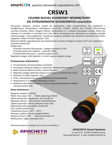 smartLEDs sprytne sterowniki oświetlenia LED CRSW1 CZUJNIK RUCHU SCHODOWY WEWNĘTRZNY DO STEROWNIKÓW SCHODOWYCH smartLEDs Precyzyjny, aktywny, cyfrowy czujnik do wykrywania osób, przystosowany do współpracy z inteligentnymi sterownikami schodowymi smartLEDs: S19LED, S16LED oraz S11LED. Miniaturowe rozmiary (średnica 18mm, długość 50mm). Wyposażony w 2 nakrętki ułatwiające montaż. Może być używany na schodach o szerokości do 1,3m (zakres pomiarowy jest regulowany za pomocą pokrętła umieszczonego z tyłu urządzenia). Czujnik jest zasilany, podobnie jak wszystkie sterowniki smartLEDs, napięciem stałym 8-14VDC (typowo: 12V). Wykrycie obiektu sygnalizowane jest pojawieniem się stanu niskiego na wyjściu OUT oraz zapaleniem czerwonej diody LED. Podłączenie: Przewód czerwony lub brązowy - napięcie zasilania (+12V) Przewód zielony lub niebieski - masa (0V, GND) Przewód żółty lub czarny - cyfrowe wyjście (OUT) Regulacja zasięgu: obrót zgodnie z ruchem zegara zwiększa zasięg Podstawowe właściwości:         Przystosowany do sterowników smartLEDs Precyzyjnie wykrywa obiekty w ustalonym zakresie pomiarowym Małe rozmiary (18mm średnicy, 50mm długości) Regulacja zasięgu (wykrywa osoby na schodach o szerokości do 1,3m) Zasilanie: 8-14VDC (typowo 12V) Cichy i niezawodny (nie zawiera hałaśliwych przekaźników) Wyposażony w 2 nakrętki ułatwiające montaż Możliwość weryfikacji działania czujnika (sygnalizacja wykrycia obiektu czerwona dioda LED) Dane techniczne: Napięcie zasilania: 8-14VDC Pobór mocy (typ): 1W Pobór prądu (typ): 80mA Zakres pomiarowy regulowany: od 3 do 80 cm Regulacja zakresu - potencjometr wieloobrotowy Sygnał wyjściowy: cyfrowy (aktywny stan niski) Sygnalizacja wykrycia obiektu: dioda LED Czas reakcji: poniżej 2 ms Temperatura pracy: -10°C - +45°C Wymiary: średnica 18 mm, długość 50mm Stopień ochrony: IP20 Klasa ochronności: III Rodzaj pracy: ciągła, wewnątrz pom. Deklaracja zgodności znajduje się na stronie smartLEDs.pl APACHETA Smart Systems ul. Sarnia 41 05-807 Podkowa Leśna www.apacheta.pl e-mail: [email protected]