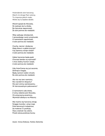 Holenderski zlot harcerzy, Niech mi droga Pani wierzy, To impreza jakich mało, Wiele się tu będzie działo. Mówił sąsiad do Nowaka, Że szykuje się tu draka, Bo harcerze zapomnieli, Że zlot potrwa do niedzieli. Więc pakując ekwipunek, I sprawdzając swój rynsztunek, O namiotach zapomnieli, A zlot potrwa do niedzieli. Ciuchy, żarcie i słodycze, Mają skauci-a gdzie prycze? Czy śpiwory swoje wzięli? A zlot potrwa do niedzieli. Gdzie harcerze będą spali, Chociaż bardzo są wytrwali? I choć dobry humor wzięli, A zlot potrwa do niedzieli. Gdy InterCamp się już zacznie, Zerknął w bagaż, Będą namiot rozbić chcieli, Bo zlot potrwa do niedzieli. Ale nie ma tam namiotu, Kto narobił im kłopotu? Kto jest winny zamieszaniu, W nierozważnym pakowaniu? Z namiotami cała draka, Z winy właśnie jest Nowaka, On przyczyną awantury, Wywiózł zdobycz na Mazury. Nie martw się harcerzu drogi, Ściągaj mundur, umyj nogi, Pole barwnych tulipanów, Za materac Ci posłuży, Stary wiatrak Cię osłoni, Przed ulewą podczas burzy. Autor: Anna Dobosz, Hufiec Zielonka