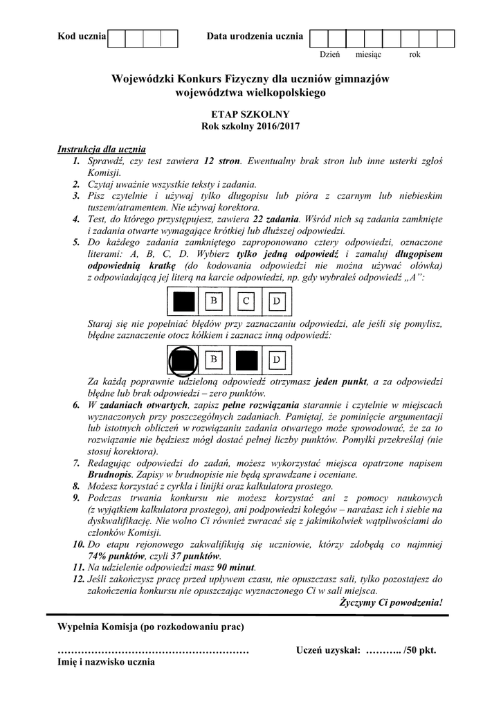 Kod ucznia Data urodzenia ucznia Dzień miesiąc rok Wojewódzki Konkurs Fizyczny dla uczniów gimnazjów województwa wielkopolskiego ETAP SZKOLNY Rok szkolny 2016/2017 Instrukcja dla ucznia 1. Sprawdź, czy test zawiera 12 stron. Ewentualny brak stron lub inne usterki zgłoś Komisji. 2. Czytaj uważnie wszystkie teksty i zadania. 3. Pisz czytelnie i używaj tylko długopisu lub pióra z czarnym lub niebieskim tuszem/atramentem. Nie używaj korektora. 4. Test, do którego przystępujesz, zawiera 22 zadania. Wśród nich są zadania zamknięte i zadania otwarte wymagające krótkiej lub dłuższej odpowiedzi. 5. Do każdego zadania zamkniętego zaproponowano cztery odpowiedzi, oznaczone literami: A, B, C, D. Wybierz tylko jedną odpowiedź i zamaluj długopisem odpowiednią kratkę (do kodowania odpowiedzi nie można używać ołówka) z odpowiadającą jej literą na karcie odpowiedzi, np. gdy wybrałeś odpowiedź „A”: Staraj się nie popełniać błędów przy zaznaczaniu odpowiedzi, ale jeśli się pomylisz, błędne zaznaczenie otocz kółkiem i zaznacz inną odpowiedź: Za każdą poprawnie udzieloną odpowiedź otrzymasz jeden punkt, a za odpowiedzi błędne lub brak odpowiedzi – zero punktów. 6. W zadaniach otwartych, zapisz pełne rozwiązania starannie i czytelnie w miejscach wyznaczonych przy poszczególnych zadaniach. Pamiętaj, że pominięcie argumentacji lub istotnych obliczeń w rozwiązaniu zadania otwartego może spowodować, że za to rozwiązanie nie będziesz mógł dostać pełnej liczby punktów. Pomyłki przekreślaj (nie stosuj korektora). 7. Redagując odpowiedzi do zadań, możesz wykorzystać miejsca opatrzone napisem Brudnopis. Zapisy w brudnopisie nie będą sprawdzane i oceniane. 8. Możesz korzystać z cyrkla i linijki oraz kalkulatora prostego. 9. Podczas trwania konkursu nie możesz korzystać ani z pomocy naukowych (z wyjątkiem kalkulatora prostego), ani podpowiedzi kolegów – narażasz ich i siebie na dyskwalifikację. Nie wolno Ci również zwracać się z jakimikolwiek wątpliwościami do członków Komisji. 10. Do etapu rejonowego zakwalifikują się uczniowie, którzy zdobędą co najmniej 74% punktów, czyli 37 punktów. 11. Na udzielenie odpowiedzi masz 90 minut. 12. Jeśli zakończysz pracę przed upływem czasu, nie opuszczasz sali, tylko pozostajesz do zakończenia konkursu nie opuszczając wyznaczonego Ci w sali miejsca. Życzymy Ci powodzenia! Wypełnia Komisja (po rozkodowaniu prac) ………………………………………………… Imię i nazwisko ucznia Uczeń uzyskał: ……….. /50 pkt. ETAP SZKOLNY Wojewódzki Konkurs Fizyczny dla uczniów gimnazjów województwa wielkopolskiego Przyjmij w zadaniach: • wartość przyspieszenia ziemskiego 10 m , s2 • gęstość wody 1000 kg , m3 • ciśnienie atmosferyczne 1013 hPa, CZĘŚĆ I Zadanie 1. (0-1p.) Ze stołu spada strącona książka. Jej energia A. kinetyczna maleje, B. potencjalna grawitacji jest stała, C. mechaniczna rośnie, D. potencjalna grawitacji maleje. Zadanie 2. (0-1p.) Ciśnienie wywierane przez ciecz wypełniającą całkowicie naczynie na jego płaskie dno nie zależy od A. kształtu naczynia, B. wysokości naczynia, C. gęstości cieczy, D. wysokości słupa cieczy. Zadanie 3. (0-1p.) Cztery nieruchome ciała zaczęły poruszać się pod wpływem wypadkowych sił o takich samych wartościach. Po upływie 10 s największą prędkość uzyskało ciało o masie A. 50000 mg, B. 2000 g, C. 750 g, D. 1 kg . Zadanie 4. (0-1p.) Cegła ma wymiary 25 × 12 × 6,5 cm. Nacisk jaki wywiera cegła na podłoże jest A. największy gdy leży na boku o wymiarach 25 × 12 cm, B. największy gdy leży na boku o wymiarach 12 × 6,5 cm, C. największy gdy leży na boku o wymiarach 25 × 6,5 cm, D. taki sam na każdym z boków. Zadanie 5. (0-1p.) Drewniana skrzynia jest przyciągana przez Ziemię siłą 200 N. Siła jaką skrzynia przyciąga Ziemię jest A. trochę mniejsza niż 200 N, B. trochę większa niż 200 N, C. równa 200 N, D. równa 0 N. Strona 2 z 12 ETAP SZKOLNY Wojewódzki Konkurs Fizyczny dla uczniów gimnazjów województwa wielkopolskiego Zadanie 6. (0-1p.) Szybkość dźwięku w powietrzu wynosi 340 m . Jeśli znajdujesz się w odległości 1,53 km s od dzwonnicy to dźwięk dzwonu usłyszysz po 1 s , A. 9 B. 0,22 s, 2 s , C. 9 D. 4,5 s . Zadanie 7. (0-1p.) W czasie drgań wahadła, gdy pominiemy opory ruchu, jego energia mechaniczna A. ma wartość zero w położeniu równowagi, B. podczas całego ruchu jest taka sama, C. ma największą wartość w punktach maksymalnego wychylenia , D. zmienia się cyklicznie. Zadanie 8. (0-1p.) Jeśli do ogrzania o 40 ºC ciała o masie 5 kg potrzeba 0,18 MJ ciepła, to oznacza to, że ciepło właściwe substancji z której wykonano to ciało wynosi J A. 9000 , kg⋅ºC J B. 900 , kg⋅ºC J C. 4500 , kg⋅ºC J D. 450 . kg⋅ºC Zadanie 9. (0-1p.) Prostopadłościan o wymiarach 1 cm × 1 cm × 5 mm wypełniony jest w całości cieczą. Powstały z tej cieczy podczas wrzenia gaz wypełnia prostopadłościan o wymiarach 10 cm × 10 cm × 4 cm. Objętość gazu w porównaniu z objętością cieczy jest A. 800 razy większa, B. 125 razy większa, C. 80 razy większa, D. 12,5 razy większa. Zadanie 10. (0-1p.) Najwyższym dźwiękiem jaki może słyszeć większość ludzi jest dźwięk o częstotliwości 20 kHz. Zakładając, że prędkość rozchodzenia się dźwięku w powietrzu wynosi 340 m/s możemy stwierdzić, że długość fali akustycznej o tej częstotliwości wynosi: A. 6800 m, B. 17 m, C. 6,8 m, D. 0,017 m. Strona 3 z 12 ETAP SZKOLNY Wojewódzki Konkurs Fizyczny dla uczniów gimnazjów województwa wielkopolskiego CZĘŚĆ II Pamiętaj aby w zadaniach rachunkowych wypisać dane i szukane, zapisać wszystkie wzory z których korzystasz, obliczenia oraz odpowiedź. Zadanie 11. (0 – 3p.) Na ciało o masie 20 kg działają dwie siły o tym samym kierunku lecz o przeciwnych zwrotach. Pierwsza o wartości 200 