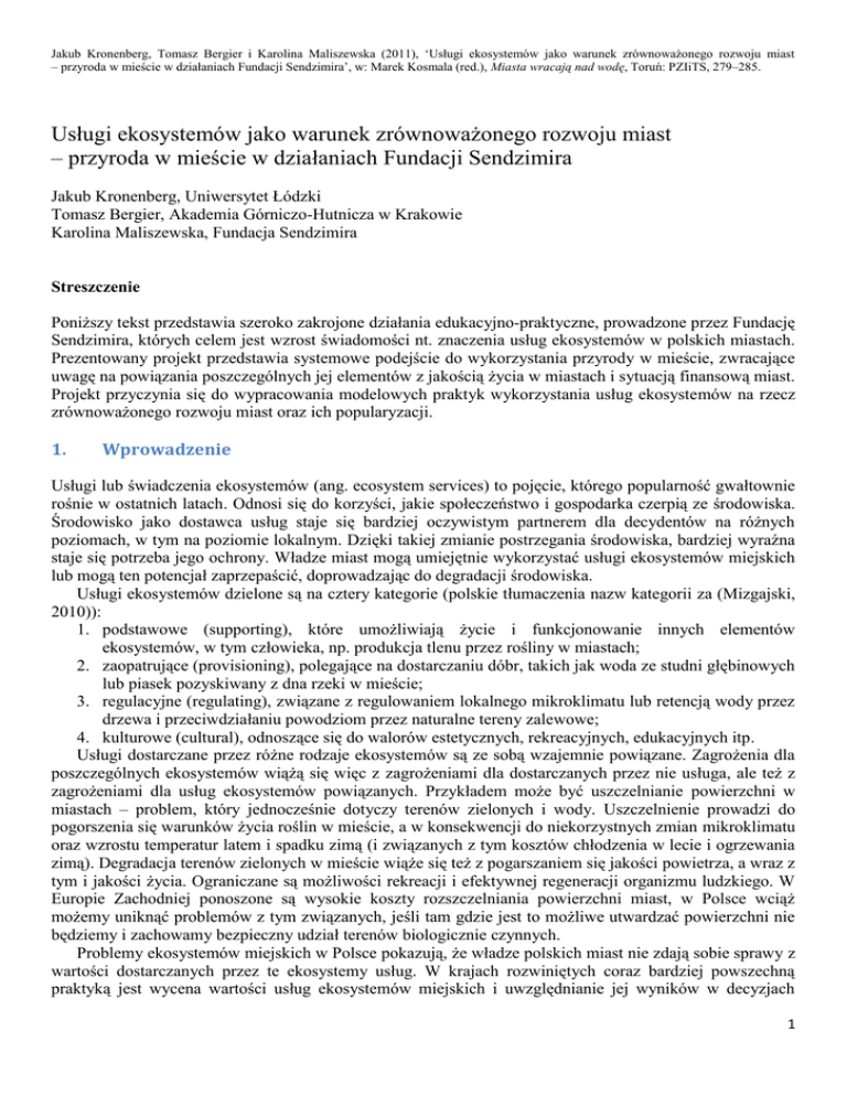 Jakub Kronenberg, Tomasz Bergier i Karolina Maliszewska (2011), ‘Usługi ekosystemów jako warunek zrównoważonego rozwoju miast – przyroda w mieście w działaniach Fundacji Sendzimira’, w: Marek Kosmala (red.), Miasta wracają nad wodę, Toruń: PZIiTS, 279–285. Usługi ekosystemów jako warunek zrównoważonego rozwoju miast – przyroda w mieście w działaniach Fundacji Sendzimira Jakub Kronenberg, Uniwersytet Łódzki Tomasz Bergier, Akademia Górniczo-Hutnicza w Krakowie Karolina Maliszewska, Fundacja Sendzimira Streszczenie Poniższy tekst przedstawia szeroko zakrojone działania edukacyjno-praktyczne, prowadzone przez Fundację Sendzimira, których celem jest wzrost świadomości nt. znaczenia usług ekosystemów w polskich miastach. Prezentowany projekt przedstawia systemowe podejście do wykorzystania przyrody w mieście, zwracające uwagę na powiązania poszczególnych jej elementów z jakością życia w miastach i sytuacją finansową miast. Projekt przyczynia się do wypracowania modelowych praktyk wykorzystania usług ekosystemów na rzecz zrównoważonego rozwoju miast oraz ich popularyzacji. 1. Wprowadzenie Usługi lub świadczenia ekosystemów (ang. ecosystem services) to pojęcie, którego popularność gwałtownie rośnie w ostatnich latach. Odnosi się do korzyści, jakie społeczeństwo i gospodarka czerpią ze środowiska. Środowisko jako dostawca usług staje się bardziej oczywistym partnerem dla decydentów na różnych poziomach, w tym na poziomie lokalnym. Dzięki takiej zmianie postrzegania środowiska, bardziej wyraźna staje się potrzeba jego ochrony. Władze miast mogą umiejętnie wykorzystać usługi ekosystemów miejskich lub mogą ten potencjał zaprzepaścić, doprowadzając do degradacji środowiska. Usługi ekosystemów dzielone są na cztery kategorie (polskie tłumaczenia nazw kategorii za (Mizgajski, 2010)): 1. podstawowe (supporting), które umożliwiają życie i funkcjonowanie innych elementów ekosystemów, w tym człowieka, np. produkcja tlenu przez rośliny w miastach; 2. zaopatrujące (provisioning), polegające na dostarczaniu dóbr, takich jak woda ze studni głębinowych lub piasek pozyskiwany z dna rzeki w mieście; 3. regulacyjne (regulating), związane z regulowaniem lokalnego mikroklimatu lub retencją wody przez drzewa i przeciwdziałaniu powodziom przez naturalne tereny zalewowe; 4. kulturowe (cultural), odnoszące się do walorów estetycznych, rekreacyjnych, edukacyjnych itp. Usługi dostarczane przez różne rodzaje ekosystemów są ze sobą wzajemnie powiązane. Zagrożenia dla poszczególnych ekosystemów wiążą się więc z zagrożeniami dla dostarczanych przez nie usługa, ale też z zagrożeniami dla usług ekosystemów powiązanych. Przykładem może być uszczelnianie powierzchni w miastach – problem, który jednocześnie dotyczy terenów zielonych i wody. Uszczelnienie prowadzi do pogorszenia się warunków życia roślin w mieście, a w konsekwencji do niekorzystnych zmian mikroklimatu oraz wzrostu temperatur latem i spadku zimą (i związanych z tym kosztów chłodzenia w lecie i ogrzewania zimą). Degradacja terenów zielonych w mieście wiąże się też z pogarszaniem się jakości powietrza, a wraz z tym i jakości życia. Ograniczane są możliwości rekreacji i efektywnej regeneracji organizmu ludzkiego. W Europie Zachodniej ponoszone są wysokie koszty rozszczelniania powierzchni miast, w Polsce wciąż możemy uniknąć problemów z tym związanych, jeśli tam gdzie jest to możliwe utwardzać powierzchni nie będziemy i zachowamy bezpieczny udział terenów biologicznie czynnych. Problemy ekosystemów miejskich w Polsce pokazują, że władze polskich miast nie zdają sobie sprawy z wartości dostarczanych przez te ekosystemy usług. W krajach rozwiniętych coraz bardziej powszechną praktyką jest wycena wartości usług ekosystemów miejskich i uwzględnianie jej wyników w decyzjach 1 dotyczących rozwoju miast. Przekłada się to na wyższą jakość życia w miastach, a także oszczędności wynikające z braku konieczności dokonywania niektórych inwestycji (ich funkcje z powodzeniem mogą być dostarczane przez sprawnie działające ekosystemy), np. retencja wody i poprawa mikroklimatu, zmniejszone nakłady na oczyszczanie ścieków związane z zatrzymaniem wody na terenach zielonych w mieście, cień i ochrona przed wiatrem, możliwość rekreacji, poprawa samopoczucia i efektywności pracy, brak konieczności budowy drogich systemów chroniących przed hałasem komunikacyjnym dzięki istnieniu pasów zieleni itp. 2. Projekt „Usługi ekosystemów jako warunek zrównoważonego rozwoju miast” Projekt łączy edukację z praktyką, zgodnie z filozofią działania Fundacji Sendzimira (Bergier i in., 2010a,b). Bezpośrednim odbiorcą działań edukacyjnych jest grupa młodych „profesjonalistów zrównoważonego rozwoju” – studentów ostatnich lat studiów, absolwentów i młodych pracowników. Pośrednim odbiorcą działań edukacyjnych są urzędnicy i inne osoby podejmujące decyzje dotyczące usług ekosystemów w miastach lub mające inny wpływ na te decyzje (np. jako interesariusze korzystający z możliwości uczestnictwa w procesach partycypacyjnych). Poprzez działania edukacyjne, projekt odpowiada na podstawowy problem, jakim jest brak świadomości nt. znaczenia usług ekosystemów w polskich miastach oraz szereg innych barier instytucjonalnych dla ich wykorzystania na rzecz zrównoważonego rozwoju miast. Działania praktyczne odnoszą się do drzew przyulicznych w miastach jako przykładu dostawcy usług. W szczególności działania te dotyczą drzew w mieście Łodzi, które zostało wybrane na partnera projektu ze względu na powszechne postrzeganie go jako „szarego i zaniedbanego”, dla którego w związku z tym wykorzystanie usług ekosystemów mogłoby stanowić szczególną szansę na poprawę jakości życia mieszkańców i jednocześnie na poprawę wizer