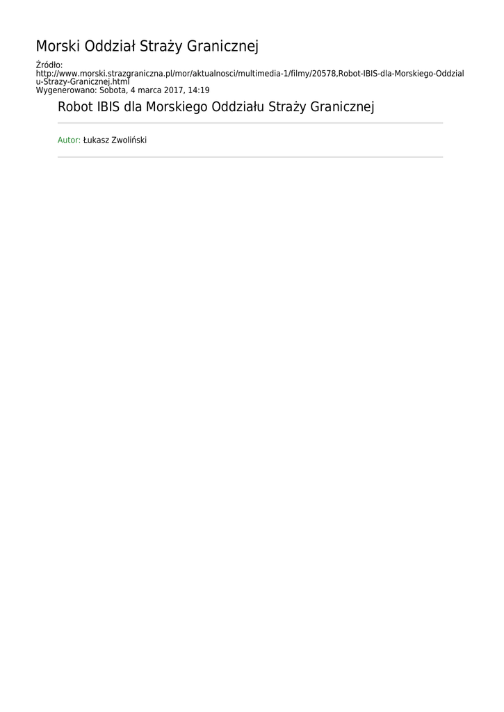 Morski Oddział Straży Granicznej Źródło: http://www.morski.strazgraniczna.pl/mor/aktualnosci/multimedia-1/filmy/20578,Robot-IBIS-dla-Morskiego-Oddzial u-Strazy-Granicznej.html Wygenerowano: Sobota, 4 marca 2017, 14:19 Robot IBIS dla Morskiego Oddziału Straży Granicznej Autor: Łukasz Zwoliński
