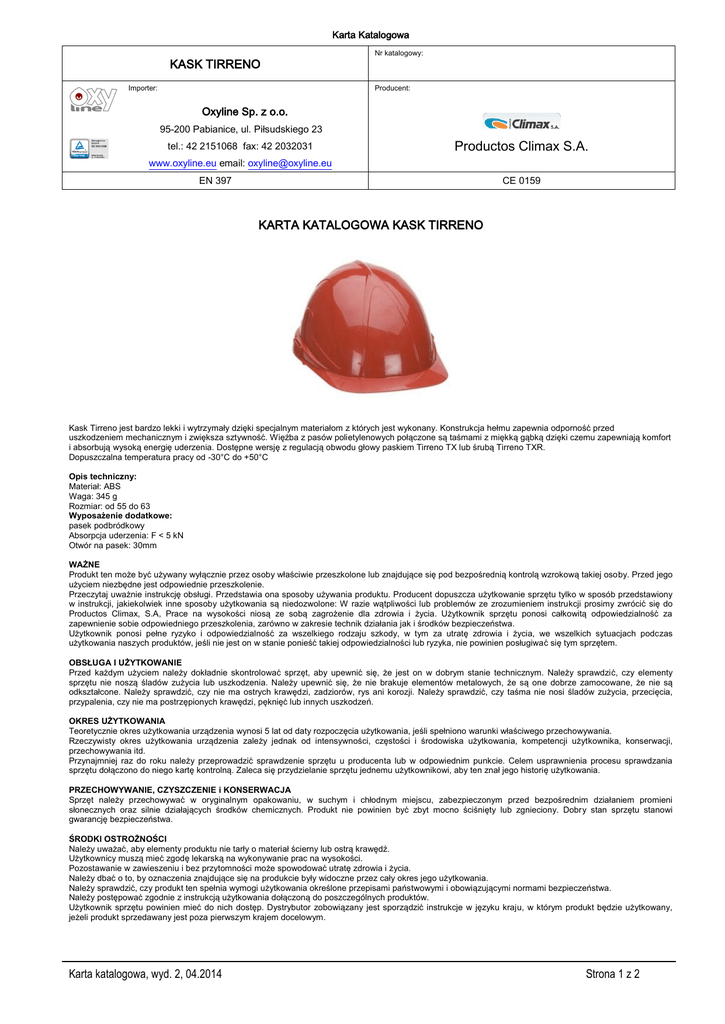 Karta Katalogowa KASK TIRRENO Importer: Nr katalogowy: Producent: ……………………………………….. Oxyline Sp. z o.o. 95-200 Pabianice, ul. Piłsudskiego 23 tel.: 42 2151068 fax: 42 2032031 Productos Climax S.A. www.oxyline.eu email: [email protected] EN 397 CE 0159 KARTA KATALOGOWA KASK TIRRENO Kask Tirreno jest bardzo lekki i wytrzymały dzięki specjalnym materiałom z których jest wykonany. Konstrukcja hełmu zapewnia odporność przed uszkodzeniem mechanicznym i zwiększa sztywność. Więźba z pasów polietylenowych połączone są taśmami z miękką gąbką dzięki czemu zapewniają komfort i absorbują wysoką energię uderzenia. Dostępne wersję z regulacją obwodu głowy paskiem Tirreno TX lub śrubą Tirreno TXR. Dopuszczalna temperatura pracy od -30°C do +50°C Opis techniczny: Materiał: ABS Waga: 345 g Rozmiar: od 55 do 63 Wyposażenie dodatkowe: pasek podbródkowy Absorpcja uderzenia: F < 5 kN Otwór na pasek: 30mm WAŻNE Produkt ten może być używany wyłącznie przez osoby właściwie przeszkolone lub znajdujące się pod bezpośrednią kontrolą wzrokową takiej osoby. Przed jego użyciem niezbędne jest odpowiednie przeszkolenie. Przeczytaj uważnie instrukcję obsługi. Przedstawia ona sposoby używania produktu. Producent dopuszcza użytkowanie sprzętu tylko w sposób przedstawiony w instrukcji, jakiekolwiek inne sposoby użytkowania są niedozwolone: W razie wątpliwości lub problemów ze zrozumieniem instrukcji prosimy zwrócić się do Productos Climax, S.A, Prace na wysokości niosą ze sobą zagrożenie dla zdrowia i życia. Użytkownik sprzętu ponosi całkowitą odpowiedzialność za zapewnienie sobie odpowiedniego przeszkolenia, zarówno w zakresie technik działania jak i środków bezpieczeństwa. Użytkownik ponosi pełne ryzyko i odpowiedzialność za wszelkiego rodzaju szkody, w tym za utratę zdrowia i życia, we wszelkich sytuacjach podczas użytkowania naszych produktów, jeśli nie jest on w stanie ponieść takiej odpowiedzialności lub ryzyka, nie powinien posługiwać się tym sprzętem. OBSŁUGA I UŻYTKOWANIE Przed każdym użyciem należy dokładnie skontrolować sprzęt, aby upewnić się, że jest on w dobrym stanie technicznym. Należy sprawdzić, czy elementy sprzętu nie noszą śladów zużycia lub uszkodzenia. Należy upewnić się, że nie brakuje elementów metalowych, że są one dobrze zamocowane, że nie są odkształcone. Należy sprawdzić, czy nie ma ostrych krawędzi, zadziorów, rys ani korozji. Należy sprawdzić, czy taśma nie nosi śladów zużycia, przecięcia, przypalenia, czy nie ma postrzępionych krawędzi, pęknięć lub innych uszkodzeń. OKRES UŻYTKOWANIA Teoretycznie okres użytkowania urządzenia wynosi 5 lat od daty rozpoczęcia użytkowania, jeśli spełniono warunki właściwego przechowywania. Rzeczywisty okres użytkowania urządzenia zależy jednak od intensywności, częstości i środowiska użytkowania, kompetencji użytkownika, konserwacji, przechowywania itd. Przynajmniej raz do roku należy przeprowadzić sprawdzenie sprzętu u producenta lub w odpowiednim punkcie. Celem usprawnienia procesu sprawdzania sprzętu dołączono do niego kartę kontrolną. Zaleca się przydzielanie sprzętu jednemu użytkownikowi, aby ten znał jego historię użytkowania. PRZECHOWYWANIE, CZYSZCZENIE i KONSERWACJA Sprzęt należy przechowywać w oryginalnym opakowaniu, w suchym i chłodnym miejscu, zabezpieczonym przed bezpośrednim działaniem promieni słonecznych oraz silnie działających środków chemicznych. Produkt nie powinien być zbyt mocno ściśnięty lub zgnieciony. Dobry stan sprzętu stanowi gwarancję bezpieczeństwa. ŚRODKI OSTROŻNOŚCI Należy uważać, aby elementy produktu nie tarły o materiał ścierny lub ostrą krawędź. Użytkownicy muszą mieć zgodę lekarską na wykonywanie prac na wysokości. Pozostawanie w zawieszeniu i bez przytomności może spowodować utratę zdrowia i życia. Należy dbać o to, by oznaczenia znajdujące się na produkcie były widoczne przez cały okres jego użytkowania. Należy sprawdzić, czy produkt ten spełnia wymogi użytkowania określone przepisami państwowymi i obowiązującymi normami bezpieczeństwa. Należy postępować zgodnie z instrukcją użytkowania dołączoną do poszczególnych produktów. Użytkownik sprzętu powinien mieć do nich dostęp. Dystrybutor zobowiązany jest sporządzić instrukcje w języku kraju, w którym produkt będzie użytkowany, jeżeli produkt sprzedawany jest poza pierwszym krajem docelowym. Karta katalogowa, wyd. 2, 04.2014 Strona 1 z 2 Tabela kontroli i napraw KASK TIRRENO EN 397 Nazwisko użytkownika: Data zakupu: Data pierwszego użycia: Data produkcji: Numer seryjny: Uwagi: Data przeglądu Karta katalogowa, wyd. 2, 04.2014 Nazwisko osoby dokonującej przeglądu Pieczątka, podpis Strona 2 z 2