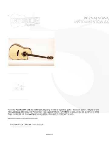 Maestro Rosetta MR CSB to elektroakustyczny model z wysokiej półki - Custom Series. Użyto w nim najwyższej jakości drewno Palisander Madagaskar (boki i tył) które w połączeniu ze Świerkiem Sitka (top) wyróznia się niezwykłą dźwięcznością i doniosłym mocnym tonem. Model wyposażony w elektronike L.R. Bagg's Anthem oraz wycięcie Cutaway. Konstrukcja i kształt: Dreadnought Top: selekconowane lite drewno świerkowe Sitka Strona 1 z 2 Boki i tył: lity Palisander Madagaskar Dodatkowe elementy budowy: Otwór rezonansowy na górnym boku, Wyprofilowana krawędź pod rękę Wykończenie: lakier ochronny , połysk Gryf: Mahoń Khaya, pręt napinający z włókna węglowego Podstrunnica i mostek: Heban Siodełko i mostek wykonany z kości Przetwornik: LR Bagg's Anthem Stroiki: Grover Skala: 650mm Oryginalny twardy futerał Maestro w zestawie (kolor ciemno brązowy). Strona 2 z 2