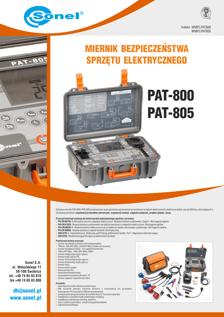 Indeks: WMPLPAT800 WMPLPAT805 MIERNIK BEZPIECZEŃSTWA SPRZĘTU ELEKTRYCZNEGO PAT-800 PAT-805 Cyfrowe mierniki PAT-800 i PAT-805 przeznaczone są do pomiarów parametrów przenośnych urządzeń elektrycznych (elektronarzędzia, sprzęt AGD itp.) decydujących o ich bezpieczeństwie: rezystancji przewodów ochronnych, rezystancji izolacji, ciągłości połączeń, prądów upływu, mocy. Przyrząd może być używany do badań sprzętu wykonywanego zgodnie z normami: ! PN-EN 60745-1: Narzędzia ręczne o napędzie elektrycznym. Bezpieczeństwo użytkowania. Część 1: Wymagania ogólne. ! PN-EN 61029: Bezpieczeństwo użytkowania narzędzi przenośnych o napędzie elektrycznym. Wymagania ogólne. ! PN-EN 60335-1: Bezpieczeństwo elektrycznych przyrządów do użytku domowego i podobnego. Wymagania ogólne. ! PN-EN 60950: Bezpieczeństwo urządzeń techniki informatycznej. ! VDE 0701-1 Instandsetzung, Änderung und Prüfung elektrischer Geräte. Teil 1: Allgemeine Anforderungen. ! VDE 0702 Wiederholungsprüfungen an elektrischen Geräten. Sonel S.A. ul. Wokulskiego 11 58-100 Świdnica tel. +48 74 85 83 878 fax +48 74 85 83 808 [email protected] www.sonel.pl Podstawowe funkcje przyrządu: ! pomiar rezystancji przewodu ochronnego prądem: ! 200mA, 10A (PAT-805), 25A(PAT-805) (I klasa ochronności), ! pomiar rezystancji izolacji - trzy napięcia pomiarowe: ! 100V (PAT-805), 250V (PAT-805) i 500V ! pomiar zastępczego prądu upływu, ! pomiar prądu upływu PE, ! pomiar różnicowego prądu upływu, ! pomiar dotykowego prądu upływu, ! pomiar mocy, ! pomiar poboru prądu, ! test przewodu IEC, ! sprawdzenie bezpiecznika, ! sprawdzenie rezystancji obwodu L-N, ! pomiar napięcia i częstotliwości sieci. Pozostałe: ! automatyczny wybór zakresu pomiarowego, ! 990 komórek pamięci wyników pomiaru z możliwością ich przesłania do komputera PC przez łącze USB lub wydrukowania, ! profesjonalne oprogramowanie do obróbki danych i tworzenia raportów ! współpraca z czytnikiem kodu kreskowego i drukarką, ! współpraca z pamięcią przenośną pendrive, ! duży, czytelny wyświetlacz z możliwością podświetlenia, ! ergonomiczna obsługa. PAT-800 / PAT-805 Pomiar rezystancji przewodu uziemienia I=200mA (I klasa ochronności) Zakres wyświetlania Rozdzielczość 0,00...0,99Ω 0,01Ω 1,00...19,99Ω Pomiar zastępczego prądu upływu: Błąd podstawowy Zakres wyświetlania Rozdzielczość ±(4% w.m. + 2 cyfry) 0,00...3,99mA 0,01mA ±(4% w.m. + 3 cyfry) 4,0...19,9mA 0,1mA Błąd podstawowy ±(5% w.m. + 2 cyfry) · prąd pomiarowy: ł200mA dla R= 0,2...1,99Ω · ustawialny limit górny w zakresie: 10mΩ …1,99Ω z rozdzielczością 0,01Ω · regulowany czas pomiaru 1...60s z rozdzielczością 1s · ustawialny limit pomiaru w zakresie: 0,01...9,9mA z rozdzielczością 0,01mA/0,1mA · regulowany czas pomiaru: pomiar ciągły (Cont) lub 1...60s z rozdzielczością 1s · napięcie rozwarcia: 25...50V Pomiar rezystancji przewodu uziemienia I=10A (I klasa ochronności, tylko PAT-805) Pomiar dotykowego prądu upływu: Zakres wyświetlania Rozdzielczość Błąd podstawowy 0...999mΩ 1mΩ ±(3% w.m. + 4 cyfry) 1,00...1,99Ω 0,01Ω ±(3% w.m. + 40 cyfr)* * dla pomiaru dwuprzewodowego · metoda techniczna pomiaru zapewniająca wysoką dokładność otrzymanych wyników · prąd pomiarowy: ł10A dla RŁ0,5Ω · ustawialny limit górny w zakresie: 10mΩ …1,99Ω z rozdzielczością 0,01Ω · regulowany czas pomiaru 1...60s z rozdzielczością 1s Pomiar rezystancji przewodu uziemienia I=25A (I klasa ochronności, tylko PAT-805) Zakres wyświetlania Rozdzielczość Błąd podstawowy 0,00...4,999mA 0,001mA ±(5% w.m. + 3 cyfry) · ustawialny limit pomiaru w zakresie: 0,01...1,99mA z rozdzielczością 0,01mA · regulowany czas pomiaru: pomiar ciągły (Cont) lub 1...60s z rozdzielczością 1s · pasmo pomiaru prądu 20Hz...100kHz Pomiar mocy S: Zakres wyświetlania Rozdzielczość 0...999VA 1VA 1...3,99kVA 0,01kVA Błąd podstawowy Zakres wyświetlania Rozdzielczość 0...999mΩ 1mΩ ±(3% w.m. + 4 cyfry) · regulowany czas pomiaru: pomiar ciągły (Cont) lub 1...60s z rozdzielczością 1s 0,01Ω ±(3% w.m. + 40 cyfr)* Pomiar poboru prądu: 1,00...1,99Ω Błąd podstawowy ±(5% w.m. + 3 cyfry) Zakres wyświetlania Rozdzielczość Błąd podstawowy 0,00...15,99A 0,01A ±(2% w.m. + 3 cyfry) * dla pomiaru dwuprzewodowego · metoda techniczna pomiaru zapewniająca wysoką dokładność otrzymanych wyników · prąd pomiarowy: ł25A dla RŁ0,2Ω · ustawialny limit górny w zakresie: 10mΩ …1,99Ω z rozdzielczością 0,01Ω · regulowany czas pomiaru 1...60s z rozdzielczością 1s · regulowany czas pomiaru: pomiar ciągły (Cont) lub 1...60s z rozdzielczością 1s Pomiar rezystancji obwodu L-N Pomiar napięcia : Zakres wyświetlania Rozdzielczość 0...999Ω 1Ω 1,00...4,99kΩ 0,01kΩ Błąd podstawowy ±(5% w.m. + 5 cyfr) • napięcie pomiaru: 4...8V AC • prąd zwarcia: max. 5mA Pomiar rezystancji izlolacji Zakres pomiarowy wg IEC 61557-2 dla: UN=100V: 100kΩ...99,9MΩ (tylko PAT-805) UN=250V: 250kΩ...199,9MΩ (tylko PAT-805) UN=500V: 500kΩ...599,9MΩ UN 100V 250V 500V Zakres Rozdzielczość 0...1999kΩ 1kΩ 2,0...19,99MΩ 0,01MΩ 20,0...99,9MΩ 0,1MΩ 0...1999kΩ 1kΩ 2,00...19,99MΩ 0,01MΩ 20,0...199,9MΩ 0,1MΩ 0...1999kΩ 1kΩ 2...19,99MΩ 0,01MΩ 20,0...599,9MΩ 0,1MΩ Błąd podstawowy ±(5% w.m. +8 cyfr) · ustawialny limit pomiaru w zakresie: 0,01...9,9mA z rozdzielczością 0,1MΩ · regulowany czas pomiaru: pomiar ciągły (Cont) lub od 4s do 3min z rozdzielczością 1s · samoczynne rozładowanie pojemności mierzonego obiektu po zakończeniu pomiaru · zabezpieczenie przed pomiarem obiektów pod napięciem · prąd wyjściowy max. 1,4mA Pomiar prądu upływu PE oraz różnicowego prądu upływu: Zakres wyświetlania Rozdzielczość 0,00...3,99mA 0,01mA 4,0...19,9mA 0,1mA Błąd podstawowy ±(5% w.m. + 2 cyfry) · ustawialny limit pomiaru w zakresie: 0,01...9,9mA z rozdzielczością 0,01mA/