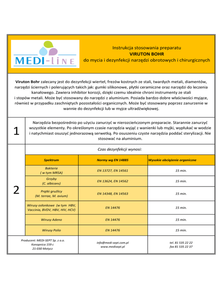 Instrukcja stosowania preparatu VIRUTON BOHR do mycia i dezynfekcji narzędzi obrotowych i chirurgicznych Viruton Bohr zalecany jest do dezynfekcji wierteł, frezów kostnych ze stali, twardych metali, diamentów, narzędzi ściernych i polerujących takich jak: gumki silikonowe, płytki ceramiczne oraz narzędzi do leczenia kanałowego. Zawiera inhibitor korozji, dzięki czemu idealnie chroni instrumenty ze stali i stopów metali. Może byd stosowany do narzędzi z aluminium. Posiada bardzo dobre właściwości myjące, również w przypadku zaschniętych pozostałości organicznych. Może byd stosowany poprzez zanurzenie w wannie do dezynfekcji lub w myjce ultradźwiękowej. 1 Narzędzia bezpośrednio po użyciu zanurzyd w nierozcieoczonym preparacie. Starannie zanurzyd wszystkie elementy. Po określonym czasie narzędzia wyjąd z wanienki lub myjki, wypłukad w wodzie i natychmiast osuszyd jednorazową serwetką. Po osuszeniu czyste narzędzia poddad sterylizacji. Nie stosowad na aluminium. Czas dezynfekcji wynosi: 2 Spektrum Normy wg EN 14885 Bakterie ( w tym MRSA) EN 13727, EN 14561 15 min. Grzyby (C. albicans) EN 13624, EN 14562 15 min. Prątki gruźlicy (M. terrae, M. avium) EN 14348, EN 14563 15 min. Wirusy osłonkowe (w tym HBV, Vaccinia, BVDV, HBV, HIV, HCV) EN 14476 15 min. Wirusy Adeno EN 14476 15 min. Wirusy Polio EN 14476 15 min. [email protected] www.medisept.pl tel. 81 535 22 22 fax 81 535 22 37 Producent: MEDI-SEPT Sp. z o.o. Konopnica 159 c 21-030 Motycz Wysokie obciążenie organiczne