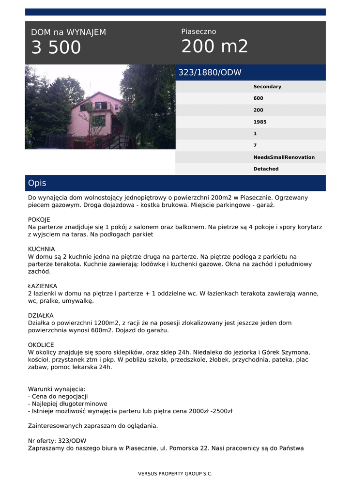 Piaseczno DOM na WYNAJEM 200 m2 3 500 323/1880/ODW Secondary 600 200 1985 1 7 NeedsSmallRenovation Detached Opis Do wynajęcia dom wolnostojący jednopiętrowy o powierzchni 200m2 w Piasecznie. Ogrzewany piecem gazowym. Droga dojazdowa - kostka brukowa. Miejscie parkingowe - garaż. POKOJE Na parterze znadjduje się 1 pokój z salonem oraz balkonem. Na pietrze są 4 pokoje i spory korytarz z wyjsciem na taras. Na podłogach parkiet KUCHNIA W domu są 2 kuchnie jedna na piętrze druga na parterze. Na piętrze podłoga z parkietu na parterze terakota. Kuchnie zawierają: lodówkę i kuchenki gazowe. Okna na zachód i południowy zachód. ŁAZIENKA 2 łazienki w domu na piętrze i parterze + 1 oddzielne wc. W łazienkach terakota zawierają wanne, wc, pralke, umywalkę. DZIAŁKA Działka o powierzchni 1200m2, z racji że na posesji zlokalizowany jest jeszcze jeden dom powierzchnia wynosi 600m2. Dojazd do garażu. OKOLICE W okolicy znajduje się sporo sklepików, oraz sklep 24h. Niedaleko do jeziorka i Górek Szymona, kościoł, przystanek ztm i pkp. W pobliżu szkoła, przedszkole, żłobek, przychodnia, pateka, plac zabaw, pomoc lekarska 24h. Warunki wynajęcia: - Cena do negocjacji - Najlepiej długoterminowe - Istnieje możliwość wynajęcia parteru lub piętra cena 2000zł -2500zł Zainteresowanych zapraszam do oglądania. Nr oferty: 323/ODW Zapraszamy do naszego biura w Piasecznie, ul. Pomorska 22. Nasi pracownicy są do Państwa VERSUS PROPERTY GROUP S.C. dyspozycji od 10:00 do 18:00 (pon-pt), w sobotę od 10:00 do 13:00. Kontakt telefoniczny w sprawie ofert codziennie od godziny 8:00 do 22:00 tel. 664 476 532 W celu zapoznania się z naszą pełną ofertą nieruchomości zapraszamy na naszą stronę www.versusgroup.pl Niniejsze ogłoszenie nie stanowi oferty w rozumieniu przepisów Kodeksu Cywilnego oraz innych właściwych przepisów prawnych, a dane w niej zawarte mają jedynie charakter informacyjny. Agnieszka Gawin tel. 881 935 216 email: [email protected] VERSUS PROPERTY GROUP S.C. Powered by TCPDF (www.tcpdf.org)