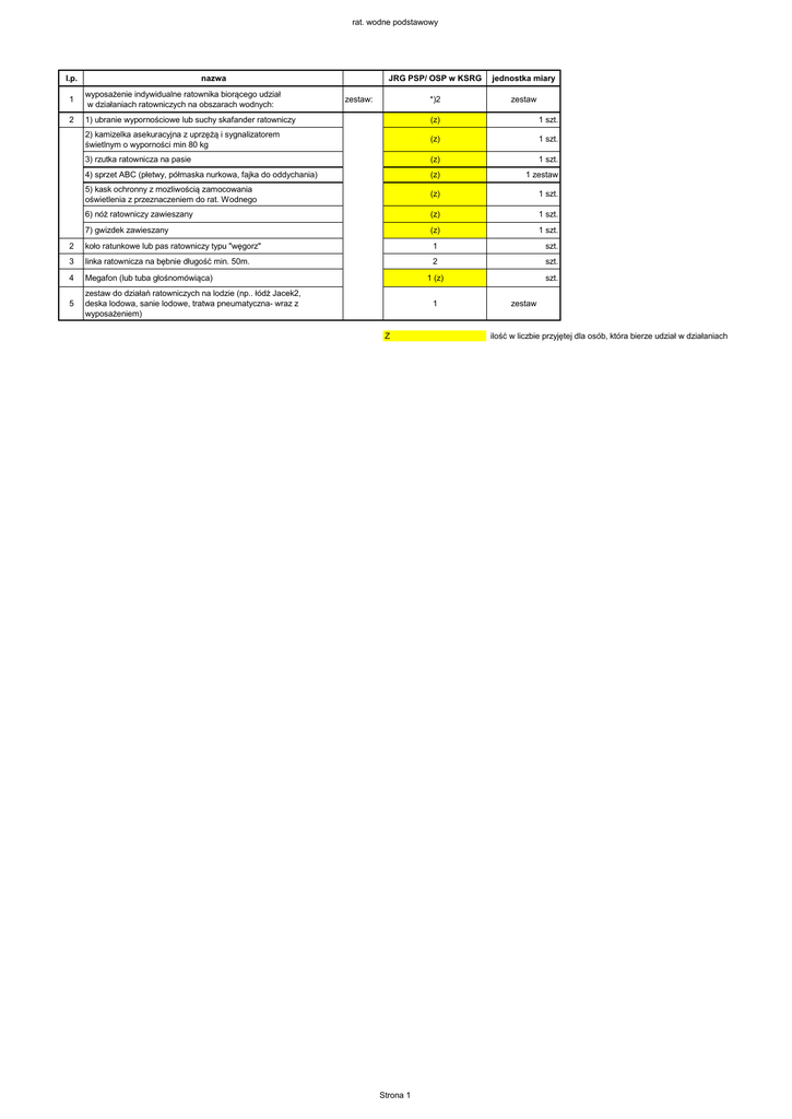 rat. wodne podstawowy l.p. nazwa JRG PSP/ OSP w KSRG jednostka miary *)2 zestaw 1 wyposażenie indywidualne ratownika biorącego udział w działaniach ratowniczych na obszarach wodnych: 2 1) ubranie wypornościowe lub suchy skafander ratowniczy (z) 1 szt. 2) kamizelka asekuracyjna z uprzężą i sygnalizatorem świetlnym o wyporności min 80 kg (z) 1 szt. 3) rzutka ratownicza na pasie (z) 1 szt. 4) sprzet ABC (płetwy, półmaska nurkowa, fajka do oddychania) (z) 1 zestaw 5) kask ochronny z mozliwością zamocowania oświetlenia z przeznaczeniem do rat. Wodnego (z) 1 szt. 6) nóż ratowniczy zawieszany (z) 1 szt. 7) gwizdek zawieszany (z) 1 szt. 2 koło ratunkowe lub pas ratowniczy typu "węgorz" 1 szt. 3 linka ratownicza na bębnie długość min. 50m. 2 szt. 4 Megafon (lub tuba głośnomówiąca) 1 (z) szt. 5 zestaw do działań ratowniczych na lodzie (np.. łódż Jacek2, deska lodowa, sanie lodowe, tratwa pneumatyczna- wraz z wyposażeniem) zestaw: 1 Z Strona 1 zestaw ilość w liczbie przyjętej dla osób, która bierze udział w działaniach