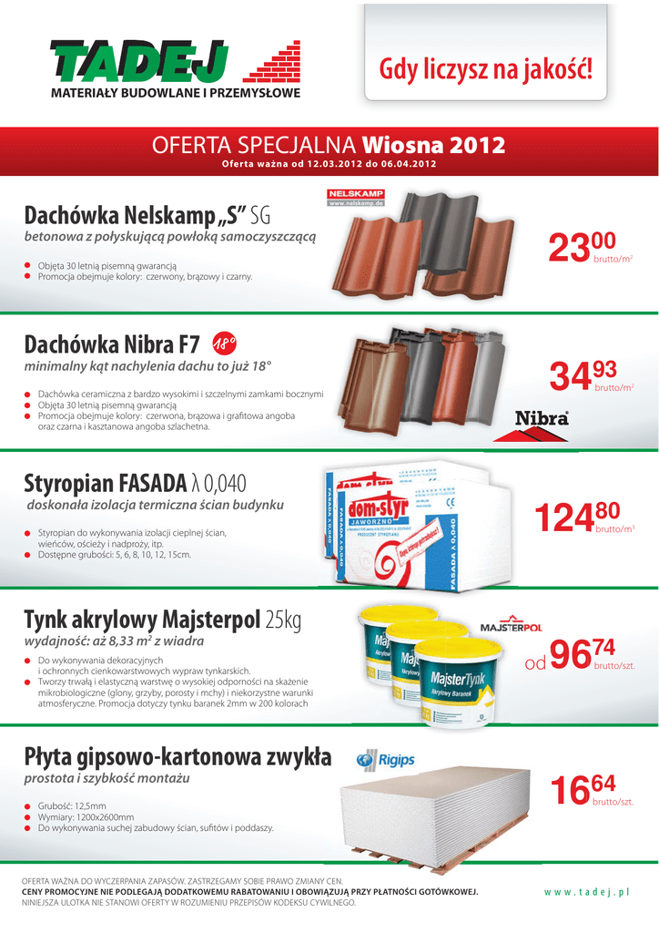 MATERIAŁY BUDOWLANE I PRZEMYSŁOWE Gdy liczysz na jakość! OFERTA SPECJALNA Wiosna 2012 Ofer ta ważna od 12.03.2012 do 06.04.2012 Dachówka Nelskamp „S” SG betonowa z połyskującą powłoką samoczyszczącą Objęta 30 letnią pisemną gwarancją Promocja obejmuje kolory: czerwony, brązowy i czarny. Dachówka Nibra F7 minimalny kąt nachylenia dachu to już 18° Dachówka ceramiczna z bardzo wysokimi i szczelnymi zamkami bocznymi Objęta 30 letnią pisemną gwarancją Promocja obejmuje kolory: czerwona, brązowa i grafitowa angoba oraz czarna i kasztanowa angoba szlachetna. Styropian FASADA λ 0,040 doskonała izolacja termiczna ścian budynku Styropian do wykonywania izolacji cieplnej ścian, wieńców, ościeży i nadproży, itp. Dostępne grubości: 5, 6, 8, 10, 12, 15cm. Tynk akrylowy Majsterpol 25kg wydajność: aż 8,33 m2 z wiadra Do wykonywania dekoracyjnych i ochronnych cienkowarstwowych wypraw tynkarskich. Tworzy trwałą i elastyczną warstwę o wysokiej odporności na skażenie mikrobiologiczne (glony, grzyby, porosty i mchy) i niekorzystne warunki atmosferyczne. Promocja dotyczy tynku baranek 2mm w 200 kolorach Płyta gipsowo-kartonowa zwykła prostota i szybkość montażu Grubość: 12,5mm Wymiary: 1200x2600mm Do wykonywania suchej zabudowy ścian, sufitów i poddaszy. Y CEN. CEN OFERTA WAŻNA DO WYCZERPANIA ZAPASÓW. ZASTRZEGAMY SOBIE PRAWO ZMIANY CENY PROMOCYJNE NIE PODLEGAJĄ DODATKOWEMU RABATOWANIU I OBOWIĄZUJĄ PRZY PŁATNOŚCI GOTÓWKOWEJ. NINIEJSZA ULOTKA NIE STANOWI OFERTY W ROZUMIENIU PRZEPISÓW KODEKSU CYWILNEGO. 2300 brutto/m2 3493 brutto/m2 12480 brutto/m3 74 96 od brutto/szt. 1664 brutto/szt. www.tadej.pl Nasze oddziały: MATERIAŁY BUDOWLANE I PRZEMYSŁOWE www.tadej.pl | [email protected] 46-080 CHRÓŚCICE, ul. Powstańców 23 , tel. +77/40 32 475, fax +77/46 95 009 46-081 DOBRZEŃ WLK., ul. Opolska 16, tel. +77/40 32 720, fax +77/40 32 721 49-300 BRZEG, ul. Polna 2, tel./fax +77/41 69 727 46-060 PRZYSIECZ, ul. Opolska 2a, tel./fax +77/46 49 691 OFERTA SPECJALNA Wiosna 2012 Ofer ta ważna od 12.03.2012 do 06.04.2012 Płyta OSB-3 22mm Wymiary: 1250x2500mm Płyta konstrukcyjna do stosowania wewnątrz i na zewnątrz budynków w środowisku o umiarkowanej wilgotności. Klej do glazury Quick-Mix Z-301 25kg 30 9830 brutto/szt. 91 1491 brutto/szt. Do przyklejania płytek ceramicznych ściennych i podłogowych Mrozoodporny do wnętrz i na zewnątrz budynków Gładź gipsowa GX 01 Euro-Mix 20kg EURO-MIX 52 2052 brutto/szt. Śnieżnobiała i elastyczna Do cienkowarstwowego szpachlowania powierzchni ścian i sufitów oraz uzupełniania w nich ubytków wewnątrz pomieszczeń. Farba emulsyjna EKO Śnieżka biała 10L 5199 brutto/szt. Śnieżnobiała, hipoalergiczna emulsja akrylowa do ścian i sufitów Stosowana do wnętrz Preparat gruntujący Aplause 5L koncentrat Preparat akrylowy, koncentrat głęboko penetrujący. Do gruntowania i wzmacniania podłoży mineralnych pod farby i tynki akrylowe oraz tapety. Koncentrat 1:2 1664 brutto/szt.