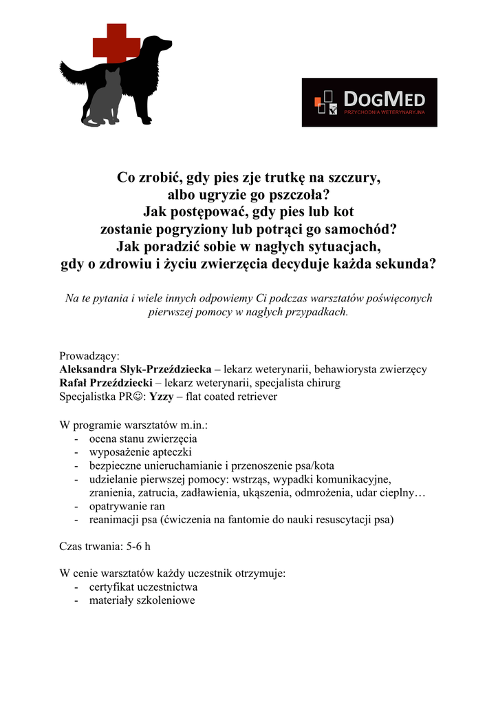 Co zrobić, gdy pies zje trutkę na szczury, albo ugryzie go pszczoła? Jak postępować, gdy pies lub kot zostanie pogryziony lub potrąci go samochód? Jak poradzić sobie w nagłych sytuacjach, gdy o zdrowiu i życiu zwierzęcia decyduje każda sekunda? Na te pytania i wiele innych odpowiemy Ci podczas warsztatów poświęconych pierwszej pomocy w nagłych przypadkach. Prowadzący: Aleksandra Słyk-Przeździecka – lekarz weterynarii, behawiorysta zwierzęcy Rafał Przeździecki – lekarz weterynarii, specjalista chirurg Specjalistka PRJ: Yzzy – flat coated retriever W programie warsztatów m.in.: - ocena stanu zwierzęcia - wyposażenie apteczki - bezpieczne unieruchamianie i przenoszenie psa/kota - udzielanie pierwszej pomocy: wstrząs, wypadki komunikacyjne, zranienia, zatrucia, zadławienia, ukąszenia, odmrożenia, udar cieplny… - opatrywanie ran - reanimacji psa (ćwiczenia na fantomie do nauki resuscytacji psa) Czas trwania: 5-6 h W cenie warsztatów każdy uczestnik otrzymuje: - certyfikat uczestnictwa - materiały szkoleniowe