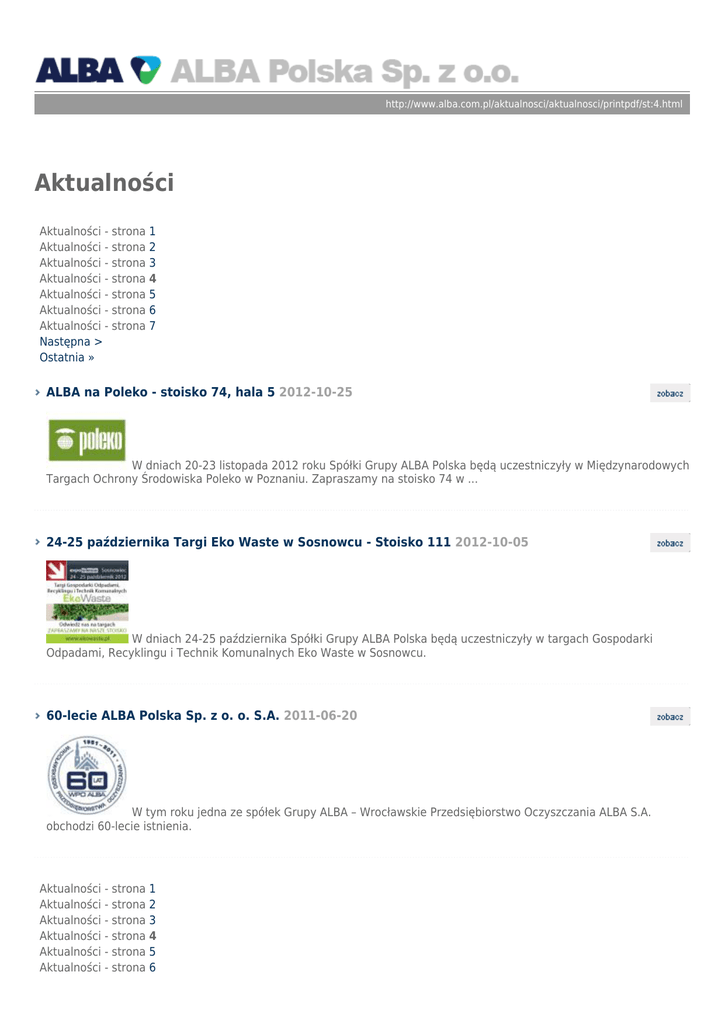 http://www.alba.com.pl/aktualnosci/aktualnosci/printpdf/st:4.html Aktualności Aktualności - strona 1 Aktualności - strona 2 Aktualności - strona 3 Aktualności - strona 4 Aktualności - strona 5 Aktualności - strona 6 Aktualności - strona 7 Następna > Ostatnia » ALBA na Poleko - stoisko 74, hala 5 2012-10-25 W dniach 20-23 listopada 2012 roku Spółki Grupy ALBA Polska będą uczestniczyły w Międzynarodowych Targach Ochrony Środowiska Poleko w Poznaniu. Zapraszamy na stoisko 74 w ... 24-25 października Targi Eko Waste w Sosnowcu - Stoisko 111 2012-10-05 W dniach 24-25 października Spółki Grupy ALBA Polska będą uczestniczyły w targach Gospodarki Odpadami, Recyklingu i Technik Komunalnych Eko Waste w Sosnowcu. 60-lecie ALBA Polska Sp. z o. o. S.A. 2011-06-20 W tym roku jedna ze spółek Grupy ALBA – Wrocławskie Przedsiębiorstwo Oczyszczania ALBA S.A. obchodzi 60-lecie istnienia. Aktualności - strona 1 Aktualności - strona 2 Aktualności - strona 3 Aktualności - strona 4 Aktualności - strona 5 Aktualności - strona 6 Aktualności - strona 7 Następna > Ostatnia »