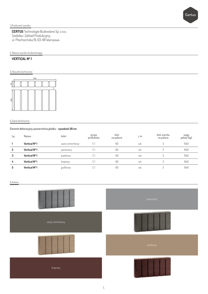 1_Producent wyrobu: CERTUS Technologie Budowlane Sp. z o.o. Siedziba i Zakład Produkcyjny, ul. Płochocińska 19, 03-191 Warszawa 2_Nazwa wyrobu budowlanego: VERTICAL N⁰ 1 3_Rysunki techniczne: 280 80 600 4_Dane techniczne: Element dekoracyjny, powierzchnia gładka – wysokość 28 cm grupa produktów ilość na palecie j. m ilość warstw na palecie waga palety (kg) szary cementowy C1 60 szt. 3 1540 Vertical N⁰ 1 jasnoszary C1 60 szt. 3 1540 3 Vertical N⁰ 1 piaskowy C1 60 szt. 3 1540 4 Vertical N⁰ 1 brązowy C1 60 szt. 3 1540 5 Vertical N⁰ 1 grafitowy C1 60 szt. 3 1540 Lp. Nazwa kolor 1 Vertical N⁰ 1 2 5_Kolory jasnoszary szary cementowy piaskowy brązowy 1. 5_Kolory grafitowy 6_Przeznaczenie i zakres stosowania wyrobu budowlanego: Murki | Obrzeża | Schody 7_Specyfikacja techniczna: PN-EN 13198: 2005 Prefabrykaty z betonu. Wymagania i metody badań. Elementy małej architektury ulic i ogrodów. 8_Deklarowane cechy techniczne typu wyrobu budowlanego: C20/25 długość ±5mm Klasa betonu: Tolerancje wymiarowe: 2.