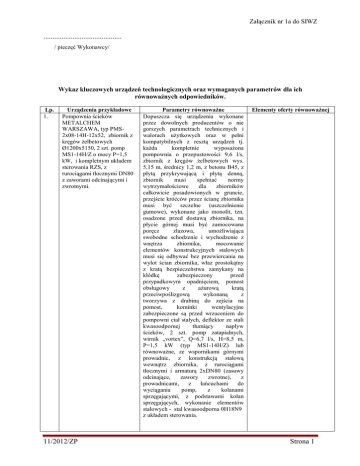 Załącznik nr 1a do SIWZ ........................................... / pieczęć Wykonawcy/ Wykaz kluczowych urządzeń technologicznych oraz wymaganych parametrów dla ich równoważnych odpowiedników. Lp. 1. Urządzenia przykładowe Pompownia ścieków METALCHEM WARSZAWA, typ PMS2x08-14H-12x52, zbiornik z kręgów żelbetowych Ø1200x5150, 2 szt. pomp MS1-14H/Z o mocy P=1,5 kW, i kompletnym układem sterowania RZS, z rurociągami tłocznymi DN80 z zaworami odcinającymi i zwrotnymi. 11/2012/ZP Parametry równoważne Dopuszcza się urządzenia wykonane przez dowolnych producentów o nie gorszych parametrach technicznych i walorach użytkowych oraz w pełni kompatybilnych z resztą urządzeń tj. każda kompletnie wyposażona pompownia o przepustowości 9,6 l/s, zbiornik z kręgów żelbetowych wys. 5,15 m, średnicy 1,2 m, z betonu B45, z płytą przykrywającą i płytą denną, zbiornik musi spełniać normy wytrzymałościowe dla zbiorników całkowicie posadowionych w gruncie, przejście króćców przez ścianę zbiornika musi być szczelne (uszczelnienie gumowe), wykonane jako monolit, tzn. osadzone przed dostawą zbiornika, na płycie górnej musi być zamocowana poręcz złazowa, umożliwiająca swobodne schodzenie i wychodzenie z wnętrza zbiornika, mocowanie elementów konstrukcyjnych stalowych musi się odbywać bez przewiercania na wylot ścian zbiornika, właz prostokątny z kratą bezpieczeństwa zamykany na kłódkę zabezpieczony przed przypadkowym opadnięciem, pomost obsługowy z ażurową kratą przeciwpoślizgową wykonaną z tworzywa z drabiną do zejścia na pomost, kominki wentylacyjne zabezpieczone są przed wrzuceniem do pompowni ciał stałych, deflektor ze stali kwasoodpornej tłumiący napływ ścieków, 2 szt. pomp zatapialnych, wirnik „vortex”, Q=6,7 l/s, H=8,5 m, P=1,5 kW (typ MS1-14H/Z) lub równoważne, ze wspornikami górnymi prowadnic, z konstrukcją stalową wewnątrz zbiornika, z rurociągami tłocznymi i armaturą 2xDN80 (zasuwy odcinające, zawory zwrotne), z prowadnicami, z łańcuchami do wyciągania pomp, z kolanami sprzęgającymi, z podstawami kolan sprzęgających, wykonanie elementów stalowych - stal kwasoodporna 0H18N9 z układem sterowania. Elementy oferty równoważnej Strona 1 Załącznik nr 1a do SIWZ 2. Sito-piaskownik (stacja odwadniania typu Draimad 02BM - workownica) Dopuszcza się urządzenia wykonane przez dowolnych producentów o nie gorszych parametrach technicznych i walorach użytkowych oraz w pełni kompatybilnych z resztą urządzeń tj. każda stacja umożliwiająca separację i odwadnianie skratek i piasku w workach z tkaniny filtrującej odcieki, wykonanie materiałowe – stal kwasoodporna, urządzenie powinno być wyposażone w dwa króćce do podwieszania worków, urządzenie z trzech stron zamknięte. 3. Stacja odwadniania osadu, moduł Draimad-Teknobag typ 03BCVPK, ze stacją polielektrolitu typ CMP03-M, z mieszaczem statycznym i wózkiem do transportu osadu odwodnionego Dopuszcza się urządzenia wykonane przez dowolnych producentów o nie gorszych parametrach technicznych i walorach użytkowych oraz w pełni kompatybilnych z resztą urządzeń tj. każda stacja odwadniania osadu umożliwiająca odwadnianie i gromadzenie osadu. Urządzenie odwadniające nadmierny osad czynny w workach z tkaniny filtrującej, wykonane ze stali nierdzewnej. Osad wlewa się do worków, woda filtruje na zewnątrz i jest odprowadzana do kanalizacji własnej oczyszczalni ścieków, a części stałe osadu pozostają wewnątrz worków. Urządzenie zamknięte jest od góry, a filtracja wspomagana nadciśnieniem dzięki pracy sprężarki (konieczne ciśnienie 7 atm., V=25l). W skład kompleksowej dostawy stacji odwadniania osadu wchodzi stacja przygotowania i dawkowania polielektrolitu o poj. min. 300l, wyposażona w mieszadło P=0,18 kW i pompę dozującą P=0,24 kW, mieszacz statyczny ( służący do mieszania osadu z polielektrolitem) oraz wózek do transportu napełnionych osadem worków. Worki powinny być wykonane ze specjalnej tkaniny umożliwiającej odwadnianie osadu. Praca urządzeń stacji odwadniania odbywa się w trybie automatycznym i kontrolowana jest elektronicznie poprzez programowalny sterownik. Szafa sterująca urządzenia kontroluje pracę pompy osadu, pompy polielektrolitu oraz mieszadła w zespole przygotowania polielektrolitu. Układ sterowania pozwala na modyfikacje poszczególnych czasów pracy urządzenia (czas pierwszego napełniania worków, czas dopełniania); system automatycznego pomiaru czasu pierwszego napełniania i czasów dopełniania, powiązany jest z układem alarmowym uaktywniającym się w przypadku przekroczenia założonych czasów bezpieczeństwa. System alarmowy uwzględnia możliwość 11/2012/ZP Strona 2 Załącznik nr 1a do SIWZ alarmowania o braku osadu w zbiorniku oraz o braku polielektrolitu. Przy aktywacji alarmu następuje całkowite wyłączenie wszystkich urządzeń do czasu przybycia obsługi. Urządzenie wyposażone jest w pneumatyczny, przeponowy zawór odcinający dopływ osadu, działający pod ciśnieniem 3.5 atm, kontrolowany przez panel sterujący. Proces odwadniania osadu wspomagany jest nadciśnieniem 0,2-0,3 atm. W zależności od poziomu osadu w workach naprzemiennie doprowadzany jest osad i sprężone powietrze do komory nad workami. Urządzenie powinno być wyposażone w trzy króćce do podwieszania worków (wydajność co najmniej 35 kg/d suchej masy osadu). 4. Mieszadło w zbiorniku retencyjnym i w zbiorniku osadu nadmiernego Flygt typu SR 4610 SJ (ze zwężką strumieniowa), P=0,9 kW, n=1370 obr./min. Średnica śmigła 210 mm. 5. Macerator Vogelsang – typ RotaCut 3000 INLINE ACC, Q=10 – 50 m3, P=2,2 kW 11/2012/ZP Dopuszcza się urządzenia wykonane przez dowolnych producentów o nie gorszych parametrach technicznych i walorach użytkowych oraz w pełni kompatybilnych z resztą urządzeń tj. każde, mieszadło do ścieków, P=0,9 kW, średnica śmigła 210 m