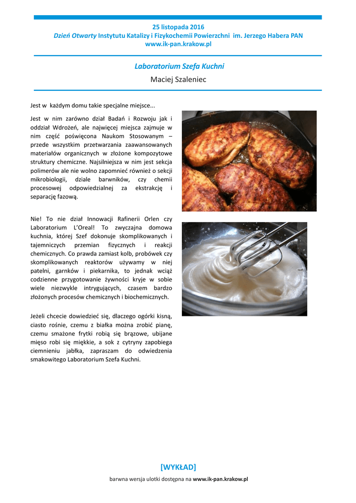 25 listopada 2016 Dzień Otwarty Instytutu Katalizy i Fizykochemii Powierzchni im. Jerzego Habera PAN www.ik‐pan.krakow.pl Laboratorium Szefa Kuchni Maciej Szaleniec Jest w każdym domu takie specjalne miejsce... Jest w nim zarówno dział Badań i Rozwoju jak i oddział Wdrożeń, ale najwięcej miejsca zajmuje w nim część poświęcona Naukom Stosowanym – przede wszystkim przetwarzania zaawansowanych materiałów organicznych w złożone kompozytowe struktury chemiczne. Najsilniejsza w nim jest sekcja polimerów ale nie wolno zapomnieć również o sekcji mikrobiologii, dziale barwników, czy chemii procesowej odpowiedzialnej za ekstrakcję i separację fazową. Nie! To nie dział Innowacji Rafinerii Orlen czy Laboratorium L’Oreal! To zwyczajna domowa kuchnia, której Szef dokonuje skomplikowanych i tajemniczych przemian fizycznych i reakcji chemicznych. Co prawda zamiast kolb, probówek czy skomplikowanych reaktorów używamy w niej patelni, garnków i piekarnika, to jednak wciąż codzienne przygotowanie żywności kryje w sobie wiele niezwykle intrygujących, czasem bardzo złożonych procesów chemicznych i biochemicznych. Jeżeli chcecie dowiedzieć się, dlaczego ogórki kisną, ciasto rośnie, czemu z białka można zrobić pianę, czemu smażone frytki robią się brązowe, ubijane mięso robi się miękkie, a sok z cytryny zapobiega ciemnieniu jabłka, zapraszam do odwiedzenia smakowitego Laboratorium Szefa Kuchni. [WYKŁAD] barwna wersja ulotki dostępna na www.ik‐pan.krakow.pl