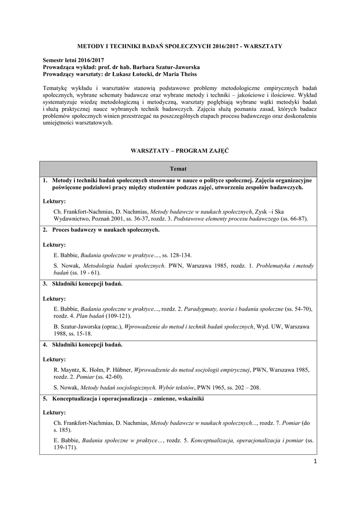 METODY I TECHNIKI BADAŃ SPOŁECZNYCH 2016/2017 - WARSZTATY Semestr letni 2016/2017 Prowadząca wykład: prof. dr hab. Barbara Szatur-Jaworska Prowadzący warsztaty: dr Łukasz Łotocki, dr Maria Theiss Tematykę wykładu i warsztatów stanowią podstawowe problemy metodologiczne empirycznych badań społecznych, wybrane schematy badawcze oraz wybrane metody i techniki – jakościowe i ilościowe. Wykład systematyzuje wiedzę metodologiczną i metodyczną, warsztaty pogłębiają wybrane wątki metodyki badań i służą praktycznej nauce wybranych technik badawczych. Zajęcia służą poznaniu zasad, których badacz problemów społecznych winien przestrzegać na poszczególnych etapach procesu badawczego oraz doskonaleniu umiejętności warsztatowych. WARSZTATY – PROGRAM ZAJĘĆ Temat 1. Metody i techniki badań społecznych stosowane w nauce o polityce społecznej. Zajęcia organizacyjne poświęcone podziałowi pracy między studentów podczas zajęć, utworzeniu zespołów badawczych. Lektury: Ch. Frankfort-Nachmias, D. Nachmias, Metody badawcze w naukach społecznych, Zysk –i Ska Wydawnictwo, Poznań 2001, ss. 36-37, rozdz. 3. Podstawowe elementy procesu badawczego (ss. 66-87). 2. Proces badawczy w naukach społecznych. Lektury: E. Babbie, Badania społeczne w praktyce…, ss. 128-134. S. Nowak, Metodologia badań społecznych. PWN, Warszawa 1985, rozdz. 1. Problematyka i metody badań (ss. 19 - 61). 3. Składniki koncepcji badań. Lektury: E. Babbie, Badania społeczne w praktyce..., rozdz. 2. Paradygmaty, teoria i badania społeczne (ss. 54-70), rozdz. 4. Plan badań (109-121). B. Szatur-Jaworska (oprac.), Wprowadzenie do metod i technik badań społecznych, Wyd. UW, Warszawa 1988, ss. 15-18. 4. Składniki koncepcji badań. Lektury: R. Mayntz, K. Holm, P. Hübner, Wprowadzenie do metod socjologii empirycznej, PWN, Warszawa 1985, rozdz. 2. Pomiar (ss. 42-60). S. Nowak, Metody badań socjologicznych. Wybór tekstów, PWN 1965, ss. 202 – 208. 5. Konceptualizacja i operacjonalizacja – zmienne, wskaźniki Lektury: Ch. Frankfort-Nachmias, D. Nachmias, Metody badawcze w naukach społecznych..., rozdz. 7. Pomiar (do s. 185). E. Babbie, Badania społeczne w praktyce…, rozdz. 5. Konceptualizacja, operacjonalizacja i pomiar (ss. 139-171). 1 6. SPRAWDZIAN WIEDZY 7. Metoda analizy treści Lektury: E. Babbie, Badania społeczne w praktyce..., rozdz. 11. Badania niereaktywne (ss. 340-353). Ch. Frankfort-Nachmias, D. Nachmias, Metody badawcze w naukach społecznych..., rozdz. 13. Wtórna analiza danych (ss. 341-348), rozdz. 14. Przygotowanie i analiza danych (ss. 350-368), Dodatek B. Zasady pisania raportu z badań (ss. 568-578). 8. Omówienie koncepcji badań z wykorzystaniem metody analizy treści Zespoły badawcze przynoszą koncepcję badań metodą analizy treści. Lektury: G. Firlit-Fesnak, Ł. Łotocki (red.), Imigranci w polskim dyskursie publicznym, Oficyna Wydawnicza ASPRA-JR, Warszawa 2014, rozdz. Ł. Łotocki, O mediach elektronicznych i metodologii ich badania (ss. 151-160). R. Wodak, M. Krzyżanowski, Jakościowa analiza dyskursu w naukach społecznych, Oficyna Wydawnicza Łośgraf, Warszawa 2011, rozdz. 2. G. Mautner, Analiza gazet, czasopism i innych mediów drukowanych (ss. 51-85). rozdz. 4. A. Pollack, Analiza telewizyjnych filmów dokumentalnych (ss. 125-148). 9. Metoda obserwacji Lektury: E. Babbie, Badania społeczne w praktyce..., rozdz. 10. Jakościowe badania terenowe (ss. 308-339). Ch. Frankfort-Nachmias, D. Nachmias, Metody badawcze w naukach społecznych..., rozdz. 9. Metody obserwacyjne (ss. 220-239). J. Sztumski, Wstęp do metod i technik badań społecznych, „Śląsk”, Katowice 1999, rozdz. 5. Obserwacja (ss. 81-86). 10. Omówienie wyników analizy treści Zespoły badawcze przygotowują raporty z analizy treści w dwóch wersjach: 1) w wersji raportu drukowanego oraz 2) w wersji prezentacji PowerPoint (zgodnie z zasadami sztuki opracowania raportu z badań). Zespoły składają raport drukowany u prowadzącego oraz prezentują grupie raport przygotowany w PowerPoint. 11. Wywiady i ankiety jako techniki stosowane w badaniach sondażowych. Budowa kwestionariusza. Lektury: Ch. Frankfort-Nachmias, D. Nachmias, Metody badawcze w naukach społecznych..., rozdz. 11. Badania sondażowe (ss. 240-265). E. Babbie, Badania społeczne w praktyce..., rozdz. 9. Badania sondażowe (ss. 267-307). 12. Omówienie koncepcji i narzędzi badawczych własnych badań sondażowych Zespoły badawcze składają i prezentują koncepcję badania sondażowego obejmującą 1) omówienie: a) przedmiotu badania, b) problematyki badawczej, c) perspektywy badawczej, d) jednostek analizy i zasady doboru próby, e) metod/technik badawczych; 2) narzędzie do badania sondażowego, obejmujące możliwie zróżnicowane formy pytań. Lektury: Podręcznik socjologicznych badań ankietowych. Praca zbior. Warszawa 1992, ss. 114-152. A. Sułek, Sondaż polski, IFIS PAN, Warszawa 2001, rozdz. A. Sułek, Jak działa kwestionariusz? Forma pytania jako źródło zmienności odpowiedzi ankietowych (ss. 143-173). 2 13. Schematy badań przekrojowych i dynamicznych Lektury: E. Babbie, Badania społeczne w praktyce..., ss. 121-127. A. Sułek (oprac.) Metody analizy socjologicznej, IS UW, Warszawa 1986, rozdz. K. Koseła, A. Sułek, Metody badania procesów społecznych (ss. 265-288). 14. Omówienie wyników pilotażu narzędzi badawczych Zespoły badawcze przynoszą min. 5 wypełnionych kwestionariuszy oraz min 1 laptop na zespół. W wersji elektronicznej: draft książki kodów oraz baza danych (Excel lub SPSS) (min. 5 kwestionariuszy zakodowanych). Ponadto zespoły przygotowują uwagi z pilotażu narzędzia oraz syntetyczną prezentację w PowerPoint zawierającą opis metody badawczej oraz wnioski z pilotażu. 15. Podsumowanie zajęć Warunki zaliczenia warsztatów: Obecność na zajęciach i przygotowanie do zajęć (znajomość literatury do danych zajęć, przygotowanie pracy domowej, jeżeli zos