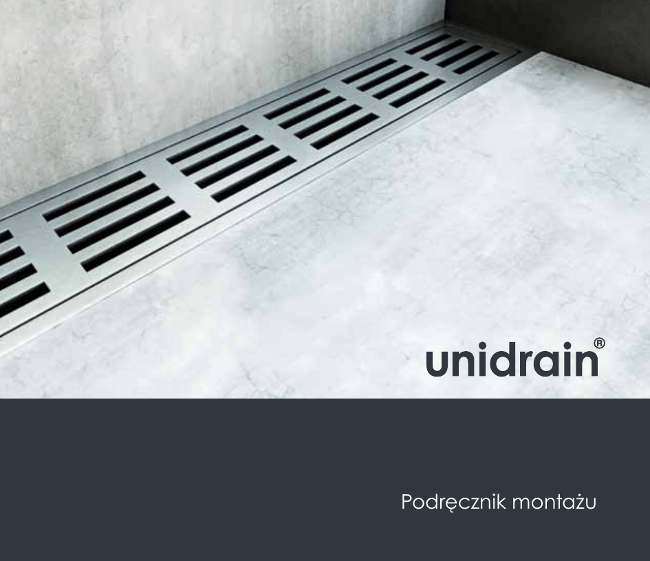 Podręcznik montażu Wymagania wstępne System unidrain ® został przetestowany i zatwierdzony dla wszystkich podłóg łazienkowych, od posadzek drewnianych do ciężkich betonowych konstrukcji. W przypadku montażu na posadzce drewnianej lub innych lekkich podłogach zalecamy użycie zestawu montażowego Unidrain. Poniższe informacje stanowią przykłady. Należy wziąć pod uwagę wszystkie obowiązujące przepisy budowlane. Metody montażu oraz materiały użyte do niego muszą być przystosowane i zatwierdzone do danego zastosowania. Aby uzyskać więcej informacji, prosimy o kontakt z dostawcą. Wyjątkowa konstrukcja Unidrain została opatentowana w Europie (1287213), natomiast w kilku krajach na świecie oczekuje na przyznanie patentu. Unidrain to zarejestrowana marka towarowa. Więcej informacji o otrzymanych zatwierdzeniach i certyfikatach znajduje się na stronie www.unidrain.pl EN 1253 EN 1253 (Zgodność z normami europejskimi dla wpustów ściekowych) Spis treści strona Parametry techniczne System Elementy zmienne Składniki Montaż nasadki odpływu i korpusu Beton Konstrukcja Umieszczenie i montaż Przygotowanie surowego betonu Przygotowywanie górnej wylewki Folia izolacyjna w płynie Wymagania wstępne Czyszczenie i usuwanie smaru Wzmacnianie i uszczelnianie brzegów Wzmacnianie i uszczelnianie (krok po kroku) Ściany Podłoga Całkowita wodoszczelność Folia izolacyjna w arkuszach Wymagania wstępne Czyszczenie Wodoodporna folia naścienna Wodoodporna folia podłogowa Wzmacnianie i uszczelnianie brzegów Wzmacnianie i uszczelnianie (krok po kroku) Całkowita wodoszczelność Układanie terakoty Wymagania wstępne Montowanie ramki Układanie płytek terakoty Uszczelnianie Kończenie montażu Stylowy wygląd 4 5 6 7 8 9 10 11 12 13 14 15 16 17 18 19 20 21 22 23 24 25 26 27 28 29 30 31 A B C D < Parametry techniczne > System Nasadki odpływu (A) o długości od 300 do 1200 mm (oraz modele narożne 200 mm). Korpusy (B) o otworach poziomych lub pionowych o średnicy 32, 50 i 75 mm z wlotami bocznymi i wymiennym syfonem. Ramki (C): Wysokość 8, 10 lub 12 mm do wszystkich rodzajów terakoty i klinkieru. Ruszty (D) o pięciu kształtach do rozwiązań liniowych oraz narożnych Sitko (należące do akcesoriów) ułatwiające czyszczenie 4 1001 1003 1100 1002 1004 2001 < Parametry techniczne > Elementy zmienne 1001: otwór z trzema ścianami 1002: otwór z dwiema ścianami, szyba lub wolne miejsce po prawej stronie 1003: otwór z dwiema ścianami, szyba lub wolne miejsce po lewej stronie 1004: otwór lub otwarta łazienka z wolnym miejscem po obu stronach 1100: system modułowy 2001: narożnik 5 4 5 3 2 1 < Parametry techniczne > Składniki 1. Nasadka odpływu 2. Korpus 3. Ramka 4. Ruszt 5. Sitko (należy do akcesoriów) 6 < Parametry techniczne > Montaż nasadki odpływu i korpusu 1. Przed rozpoczęciem montażu zdejmij syfon. 2. Zamocuj korpus, korzystając przy tym z substancji zmniejszającej tarcie (np. wody z mydłem). 3. Postępuj zgodnie z dalszymi informacjami w niniejszej instrukcji. 7 B A < Beton > Konstrukcja Podłoga: wylewka betonowa (A) wylana na betonie lub innym twardym materiale, nachylona w stronę odpływu. Ściany: ściany nośne lub ścianki działowe 8 < Beton > Umieszczenie i montaż Ustaw elementy poziomo i dokręć kołnierz naścienny tak, aby wysokość dolnego elementu kołnierza odpowiadała górnej powierzchni podłogi (tj. spodniej części terakoty). Przykręć kołnierz naścienny przy użyciu śrub o średnicy 4 mm. 9 A < Beton > Usztywnij korpus (A) i sprawdź ułożenie nasadki odpływu. Wylej surowy beton na określoną wysokość. Zwróć uwagę, aby wylać beton także pod nasadką i przy tylnej ścianie. Korpus powinien zostać w całości otoczony betonem. 10 A B < Beton > Przygotowywanie górnej wylewki Wylej wylewkę tak, aby miała nachylenie 5–10‰ w stronę odpływu, i na taką wysokość, aby była wyrównana z kołnierzem podłogowym (A). Zwróć uwagę na to, aby całkowicie wypełnić betonem miejsce pod nasadką (B). Jeśli do nasadki i do korpusu dostał się beton, usuń go. 11 A B A B < Folia izolacyjna w płynie > Wymagania wstępne Folia izolacyjna w płynie do łazienek (A) z izolacją/wzmocnieniem (B) dla wszystkich standardowych podłóg (surowy beton/wylewka/płyta podłogowa). Więcej informacji o określonych produktach i sposobie montażu można uzyskać od dostawcy wybranego rozwiązania łazienkowego. 12 < Folia izolacyjna w płynie > Czyszczenie i usuwanie smaru Nasadkę z kołnierzami należy dokładnie wyczyścić z pozostałej wylewki, kleju itd. Jeśli to konieczne, należy użyć dodatkowej wylewki lub papieru ściernego. Podłogę i kołnierze ścienne należy wyczyścić ze smaru przy użyciu alkoholu lub innej odpowiedniej substancji do usuwania smaru. 13 < Folia izolacyjna w płynie > Wzmacnianie i uszczelnianie brzegów Wszystkie miejsca styku między podłogą i kołnierzem ściennym oraz przy ścianach bocznych i podłodze należy zabezpieczyć, zostawiając szeroką zakładkę. Wewnętrzne narożniki i miejsca zakładek muszą być całkowicie uszczelnione, bez pozostawiania otworów lub rowków. 14 1 2 3 4 < Folia izolacyjna w płynie > Wzmacnianie i uszczelnianie (krok po kroku) Procedura dotycząca wzmacniania i uszczelniania brzegów wokół nasadki. Aby uzyskać szczegółowe informacje, zapoznaj się z instrukcją producenta. 15 10 mm < Folia izolacyjna w płynie > Ściany Folię izolacyjną w płynie należy nałożyć na ścianę przy użyciu wałka, pędzla lub szpachlówki zgodnie z instrukcjami producenta. Folia powinna być nakładana z uszczelnieniem/izolacją brzegu na przynajmniej 10 mm. 16 10 mm < Folia izolacyjna w płynie > Podłoga Folię izolacyjną w płynie należy analogicznie nałożyć na podłogę przy użyciu wałka, pędzla lub szpachlówki zgodnie z instrukcjami producenta. Folia powinna być nakładana z uszczelnieniem/ izolacją brzegu na przynajmniej 10 mm. 17 <
