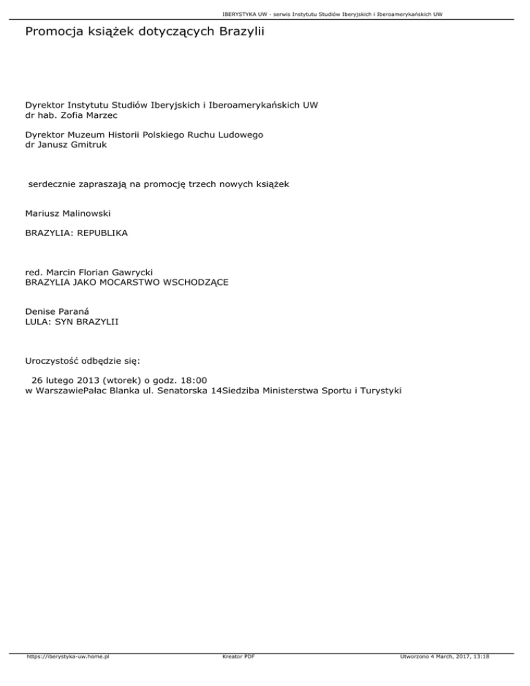 IBERYSTYKA UW - serwis Instytutu Studiów Iberyjskich i Iberoamerykańskich UW Promocja książek dotyczących Brazylii Dyrektor Instytutu Studiów Iberyjskich i Iberoamerykańskich UW dr hab. Zofia Marzec Dyrektor Muzeum Historii Polskiego Ruchu Ludowego dr Janusz Gmitruk serdecznie zapraszają na promocję trzech nowych książek Mariusz Malinowski BRAZYLIA: REPUBLIKA red. Marcin Florian Gawrycki BRAZYLIA JAKO MOCARSTWO WSCHODZĄCE Denise Paraná LULA: SYN BRAZYLII Uroczystość odbędzie się: 26 lutego 2013 (wtorek) o godz. 18:00 w WarszawiePałac Blanka ul. Senatorska 14Siedziba Ministerstwa Sportu i Turystyki https://iberystyka-uw.home.pl Kreator PDF Utworzono 4 March, 2017, 13:18