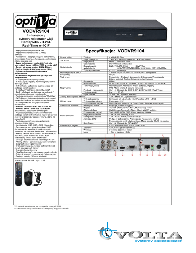 VODVR9104 4 - kanałowy cyfrowy rejestrator wizji Pentapleks - H.264 Real-Time w 4CIF - Algorytm kompresji wideo H.264 - Algorytm kompresji audio G.711U, 64K/sek. - Pentapleks – podgląd na żywo, odtwarzanie, archiwizacja lokalna, odtwarzanie i archiwizacja zdalna poprzez sieć - Zapis jednoczesny maks. 25kl/sek. dla wszystkich kamer - REAL-TIME w rozdz. 4CIF - Dualny strumień wideo: MAIN-Główny (Zapis & Sieć) / SUB-Podstrumień (Sieć) - Odtwarzanie wszystkich kanałów jednocześnie - Blokowanie fragmentów nagrań przed nadpisaniem - 6 stopni jakości kompresji obrazu - 4 tryby zapisu: ręczny, harmonogram, wideodetekcja, alarm - Indywidualne ustawienia audio & wideo dla każdego kanału osobno - 4 strefy prywatności na każdy kanał - CMS – Aplikacja centralnego zarządzania i monitoringu kilkunastu rejestratorów - Funkcja sieciowego „wielodostępu” MultiCast - PRE-Alarm – buforowanie i rejestracja nagrań nawet do 5 sekund sprzed wzbudzenia zapisu - zoom cyfrowy dla podglądu na żywo i odtwarzania - Monitor Główny – BNC lub VGA/HDMI - Monitor SPOT – BNC lub VGA/HDMI zarządzany z podziałami ekranowymi - Regulacja jasności, koloru i kontrastu dla każdego kanału indywidualnie, nawet dla dwóch różnych przedziałów czasowych (np. różne na noc i dzień) - Funkcja automatycznego przełączania sekwencyjnego kamer - Archiwizacja: USB, HDD, CMS, Klient Siec. - Rozszerzone zarządzanie dyskami HDD: formatowanie, weryfikacja uszkodzonych sektorów, zarządzanie zasilaniem i temperaturą - Alarmy lokalne: zanik obrazu, wideo-detekcja, błąd HDD, brak miejsca na dysku HDD, uszkodzony sektor HDD, błąd wideo - Obsługa strumieniowania sieciowego RTSP - Alarmy zdalne - zanik obrazu, wideo-detekcja - Diagnostyka obciążenia sieci - Wzbudzanie zapisu z wideo-detekcji również innych powiązanych kamer - Intercom komunikacyjny - Notyfikacja e-mail – typ, numer kanału, zdjęcie - Dziennik zdarzeń systemowych i alarmowych - Podgląd mobilny (IPhone, Android) Specyfikacja: VODVR9104 Sygnał wideo Tor audio Wyświetlanie Wejścia Wejścia/wejścia Nagrywanie Odświeżanie Rozdzielczość wyświetlania Tryby wyświetlania Monitor główny & SPOT System OS Tryb pracy Kompresja Rozdzielczość Tryby nagrywania Nagrywanie Prędkoś nagrywania Wielkość klatki Dyski twarde Zdalny dostęp przez Internet Tryb odtwarzania Odtwarzanie Tryb podziału ekranu Wyszukiwanie nagrań Sterowanie alarmem Reakcja na Alarm Wyjście Zdalne obsługa Przeglądarka nagrań Nagrywanie lokalne Praca sieciowa Konfiguracja zdalna Aplikacja CMS Sub-Stream Archiwizacja nagrań W standardzie Pilot IR i Mysz USB: * Urządzenie sprzedawane jest bez dysków twardych HDD ** Dane techniczne podane w karcie katalogowej mogę ulec zmianie Zasilanie Wymiary Masa 4 x BNC 75 Ohm 1 x RCA (Line In / Intercom) / 1 x RCA (Line Out) Mono G.711U 64K / sek. Do 100 klatek (4 kanałów) BNC: 720x576 (PAL) HDMI/VGA: 1024x768/1280x720/1280x1024/1600x1200/1920x1080p x1, 2x2, sekwencja 1 x BNC 1Vpp 75Ohm & 1x VGA/HDMI – Zarządzane RTOS Pentapleks – Podgląd, Nagrywanie, Odtwarzanie/Archiwizacja, Zdalny podgląd, Zdalne Odtwarzanie/Archiwizacja H.264 QCIF: 176x144 / CIF: 360x288 / 2CIF: 720x288 / 4CIF: 720x576 Harmonogram, Alarmowy, Wideo-detekcja, Ręczny PRE-Alarm (maks. 5 sekund na kanał) Ch 1~4: 25kl/sek dla QCIF & CIF & 2CIF & 4CIF (Real-Time) PAL : 2 ~ 20 KB 1x HDD SATA (maks. 4TB/szt) TAK – Maks. 14 Użytkowników Szybkość: x1, x2, x4, x8, 16x / Powolne: x1/2 ~ x1/64 Pojedynczy, 2x2 Num. Kanału, Kalendarza, Daty i Czasu, Zdarzeń alarmowych Brzęczyk, E-Mail (+zdjęcie) TCP/IP, SNMP, DHCP, NTP, Multicasting, RTSP CMS(Serwer/Terminal), Zdalny Klient, WWW, Mobilny TAK – USB, HDD, CMS, Klient sieciowy, WWW TAK – Klient sieciowy, CMS TAK – CMS, WWW, Klient sieciowy Podgląd, Odtwarzanie, Archiwizacja, Nagrywanie lokalne Personalizacja profili użytkowników, Maks. podział 10x10 na monitor Ch 1~8: 25kl/sek dla CIF & QCIF CMS, Klient sieciowy, WWW, USB, HDD 12VDC / 4A (z dyskiem HDD) 315mm x 230mm x 45mm ~ 3kg (z dyskiem HDD)