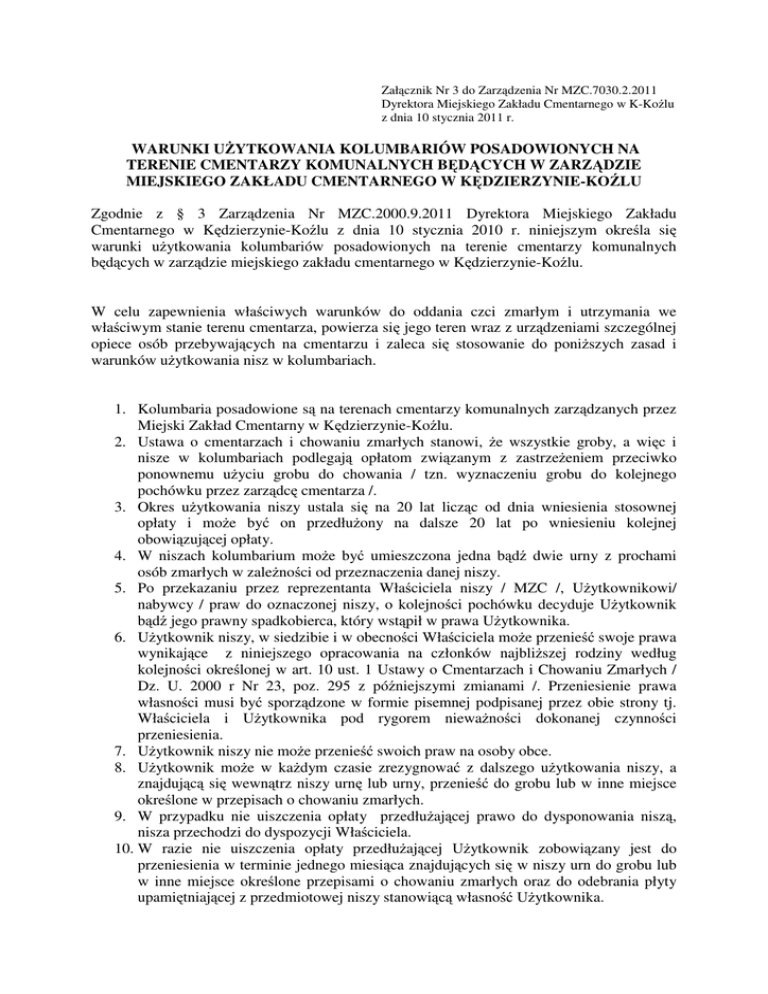 Załącznik Nr 3 do Zarządzenia Nr MZC.7030.2.2011 Dyrektora Miejskiego Zakładu Cmentarnego w K-Koźlu z dnia 10 stycznia 2011 r. WARUNKI UŻYTKOWANIA KOLUMBARIÓW POSADOWIONYCH NA TERENIE CMENTARZY KOMUNALNYCH BĘDĄCYCH W ZARZĄDZIE MIEJSKIEGO ZAKŁADU CMENTARNEGO W KĘDZIERZYNIE-KOŹLU Zgodnie z § 3 Zarządzenia Nr MZC.2000.9.2011 Dyrektora Miejskiego Zakładu Cmentarnego w Kędzierzynie-Koźlu z dnia 10 stycznia 2010 r. niniejszym określa się warunki użytkowania kolumbariów posadowionych na terenie cmentarzy komunalnych będących w zarządzie miejskiego zakładu cmentarnego w Kędzierzynie-Koźlu. W celu zapewnienia właściwych warunków do oddania czci zmarłym i utrzymania we właściwym stanie terenu cmentarza, powierza się jego teren wraz z urządzeniami szczególnej opiece osób przebywających na cmentarzu i zaleca się stosowanie do poniższych zasad i warunków użytkowania nisz w kolumbariach. 1. Kolumbaria posadowione są na terenach cmentarzy komunalnych zarządzanych przez Miejski Zakład Cmentarny w Kędzierzynie-Koźlu. 2. Ustawa o cmentarzach i chowaniu zmarłych stanowi, że wszystkie groby, a więc i nisze w kolumbariach podlegają opłatom związanym z zastrzeżeniem przeciwko ponownemu użyciu grobu do chowania / tzn. wyznaczeniu grobu do kolejnego pochówku przez zarządcę cmentarza /. 3. Okres użytkowania niszy ustala się na 20 lat licząc od dnia wniesienia stosownej opłaty i może być on przedłużony na dalsze 20 lat po wniesieniu kolejnej obowiązującej opłaty. 4. W niszach kolumbarium może być umieszczona jedna bądź dwie urny z prochami osób zmarłych w zależności od przeznaczenia danej niszy. 5. Po przekazaniu przez reprezentanta Właściciela niszy / MZC /, Użytkownikowi/ nabywcy / praw do oznaczonej niszy, o kolejności pochówku decyduje Użytkownik bądź jego prawny spadkobierca, który wstąpił w prawa Użytkownika. 6. Użytkownik niszy, w siedzibie i w obecności Właściciela może przenieść swoje prawa wynikające z niniejszego opracowania na członków najbliższej rodziny według kolejności określonej w art. 10 ust. 1 Ustawy o Cmentarzach i Chowaniu Zmarłych / Dz. U. 2000 r Nr 23, poz. 295 z późniejszymi zmianami /. Przeniesienie prawa własności musi być sporządzone w formie pisemnej podpisanej przez obie strony tj. Właściciela i Użytkownika pod rygorem nieważności dokonanej czynności przeniesienia. 7. Użytkownik niszy nie może przenieść swoich praw na osoby obce. 8. Użytkownik może w każdym czasie zrezygnować z dalszego użytkowania niszy, a znajdującą się wewnątrz niszy urnę lub urny, przenieść do grobu lub w inne miejsce określone w przepisach o chowaniu zmarłych. 9. W przypadku nie uiszczenia opłaty przedłużającej prawo do dysponowania niszą, nisza przechodzi do dyspozycji Właściciela. 10. W razie nie uiszczenia opłaty przedłużającej Użytkownik zobowiązany jest do przeniesienia w terminie jednego miesiąca znajdujących się w niszy urn do grobu lub w inne miejsce określone przepisami o chowaniu zmarłych oraz do odebrania płyty upamiętniającej z przedmiotowej niszy stanowiącą własność Użytkownika. 11. W przypadku nie wykonania powyższego, Właściciel przeniesie Urnę z prochami do mogiły zbiorowej, a płytę upamiętniającą do pojemnika na gruz. 12. Przy każdym pochówku Właściciel pobiera stosowne należności związane z pochówkiem w niszy kolumbarium wynikające z aktualnego cennika opłat. 13. Przygotowanie niszy urnowej do pogrzebu polegające na zdjęciu granitowej płyty upamiętniającej lub tymczasowej płyty zabezpieczającej niszę wykonuje, Właściciel kolumbarium bądź inny wskazany podmiot na zlecenie Użytkownika za stosowną opłatą. 14. Zabezpieczenie niszy po wykonanym pogrzebie, tymczasową płytą zabezpieczającą bądź granitową płytą upamiętniającą wykonuje Właściciel kolumbarium niezwłocznie po ceremonii pogrzebowej. 15. Uszczelnienie przed wilgocią niszy wykonuje podmiot wskazany przez Użytkownika. 16. Upamiętnienie osoby zmarłej na docelowej płycie zamykającej niszę może być wykonanie na zamontowanej płycie granitowej /cmentarz „Koźle” / bądź dowolnej / cmentarz „Kuźniczka” /. 17. Wymiary płyt zamykających nisze urnowe nie mogą przekroczyć wymiarów zewnętrznych bądź wewnętrznych poszczególnych nisz. 18. Zabrania się wykonywanie półek na znicze, wazonów na kwiaty poza obrysem płyt upamiętniających. 19. Niedozwolone jest naruszanie nisz w kolumbariach / otwieranie, niszczenie, itp. /. 20. Uschnięte wieńce, kwiaty oraz inne zbędne elementy związane z dekoracją niszy, należy składać do przeznaczonych na ten cel pojemników. 21. Roboty kamieniarskie na cmentarzu mogą wykonywać wszystkie uprawnione podmioty, po otrzymaniu stosownego zlecenia od Użytkownika i otrzymaniu zgody od Właściciela. 22. Roboty kamieniarskie mogą być wykonywane wyłącznie w godzinach funkcjonowania MZC. 23. Wykonawca robót kamieniarskich ponosi wszelką odpowiedzialność, także materialną, za wszelkie wyrządzone szkody na mieniu MZC oraz na mieniu innych właścicieli grobów i nagrobków będących wynikiem jego działania. 24. Upoważniony pracownik MZC ma prawo przerwać prowadzone prace jeżeli stwierdzi naruszenie warunków i zasad określonych w niniejszym opracowaniu lub innych regulacji obowiązujących na cmentarzu. 25. Przestrzeganie tych przepisów leży w interesie korzystających z nekropolii. Ubezpieczenie majątkowe zarządcy i Właściciela cmentarza nie obejmuje praw majątkowych związanych z własnością poszczególnych Użytkowników nisz w kolumbariach. 26. Nadzór nad funkcjonowaniem kolumbariów posadowionych na terenie nekropolii zarządzanych przez MZC w Kędzierzynie-Koźlu sprawuje jego dyrektor, który przyjmuje interesantów w godzinach funkcjonowania MZC. 27. Skargi i wnioski przyjmuje dyrektor MZC w siedzibie zakładu w Kędzierzynie-Koźlu przy ul Bałty