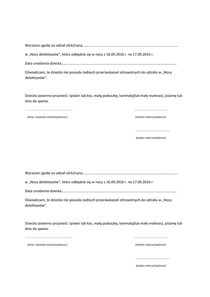 Wyrażam zgodę na udział córki/syna…………………………………………………………………………………………….. w „Nocy detektywów”, która odbędzie się w nocy z 16.09.2016 r. na 17.09.2016 r. Data urodzenia dziecka………………………………………………………………………………………………………………… Oświadczam, że dziecko nie posiada żadnych przeciwskazań zdrowotnych do udziału w „Nocy detektywów”. Dziecko powinno przynieść: śpiwór lub koc, małą poduszkę, karimatę(lub mały materac), piżamę lub dres do spania. ………………………………………………………………. (imię i nazwisko rodzica/opiekuna ) …………………………………………… (telefon rodzica/opiekuna) …………………………………………….. (podpis rodzica/opiekuna) Wyrażam zgodę na udział córki/syna…………………………………………………………………………………………….. w „Nocy detektywów”, która odbędzie się w nocy z 16.09.2016 r. na 17.09.2016 r. Data urodzenia dziecka………………………………………………………………………………………………………………… Oświadczam, że dziecko nie posiada żadnych przeciwskazań zdrowotnych do udziału w „Nocy detektywów”. Dziecko powinno przynieść: śpiwór lub koc, małą poduszkę, karimatę(lub mały materac), piżamę lub dres do spania. ………………………………………………………………. (imię i nazwisko rodzica/opiekuna ) …………………………………………… (telefon rodzica/opiekuna) …………………………………………….. (podpis rodzica/opiekuna)