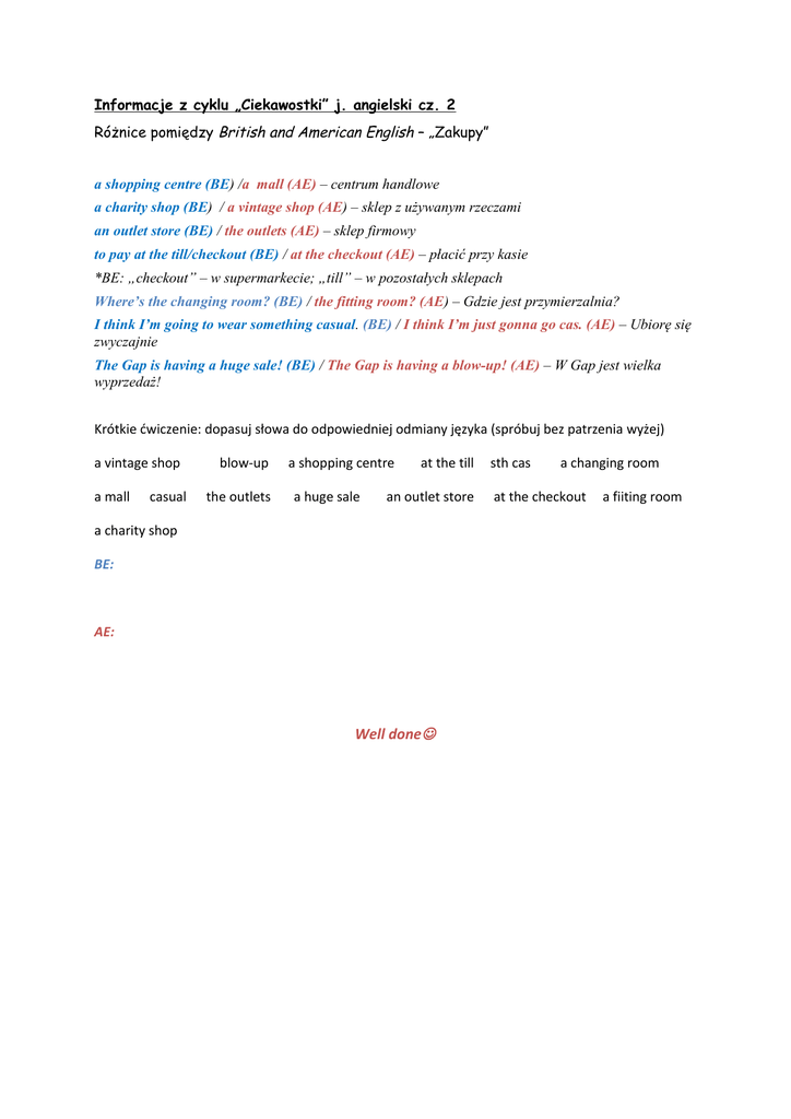 Informacje z cyklu „Ciekawostki” j. angielski cz. 2 Różnice pomiędzy British and American English – „Zakupy” a shopping centre (BE) /a mall (AE) – centrum handlowe a charity shop (BE) / a vintage shop (AE) – sklep z używanym rzeczami an outlet store (BE) / the outlets (AE) – sklep firmowy to pay at the till/checkout (BE) / at the checkout (AE) – płacić przy kasie *BE: „checkout” – w supermarkecie; „till” – w pozostałych sklepach Where’s the changing room? (BE) / the fitting room? (AE) – Gdzie jest przymierzalnia? I think I’m going to wear something casual. (BE) / I think I’m just gonna go cas. (AE) – Ubiorę się zwyczajnie The Gap is having a huge sale! (BE) / The Gap is having a blow-up! (AE) – W Gap jest wielka wyprzedaż! Krótkie ćwiczenie: dopasuj słowa do odpowiedniej odmiany języka (spróbuj bez patrzenia wyżej) a vintage shop a mall casual blow-up the outlets a shopping centre a huge sale at the till an outlet store a charity shop BE: AE: Well done sth cas a changing room at the checkout a fiiting room