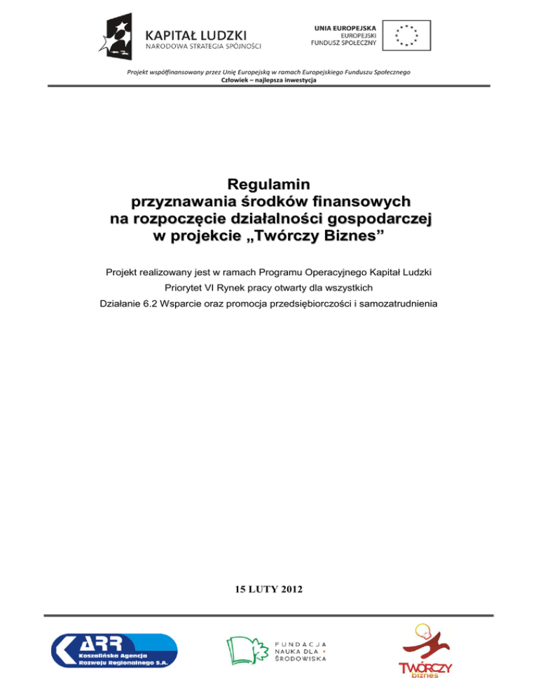 Projekt współfinansowany przez Unię Europejską w ramach Europejskiego Funduszu Społecznego Człowiek – najlepsza inwestycja Regulamin przyznawania środków finansowych na rozpoczęcie działalności gospodarczej w projekcie „Twórczy Biznes” Projekt realizowany jest w ramach Programu Operacyjnego Kapitał Ludzki Priorytet VI Rynek pracy otwarty dla wszystkich Działanie 6.2 Wsparcie oraz promocja przedsiębiorczości i samozatrudnienia 15 LUTY 2012 Projekt współfinansowany przez Unię Europejską w ramach Europejskiego Funduszu Społecznego Człowiek – najlepsza inwestycja Słownik pojęć Lista skrótów używanych w niniejszym dokumencie: Projekt – projekt „TWÓRCZY BIZNES” realizowany w ramach Programu Operacyjnego Kapitał Ludzki, Priorytet VI Rynek pracy otwarty dla wszystkich, Działanie 6.2 Wsparcie oraz promocja przedsiębiorczości i samozatrudnienia, Projektodawca – Koszalińska Agencja Rozwoju Regionalnego Spółka Akcyjna wraz z partnerem Fundacją Nauka dla Środowiska, Wykonawca projektu – podmiot świadczący usługi w ramach niniejszego projektu, Kandydat na uczestnika projektu – osoba fizyczna, która złożyła formularz zgłoszeniowy do Projektu, Dzień przystąpienia do projektu - dzień podpisania przez Kandydata na uczestnika projektu Deklaracji uczestnictwa w projekcie, Uczestnik Projektu – osoba fizyczna, która podpisała deklarację uczestnictwa w projekcie, Strona internetowa Projektodawcy (strona WWW) – strona, na której będą umieszczane informacje dotyczące projektu, tj. www.karrsa.pl, www.ndsfund.org, Biuro Projektu – siedziba Projektodawcy w Koszalinie: ul. Przemysłowa 8, 75-216 Koszalin, Punkt Obsługi – punkt naboru dokumentów aplikacyjnych w Drawsku Pomorskim uruchomiony na czas rekrutacji w Urzędzie Miejskim przy ul. Dworcowej 1 w godzinach 10-14, Punkt Konsultacyjny – w ramach projektu funkcjonować będzie punkt obsługi uczestników projektu, tj. punkt zlokalizowany w siedzibie Projektodawcy ul. Przemysłowa 8 w Koszalinie, Dokumenty aplikacyjne – formularz rekrutacyjny, Komisja Rekrutacyjna – powołana przez Projektodawcę komisja, której zadaniem jest dokonanie wyboru uczestników projektu spośród wszystkich kandydatów na podstawie ściśle określonych kryteriów, Komisja Oceny Wniosków (KOW) – powołana przez Projektodawcę komisja, której zadaniem jest dokonanie oceny formalnej i merytorycznej Wniosków o przyznanie wsparcia finansowego, podstawowego i przedłużonego wsparcia pomostowego. Ocena wniosków dokonywana jest w oparciu o Regulamin Komisji Oceny Wniosków sporządzony przez Projektodawcę, Godzina szkoleniowa – 1 godzina lekcyjna, tj. 45 minut, Godzina doradcza – 1 godzina zegarowa, tj. 60 minut, CEIDG – Centralna Ewidencja i Informacja o Działalności Gospodarczej Osoba bezrobotna - oznacza to osobę bezrobotną w rozumieniu Ustawy z dnia 20 kwietnia 2004 r. o promocji zatrudnienia i instytucjach rynku pracy (Dz. U. Nr 99 z 2004 r., Póz. 1001, z póz. zm.), w szczególności osobę: a) niezatrudnioną i nie wykonującą innej pracy zarobkowej, zdolną i gotową do podjęcia zatrudnienia, b) nie uczącą się w szkole, z wyjątkiem szkół dla dorosłych lub szkół wyższych w systemie wieczorowym albo zaocznym, Projekt współfinansowany przez Unię Europejską w ramach Europejskiego Funduszu Społecznego Człowiek – najlepsza inwestycja c) zarejestrowaną we właściwym dla miejsca zameldowania stałego lub czasowego powiatowym urzędzie pracy, d) która ukończyła 18 lat, e) nie osiągnęła wieku emerytalnego, o którym mowa w art. 24 ust. 1a i 1b oraz w art. 27 ust. 2 i 3 ustawy z dnia 17 grudnia 1998 r. o emeryturach i rentach z Funduszu Ubezpieczeń Społecznych (Dz. U. z 2009 r. Nr 153, poz. 1227, z późn. zm.2)), Osoba nieaktywna zawodowo - oznacza osobę pozostającą bez zatrudnienia, która jednocześnie nie zalicza się do kategorii osób bezrobotnych, Osoba zatrudniona (pracująca) - oznacza osobę zatrudnioną w rozumieniu Kodeksu pracy, w szczególności pozostającą w stosunku pracy na podstawie umowy o pracę, powołania, wyboru, mianowania oraz spółdzielczej umowy o prace lub Kodeksu Cywilnego, w szczególności w zakresie umów cywilno - prawnych (umowy zlecenia, umowy o dzieło). §1 Postanowienia ogólne 1. Regulamin określa zasady udzielania wsparcia dla uczestników projektu „Twórczy Biznes” realizowanego przez Koszalińską Agencję Rozwoju Regionalnego S.A. wraz z partnerem Fundacją Nauka dla Środowiska w ramach Działania 6.2 Wsparcie oraz promocja przedsiębiorczości i samozatrudnienia Programu Operacyjnego Kapitał Ludzki. 2. Projekt realizowany jest w terminie od 1 grudnia 2012 r. do 28 lutego 2015 r. na terenie województwa zachodniopomorskiego. §2 Sposób informowania o Projekcie 1. Informacje o Projekcie dostępne są na stronie internetowej www.karrsa.pl, www.ndsfund.org oraz w Biurze Projektu w Koszalinie przy ul. Przemysłowej 8. §3 Wsparcie szkoleniowo-doradcze 1. Wsparcie szkoleniowo-doradcze zostanie udzielone Uczestnikowi Projektu na podstawie Umowy na świadczenie usług szkoleniowo - doradczych zawartej pomiędzy Projektodawcą a Uczestnikiem Projektu, którego załącznik stanowi Indywidualny Plan Rozwoju zawierający co najmniej: zakres tematyczny szkoleń i doradztwa dostosowany do prowadzenia działalności gospodarczej przez Uczestnika Projektu, liczbę godzin przypadających na poszczególne tematy z podziałem na szkolenia oraz doradztwo indywidualne i grupowe, łączną liczbę godzin wsparcia szkoleniowo-doradczego. Projekt współfinansowany przez Unię Europejską w ramach Europejskiego Funduszu Społecznego Człowiek – najlepsza inwestycja 2. Wsparcie szkoleniowo - doradcze dzieli się na: wsparcie podstawowe – udzielane od dnia rozpoczęcia przez Uczestnika udziału w Projekcie: szkolenia o charakterze ogólnym - w wymiarze 64 godzin szkoleniowych pozwolą uzyskać m.in. wiedzę z zakresu rejes