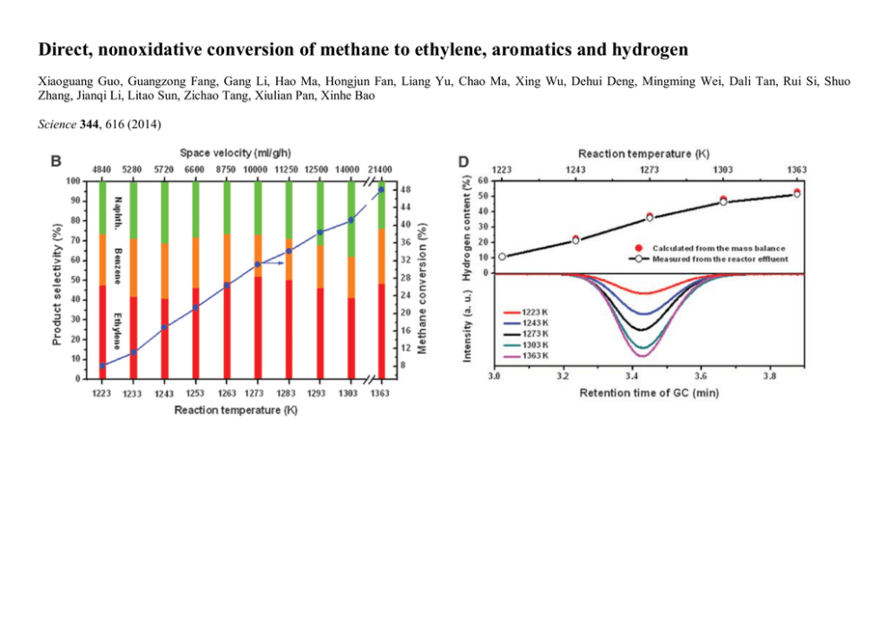 Direct, nonoxidative conversion of methane to ethylene, aromatics and hydrogen Xiaoguang Guo, Guangzong Fang, Gang Li, Hao Ma, Hongjun Fan, Liang Yu, Chao Ma, Xing Wu, Dehui Deng, Mingming Wei, Dali Tan, Rui Si, Shuo Zhang, Jianqi Li, Litao Sun, Zichao Tang, Xiulian Pan, Xinhe Bao Science 344, 616 (2014)