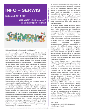 0 listopad 2014 (88) OM NSZZ „Solidarność” w Volkswagen Poznań Koleżanki i Koledzy, Członkowie „Solidarności”, ten rok, a szczególnie ostatnie dni przynoszą wiele doświadczeń, które będą miały wpływ na dalsze funkcjonowanie VWP, organizacji i będą kształtowały atmosferę następnych tygodni. Wszystkich interesuje wynik negocjacji płacowych, naturalnym jest, że każdy chce godnie zarabiać oraz oczekuje wzrostu swojego wynagrodzenia. W poniedziałek 27 października odbyła się już siódma runda rozmów, która zakończyła się ponownie wynikiem zerowym. Jeszcze nigdy nie było tak trudnych i złożonych tematów. My oczekujemy realizacji 12 punktów zapisanych w uchwale, które szerzej komentowałem na wrześniowym spotkaniu z Załogą. Zarząd m.in. chce mieć możliwość wprowadzenia systemów zmianowych w zakładach budowy samochodów. Zdecydowana większość pracowników i przełożonych przekazuje nam, że powinniśmy bronić takiego systemu pracy jaki funkcjonuje do tej pory. Reprezentujemy takie głosy dlatego nie ma naszej zgody na wprowadzenie systemów zmianowych! W tym miejscu apeluje do wszystkich, aby nie słuchali plotek, nie ma żadnych uzgodnień, dopóki nie będzie podpisane jakiekolwiek porozumienie nie można mówić, że cokolwiek zostało ustalone. Jak tylko dojdzie do uzgodnień niezwłocznie poinformujemy o tym wszystkich pracowników. Poprzednie porozumienie podpisaliśmy na grudniowym spotkaniu z Załogą, chcielibyśmy zakończyć negocjacje również w tym roku w tym samym czasie. Ważne, żeby wszyscy pracownicy podczas świąteczno-noworocznego odpoczynku wiedzieli o ile więcej będą zarabiać, jakie otrzymają premie, bonusy i dodatki. Jednak patrząc na tempo rozmów, trudność tematów, przeciwnie, już zastanawiamy się nad formami protestów. WYDANIE SPECJALNE INFO – SERWIS W budowie samochodów mieliśmy ostatnio do czynienia z przerwami w produkcji, już powoli kończą się możliwości odrabiania strat. Jak pisałem w poprzednim liście już nie będzie naszej zgody na nadgodziny w soboty na popołudniowej zmianie po to by ratować tegoroczny plan! To co wydarzyło się przed przerwą urlopową było incydentalne, a dodatkowe zmiany odbyły się tylko dlatego, że straty spowodowane były przez nikogo nie zawinione awarie. W ubiegły piątek prawie tysięczna Załoga MAN Bus Sady dowiedziała się, że ich miejsca pracy będą przenoszone do Starachowic, oddalonego o ok. 400 km. Tylko przestrzegając zasady jednej silnej reprezentacji pracowników można stosować koncernową idee współdecydowania i współodpowiedzialności, dzięki której można skutecznie przeciwstawiać się takim sytuacjom, tylko wówczas można zachować równowagę pomiędzy przedsiębiorstwem a dobrem pracowników, co prowadzi do stabilnych miejsc pracy, na których pracownicy otrzymują atrakcyjne wynagrodzenia. W Volkswagen Poznań prowadzimy dialog w taki sposób, że nie tylko utrzymywaliśmy miejsca pracy w sytuacjach kryzysowych, ale mamy też dobrą perspektywę rozwoju, czego przykładem jest nowy zakład Craftera pod Wrześnią. Pan Prezes Ocksen mówił pracownikom w MAN w Sadach, że będą mogli dostać ofertę pracy w Volkswagen Poznań. Ja mówiłem, że stoimy na stanowisku, również na poziomie Światowej i Europejskiej Rady Zakładowej Koncernu VW, że nie można z uśmiechem przecinać wstęg otwierając kolejne fabryki, a jednocześnie nie zabezpieczać miejsc pracy naszych koleżanek i kolegów z innych zakładów z 12 marek Koncernu VW - na tym polega prawdziwa Solidarność! Pracownicy MAN Bus Sady to świetni fachowcy w branży motoryzacyjnej, dlatego uważamy że większości z nich znajdzie zatrudnienie w zakładach VWP, będą też członkami naszej Solidarności. Zapraszałem ich, żeby ją współtworzyć oraz obiecałem, że przekaże Załodze VWP, żeby przyjąć ich jak najlepiej, że po podpisaniu umowy o pracę będą takimi samymi pracownikami jak wszyscy inni w "Świecie Volkswagena"! Piotr Olbryś Przewodniczący OM NSZZ „Solidarność” w Volkswagen Poznań Kontakt: M. Kubska, tel. (61) 887 2094, e-mail: [email protected]