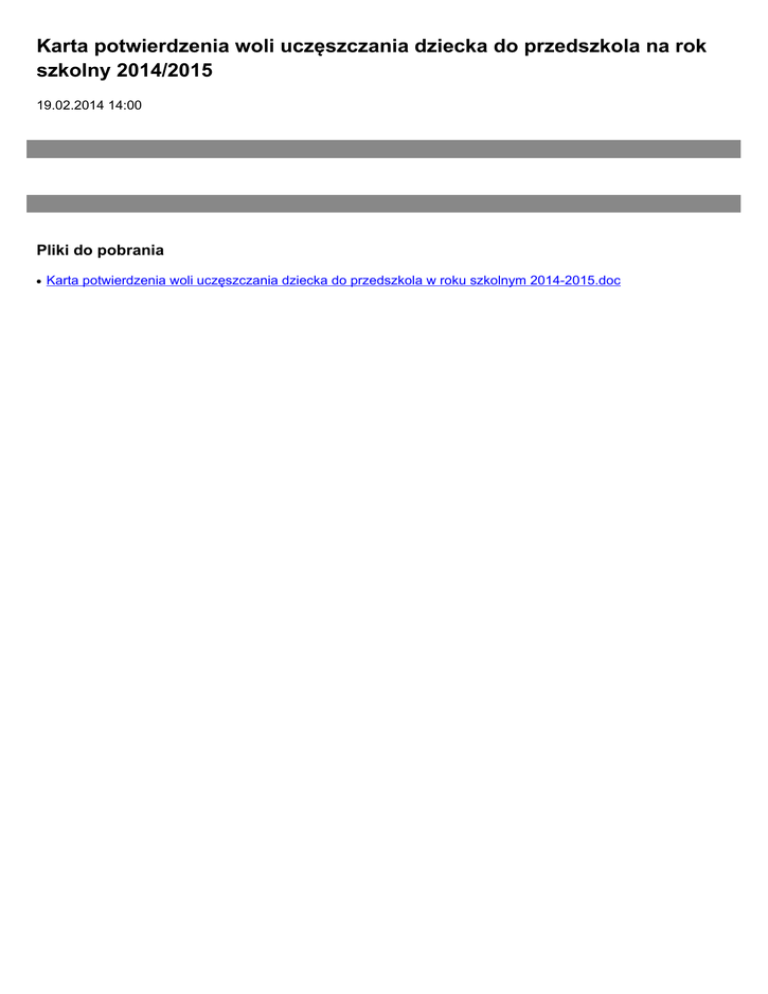 Karta potwierdzenia woli uczęszczania dziecka do przedszkola na rok szkolny 2014/2015 19.02.2014 14:00 Pliki do pobrania ● Karta potwierdzenia woli uczęszczania dziecka do przedszkola w roku szkolnym 2014-2015.doc