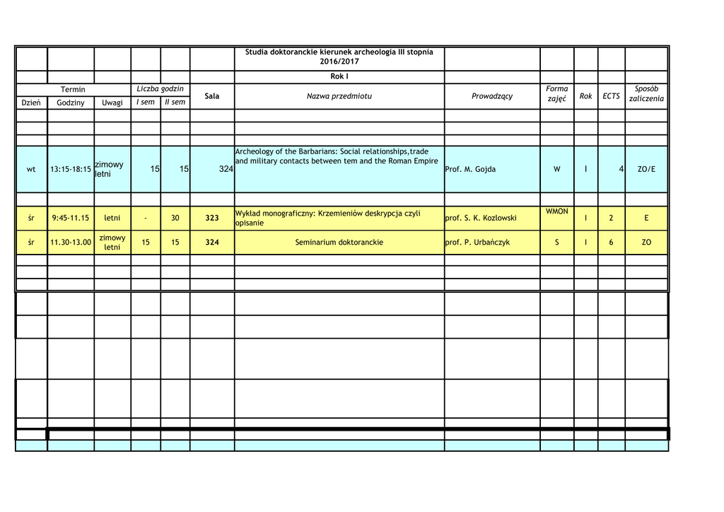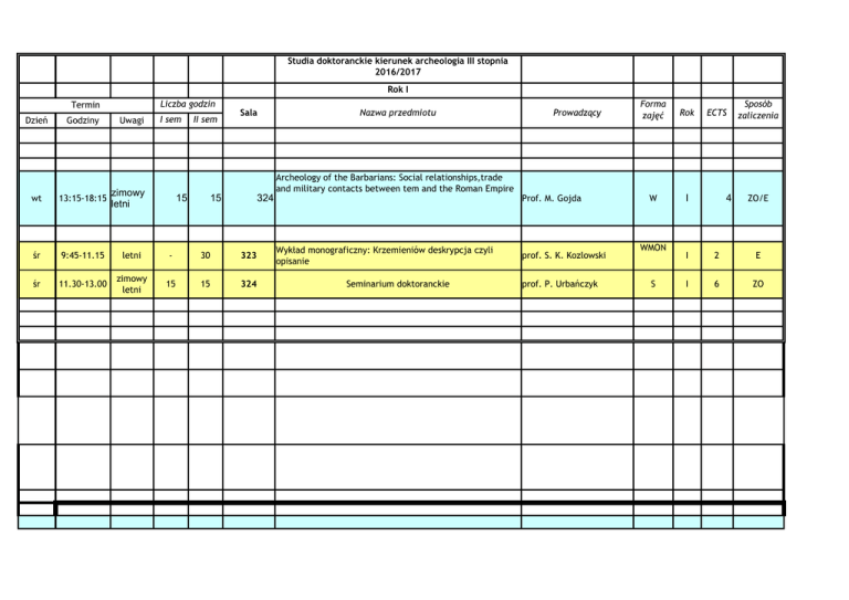 Studia doktoranckie kierunek archeologia III stopnia 2016/2017 Rok I Liczba godzin Termin Dzień Godziny Uwagi I sem zimowy letni II sem 15 Sala 15 324 wt 13:15-18:15 śr 9:45-11.15 letni - 30 323 śr 11.30-13.00 zimowy letni 15 15 324 Nazwa przedmiotu Archeology of the Barbarians: Social relationships,trade and military contacts between tem and the Roman Empire Wykład monograficzny: Krzemieniów deskrypcja czyli opisanie Seminarium doktoranckie Prowadzący Prof. M. Gojda prof. S. K. Kozlowski prof. P. Urbańczyk Forma zajęć Rok W I WMON S ECTS 4 Sposób zaliczenia ZO/E I 2 E I 6 ZO
