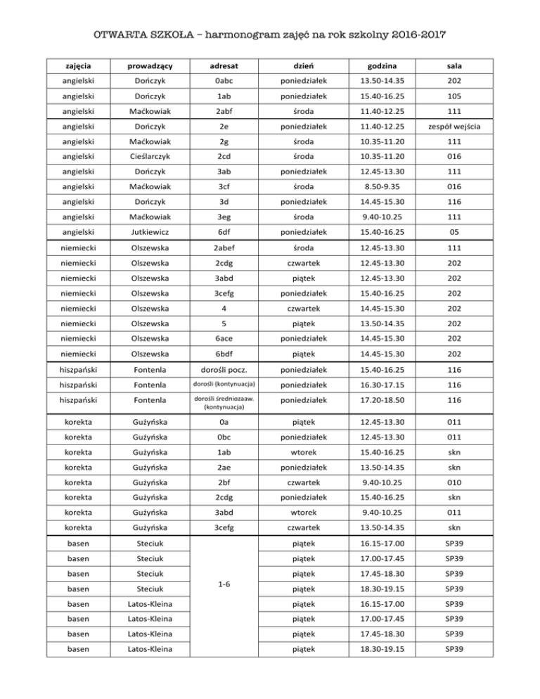 OTWARTA SZKOŁA – harmonogram zajęć na rok szkolny 2016-2017 zajęcia prowadzący adresat dzień godzina sala angielski Dończyk 0abc poniedziałek 13.50-14.35 202 angielski Dończyk 1ab poniedziałek 15.40-16.25 105 angielski Maćkowiak 2abf środa 11.40-12.25 111 angielski Dończyk 2e poniedziałek 11.40-12.25 zespółwejścia angielski Maćkowiak 2g środa 10.35-11.20 111 angielski Cieślarczyk 2cd środa 10.35-11.20 016 angielski Dończyk 3ab poniedziałek 12.45-13.30 111 angielski Maćkowiak 3cf środa 8.50-9.35 016 angielski Dończyk 3d poniedziałek 14.45-15.30 116 angielski Maćkowiak 3eg środa 9.40-10.25 111 angielski Jutkiewicz 6df poniedziałek 15.40-16.25 05 niemiecki Olszewska 2abef środa 12.45-13.30 111 niemiecki Olszewska 2cdg czwartek 12.45-13.30 202 niemiecki Olszewska 3abd piątek 12.45-13.30 202 niemiecki Olszewska 3cefg poniedziałek 15.40-16.25 202 niemiecki Olszewska 4 czwartek 14.45-15.30 202 niemiecki Olszewska 5 piątek 13.50-14.35 202 niemiecki Olszewska 6ace poniedziałek 14.45-15.30 202 niemiecki Olszewska 6bdf piątek 14.45-15.30 202 hiszpański Fontenla doroślipocz. poniedziałek 15.40-16.25 116 hiszpański Fontenla dorośli(kontynuacja) poniedziałek 16.30-17.15 116 hiszpański Fontenla dorośliśredniozaaw. (kontynuacja) poniedziałek 17.20-18.50 116 korekta Gużyńska 0a piątek 12.45-13.30 011 korekta Gużyńska 0bc poniedziałek 12.45-13.30 011 korekta Gużyńska 1ab wtorek 15.40-16.25 skn korekta Gużyńska 2ae poniedziałek 13.50-14.35 skn korekta Gużyńska 2bf czwartek 9.40-10.25 010 korekta Gużyńska 2cdg poniedziałek 15.40-16.25 skn korekta Gużyńska 3abd wtorek 9.40-10.25 011 korekta Gużyńska 3cefg czwartek 13.50-14.35 skn basen Steciuk piątek 16.15-17.00 SP39 basen Steciuk piątek 17.00-17.45 SP39 basen Steciuk piątek 17.45-18.30 SP39 basen Steciuk piątek 18.30-19.15 SP39 basen Latos-Kleina piątek 16.15-17.00 SP39 basen Latos-Kleina piątek 17.00-17.45 SP39 basen Latos-Kleina piątek 17.45-18.30 SP39 basen Latos-Kleina 1-6 piątek 18.30-19.15 SP39 OTWARTA SZKOŁA – harmonogram zajęć na rok szkolny 2016-2017 sobota 11.00-11.45 SP39 sobota 11.45-12.30 SP39 sobota 12.30-13.15 SP39 sobota 11.00-11.45 SP39 Latos-Kleina sobota 11.45-12.30 SP39 basen Latos-Kleina sobota 12.30-13.15 SP39 unihokej Gużyńska 1-3 poniedziałek 14.45-15.30 salagimn.nowa siatkówka Gajzler 1-3 czwartek 13.50-14.35 010 siatkówka Gajzler absolwenciSP6 czwartek 15.40-16.25 salagimn.nowa siatkówka Gajzler 3-5 czwartek 14.45-15.30 salagimn.nowa zumbafiitness Gęga dorośli środa 17.45-18.30 salakorekcyjnanowa szachy Sikora poniedziałek 11.40-12.25 203 szachy Sikora poniedziałek 12.45-13.30 203 szachy Sikora poniedziałek 13.50-14.35 203 szachy Sikora 0-6 poniedziałek 14.45-15.30 203 szachy Sikora wtorek 12.45-13.30 203 szachy Sikora wtorek 13.50-14.35 203 szachy Sikora wtorek 14.45-15.30 203 szachy Sikora wtorek 15.40-16.25 203 Krosniata Kłodzińska 1-6 czwartek 15.40-17.20 stołówka gitara Hendzel 1-3 poniedziałek 10.35-11.20 203 gitara Kosińska 4-6 poniedziałek 15.30-16.15 ż gitara Kosińska 4-6 poniedziałek 17.00-17.45 ż gitara Kosińska 4-6 środa 15.30-16.15 ż keyboard Kosińska 4-6 poniedziałek 16.15-17.00 ż keyboard Kosińska 4-6 wtorek 12.45-13.30 ż keyboard Kosińska 4-6 wtorek 13.50-14.35 ż keyboard Kosińska 4-6 wtorek 16.00-16.45 ż keyboard Kosińska 4-6 środa 13.50-14.35 ż keyboard Kosińska 4-6 środa 14.45-15.30 ż keyboard Kosińska 4-6 środa 16.15-17.00 ż logopedia Krenska 0-3 wtorek,środa 8.00-16.00 ustalane indywidualnie zprowadzącą 210 kreatywne warsztaty rozwoju manualnego Jesionowska 2-3 czwartek12.45-13.30 111 warsztaty świąteczne Jesionowska dorośli dorośli+dzieci 10.12(1spotkanie=90minut) 1.04(1spotkanie=90minut) n basen Steciuk basen Steciuk basen Steciuk basen Latos-Kleina basen 1-6