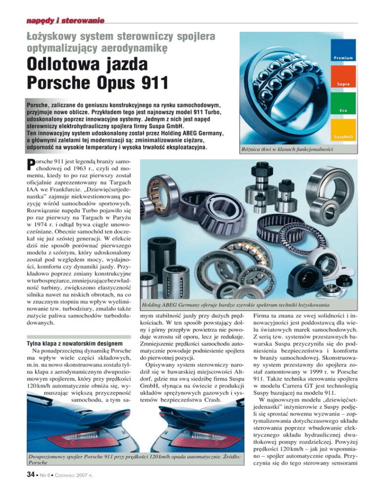 Łożyskowy system sterowniczy spojlera optymalizujący aerodynamikę Odlotowa jazda Porsche Opus 911 Porsche, zaliczane do geniuszu konstrukcyjnego na rynku samochodowym, przyjmuje nowe oblicze. Przykładem tego jest najnowszy model 911 Turbo, udoskonalony poprzez innowacyjne systemy. Jednym z nich jest napęd sterowniczy elektrohydrauliczny spojlera firmy Suspa GmbH. Ten innowacyjny system udoskonalony został przez Holding ABEG Germany, a głównymi zaletami tej modernizacji są: zminimalizowanie ciężaru, odporność na wysokie temperatury i wysoka trwałość eksploatacyjna. Różnica tkwi w klasach funkcjonalności P orsche 911 jest legendą branży samochodowej od 1963 r., czyli od momentu, kiedy to po raz pierwszy został oficjalnie zaprezentowany na Targach IAA we Frankfurcie. „Dziewięćsetjedenastka” zajmuje niekwestionowaną pozycję wśród samochodów sportowych. Rozwiązanie napędu Turbo pojawiło się po raz pierwszy na Targach w Paryżu w 1974 r. i odtąd bywa ciągle unowocześniane. Obecnie samochód ten doczekał się już szóstej generacji. W efekcie dziś nie sposób porównać pierwszego modelu z szóstym, który udoskonalony został pod względem mocy, wydajności, komfortu czy dynamiki jazdy. Przykładowo poprzez zmiany konstrukcyjne w turbosprężarce, zmniejszające bezwładność turbiny, zwiększono elastyczność silnika nawet na niskich obrotach, na co w znacznym stopniu ma wpływ wyeliminowanie tzw. turbodziury, zmalało także zużycie paliwa samochodów turbodoładowanych. Tylna klapa z nowatorskim designem Na ponadprzeciętną dynamikę Porsche ma wpływ wiele części składowych, m.in. na nowo skonstruowana została tylna klapa z aerodynamicznym dwupoziomowym spojlerem, który przy prędkości 120 km/h automatycznie obniża się, wymuszając większą przyczepność samochodu, a tym sa- Holding ABEG Germany oferuje bardzo szerokie spektrum techniki łożyskowania mym stabilność jazdy przy dużych prędkościach. W ten sposób powstający dolny i górny przepływ powietrza nie powoduje wzrostu sił oporu, lecz je redukuje. Zmniejszenie prędkości samochodu automatycznie powoduje podniesienie spojlera do pierwotnej pozycji. Opisywany system sterowniczy narodził się w bawarskiej miejscowości Altdorf, gdzie ma swą siedzibę firma Suspa GmbH, słynąca na świecie z produkcji układów sprężynowych gazowych i systemów bezpieczeństwa Crash. Dwupoziomowy spojler Porsche 911 przy prędkości 120 km/h opada automatycznie. Źródło: Porsche 34 NR 6 CZERWIEC 2007 R. Firma ta znana ze swej solidności i innowacyjności jest poddostawcą dla wielu światowych marek samochodowych. Z serią tzw. systemów przestawnych bawarska Suspa przyczyniła się do podniesienia bezpieczeństwa i komfortu w branży samochodowej. Skonstruowany system przestawny do spojlera został zamontowany w 1999 r. w Porsche 911. Także technika sterowania spojlera w modelu Carrera GT jest technologią Suspy bazującej na modelu 911. W najnowszym modelu „dziewięćsetjedenastki” inżynierowie z Suspy podjęli się sprostać nowemu wyzwaniu – zoptymalizowania dotychczasowego układu sterowania poprzez wbudowanie elektrycznego układu hydraulicznej dwutłokowej pompy rozdzielczej. Powyżej prędkości 120 km/h – jak już wspomniano – spojler automatycznie opada. Przyczynia się do tego sterowany sensorami silnik, który napędza pompę, ta z kolei wypompowuje olej ze zbiornika, powodując przesuwanie się przytwierdzonego do niego spojlera. Ze względu na aerodynamiczne wymogi zmniejszono tym rozwiązaniem suw do 35 mm, poprawiając aerodynamikę. Łożyskowanie subtelnego tuningu Porsche stawia wysokie wymogi spojlerowi. – Trzeba było wziąć pod uwagę wysoką temperaturę wytwarzaną przez silnik samochodu. Poza tym perfekcja działania systemu sterowniczego spojlera przy wysokich prędkościach i zmienionych siłach była nie lada wyzwaniem – mówi Michael Römer z działu konstrukcyjnego Suspy. Nie można też przemilczeć wymogu zminimalizowania ciężaru układu. O tym, jak temat ten jest istotny, świadczy walka o zredukowanie każdego dodatkowego grama wagi. Kompaktowość, możliwie najniższa waga, lekkość obrotu, jeżeli taki możliwy, bezawaryjność, a przy tym bezpieczeństwo i niezawodność systemu – to cechy, które stały się wyzwaniem dla każdego poddostawcy firmy Suspa. Przed tym trudnym zadaniem stanął także poddostawca Suspy – ABEG Holding Germany – w związku z łożyskowaniem sterowania przenoszenia napędu pomiędzy silnikiem a wrzecionem w układzie Technika w detalach Łożyska ABEG zdały wyśmienicie test w opisywanym zastosowaniu. Efekt to ok. 6000 Porsche 911 Turbo z zamontowanym systemem sterującym firmy Suspa rocznie opuszczających taśmy produkcyjne zakładów Porsche. Nie tylko zastosowanie rozwiązania w „dziewięćsetjedenastce”, lecz także tzw. długotrwałe testy przy zmieniającym się obciążeniu i wahaniach temperatur pomiędzy –20 i 85°C w specjalnie skonstruowanych komorach symulacyjnych potwierdziły niezawodność systemu i wbudowanych w nim łożysk. Zmieniający się ciężar jest spowodowany zmieniającą się pozycją spojlera w stosunku do oporu powietrza, jak i różną siłą uderzającego powietrza. Pierwsze testy prowadzone przez firmę Suspa z łożyskami wzdłużnymi z blaszanymi koszykami zakończyły sie niepowodzeniem, jako że łożyska te nie wytrzymywały zakładanej trwałości, która była o połowę krótsza. Przyczyną było przesunięcie koszyka w wymaganej zabudowie łożyska, a tym samym jego szybkie zużycie. Nowa konstrukcja koszyka centrującego kulki przyniosła pożądany efekt. spojlera. Dzięki specjalnie skonstruowanemu rozwiązaniu ABEG przyczynił się do innowacyjnej technologii spojlera w Porsche 911. Ze względu na ciasną zabudowę w układzie zastosowano łożysko wzdłużne zamiast porzecznego ze specjalnie skonstruowanym przez ABEG koszykiem. Zreduko