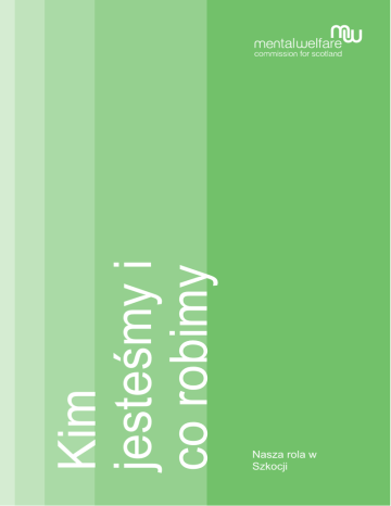Kim jesteśmy i co robimy Nasza rola w Szkocji Niniejsza ulotka wyjaśnia Kim jesteśmy Standardy opieki i leczenia, które według nas, się Tobie należą Ustawa o zdrowiu psychicznym i co ona oznacza dla Ciebie Co robimy Jak się z nami skontaktować Kim jesteśmy Jesteśmy niezależną organizacją pracującą nad zabezpieczeniem praw i opieki społecznej dla osób z chorobami umysłowymi, niezdolnością do nauki lub innymi zaburzeniami umysłowymi. Nasze zadania określone są w prawie o zdrowiu psychicznym. Składamy się z ludzi, którzy znają problemy oraz posiadają doświadczenie związane z chorobami psychicznymi i niezdolnością do nauki. Niektórzy z nas mają doświadczenie w zakresie ochrony zdrowia, pracy socjalnej lub prawa. Niektórzy z nas są opiekunami albo sami korzystali z usług w zakresie zdrowia psychicznego lub niezdolności do nauki. Wierzymy, że każdy z chorobą psychiczną, niezdolnością do nauki lub innymi zaburzeniami umysłowymi, powinien: • być traktowany z godnością i szacunkiem; • mieć prawo do opieki określonej przez przepisy prawa i całkowicie spełniającej profesjonalne normy; • mieć prawo do życia wolnego od złego traktowania, lekceważenia lub dyskryminacji; • uzyskać opiekę i leczenie najlepiej dopasowane do swych potrzeb; i mieć możliwość prowadzenia tak pełnego życia, jak to możliwe. Co robimy Sprawdzamy, czy terapia indywidualna jest zgodna z prawem i praktykami, o których wiemy, że dobrze się sprawdzają. • Poznajemy osoby korzystające z usług w zakresie zdrowia psychicznego i niezdolności do nauki oraz osoby świadczące te usługi. Poznajemy również opiekunów osób dorosłych/niepełnosprawnych, rzeczników praw pacjentów, organizacje ochotnicze oraz inne agencje zaangażowane w opiekę i pomoc medyczną. • Sprawdzamy dokumenty i dokumentację osób, które podlegają opiece lub leczeniu w ramach prawa o zdrowiu psychicznym. Jeżeli wydaje się nam, że są z tym problemy, przeprowadzamy kontrolę. Rzucamy wyzwanie instytucjom świadczącym usługi dla osób z chorobami psychicznymi lub niezdolnością do nauki, w celu sprawdzenia, czy oferują one najwyższy standard opieki. • Przepytujemy osoby zarządzające usługami w zakresie opieki i terapii. Prowadzimy dochodzenia w sprawach, co do których podejrzewamy poważne błędy w sposobie świadczenia opieki; Identyfikujemy działania, które się sprawdzają i zachęcamy osoby zaangażowane w usługi w zakresie zdrowia psychicznego i niezdolności do nauki do ich wykorzystywania. • Służymy radą, informacją i wskazówkami dla osób, które korzystają z usług w zakresie zdrowia psychicznego i niezdolności do nauki oraz osób świadczących te usługi. • Doradzamy osobom zatroskanym o to, czy ich prawa do opieki i leczenia lub prawa kogoś, kogo znają - są realizowane. Zawsze sprawdzamy problemy, które są do nas zgłaszane. • Służymy radą i informacją osobom oferującym opiekę i leczenie w zakresie działania Ustawy o zdrowiu psychicznym oraz Ustawy o niepełnosprawnych osobach dorosłych. • Pomagamy w problemach etycznych i promujemy najlepsze sposoby świadczenia opieki w zakresie chorób psychicznych i niezdolności do nauki. Mamy silny i wpływowy głos w zakresie rozwoju usług i polityk. • Mamy regularne i bezpośrednie kontakty z Rządem Szkocji (Scottish Executive), ministerstwami i parlamentarzystami. Mamy również kontakty z organizacjami profesjonalnymi i ochotniczymi oraz współpracujemy z nimi, aby wpływać na opracowanie i praktyczne wdrożenie polityk. Zbieramy informacje o stosowaniu prawa w zakresie chorób psychicznych i niepełnosprawnych osób dorosłych. Wykorzystujemy te informacje do promowania dobrego wykorzystania tych praw w Szkocji. • Jesteśmy informowani o doraźnych, krótkoterminowych i długoterminowych zarządzeniach w ramach tych przepisów. • Rozmawiamy z osobami, które są pod opieką i które są leczone w ramach niniejszego prawa, aby uzyskać informacje o ich doświadczeniach. Ustawa o zdrowiu psychicznym i co ona oznacza dla Ciebie Promujemy zasady Ustawy o zdrowiu psychicznym (opieka i leczenie) (Szkocja) z 2003 roku. Stanowi ona, że każdy prowadzący leczenie w ramach tej ustawy musi uwzględniać: • Twoje dotychczasowe i obecne życzenia dotyczące opieki i leczenia; • opinie wyznaczonej przez Ciebie osoby oraz opiekuna, kuratora lub opiekuna społecznego; • opcje dostępnych dla Ciebie w zakresie opieki i leczenia; • opiekę i leczenie, które będą najbardziej korzystne dla Ciebie; • Twoje indywidualne zdolności i okoliczności oraz inne ważne sprawy dotyczące Ciebie, takie jak wiek, płeć, orientację seksualną, religię, pochodzenie rasowe lub przynależność do jakiejkolwiek grupy etnicznej. Osoby opiekujące się Tobą powinny również zapewnić, że: • wszelkie ograniczenia Twojej wolności są minimalnymi, wymaganymi do zapewnienia Twojego bezpieczeństwa; • nie jesteś traktowany gorzej niż ktokolwiek inny, z tego powodu, że jesteś leczony w ramach ustawy o zdrowiu psychicznym; • o ile to możliwe, uwzględniane są potrzeby Twoich opiekunów, a Twoi opiekunowie uzyskują informacje, które mogą pomóc im w wypełnieniu ich roli; • otrzymujesz usługi, które są odpowiednie do Twoich potrzeb; • kiedy zakończysz leczenie przymusowe będziesz dalej otrzymywać opiekę i leczenie, których potrzebujesz, tak długo jak to konieczne; a jeżeli nie ukończyłeś 18 roku życia, najwyższy priorytet ma Twoje dobro. Jak się z nami skontaktować Mental Welfare Commission for Scotland K Floor Argyle House 3 Lady Lawson Street Edinburgh EH3 9SH Bezpłatny telefon dla korzystających z usług i opiekunów 0800 389 6809 Biuro 0131 222 6111 www.mwcscot.org.uk Twoja opinia Chcemy wiedzieć, co myślisz o naszych usługach. Jeżeli robimy coś niewłaściwie, chcielibyśmy mieć szansę robić to lepiej. Chcielibyśmy również wiedzieć,