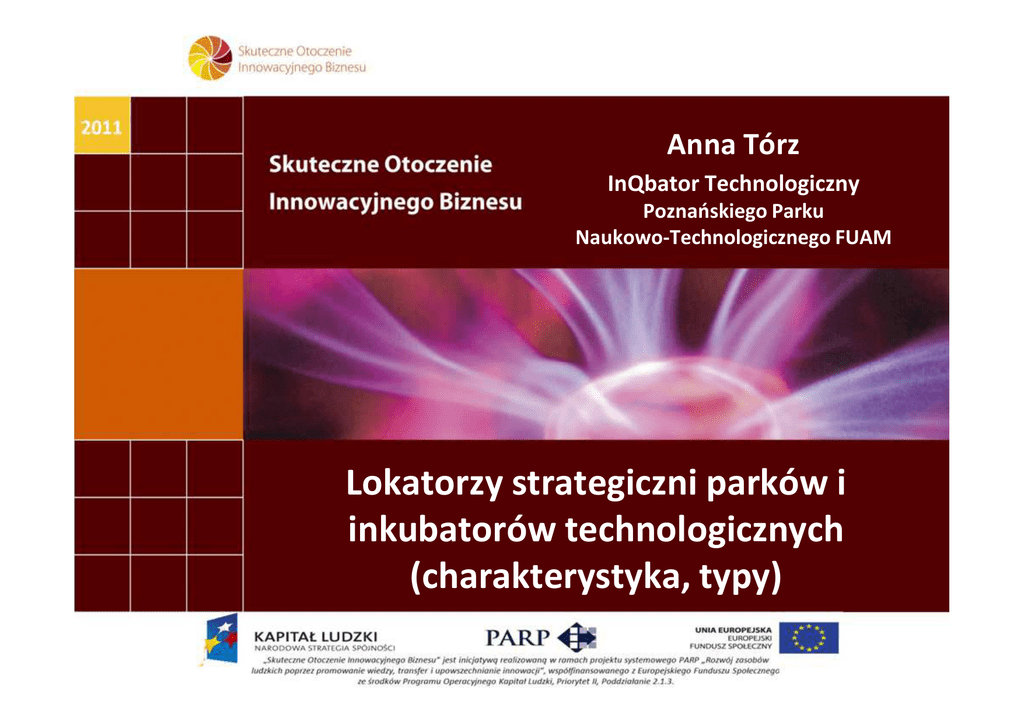 Anna Tórz InQbator Technologiczny Poznańskiego Parku Naukowo-Technologicznego FUAM Lokatorzy strategiczni parków i inkubatorów technologicznych (charakterystyka, typy) 2 Plan prezentacji Lokatorzy polskich parków i inkubatorów technologicznych Oczekiwania lokatorów Zasady współpracy Park Naukowy Mjärdevi Park Naukowy w Barcelonie Polskie realia Grace Co lokator strategiczny może dać IOB? 3 LOKATOR PARKU: to firma zlokalizowana na terenie parku technologicznego, korzystająca z infrastruktury, usług w zakresie doradztwa w tworzeniu i rozwoju przedsiębiorstw lub transferu technologii oferowanego przez park technologiczny. /Źródło: Benchmarking parków technologicznych w Polsce – Raport 2010, B. Kowalak, PARP, Warszawa 2010/ 4 Lokatorzy parków technologicznych w Polsce Ile podmiotów? około 580 (połowa 2009 r.) Struktura podmiotów? MŚP – 65,1% Małe firmy technologiczne – 16,3% Firmy z kapitałem zagranicznym – 10,8% Instytucje naukowo-badawcze – 3,0% Inne – 4,8% /Źródło: Ośrodki innowacji i przedsiębiorczości w Polsce. Raport 2009, PARP/ 5 Lokatorzy inkubatorów technologicznych w Polsce Ile podmiotów? około 350 (połowa 2009 r.) Struktura podmiotów? Firmy objęte preferencjami – 52,2% Firmy nowo utworzone – 36,1% Lokatorzy strategiczni – 8% Inne instytucje – 3,7% 6 LOKATOR STRATEGICZNY: to podmiot wynajmujący od parku znaczną powierzchnię użytkową po cenach komercyjnych, którego profil działalności jest zbieżny ze specjalizacją parku technologicznego. /Źródło: Benchmarking parków technologicznych w Polsce – Raport 2010, B. Kowalak, PARP, Warszawa 2010/ 7 Dlaczego poświęcamy tym podmiotom osobne spotkanie broszurę audycję radiową? 8 Charakterystyka Lokatorzy strategiczni: ze względów organizacyjno-finansowych wynajmują dużą powierzchnię, zapewniają regularne wpływy, stabilizują sytuację ekonomiczną instytucji, ze względów merytorycznych prowadzą działalność spójną ze specjalizacją parku/inkubatora, współpracują z parkiem/inkubatorem lub/oraz innymi firmami w realizacji projektów badawczo-rozwojowych lub/i biznesowych. 9 Charakterystyka Lokatorzy strategiczni: w parku technologicznym/naukowo-technologicznym: duże przedsiębiorstwa (rozbudowana struktura organizacyjna), zarówno „organizacyjno-finansowi”, jak i „merytoryczni”, w inkubatorze technologicznym: mniejsze firmy (najczęściej mikro i małe), głównie „merytoryczni”. 10 Oczekiwania Główne czynniki decydujące o ulokowaniu firmy na terenie parku to: prestiż parku, lokalizacja geograficzna, bliska obecność uczelni wyższej/instytutu, poziom infrastruktury, oferta usług o wartości dodanej, dostęp do klienta, oferta usług podstawowych”. /Wybrane aspekty funkcjonowania parków technologicznych w Polsce i na świecie, red. K.B. Matusiak, A. Bąkowski, PARP, Warszawa 2008, s. 152/ 11 Zasady współpracy i oferta Negocjowane indywidualnie (wysokość stawek najmu, zasady wynajmu Oparte na dobrowolności – np. lokator strategiczny nie powinien mieć obowiązku przestawiania swoich wyników finansowych Oferta: Tereny inwestycyjne Laboratoria / przestrzenie produkcyjne / prototypownie Doradztwo – specjalistyczne – okołobiznesowe Organizowanie sieci współpracy 12 Park Naukowy Mjärdevi Rok powstania: 1984 Powierzchnia parku: 70 ha Powierzchnia pod wynajem: 190 tys. m2 Liczba firm: ok. 250 Właściciel : Miasto Linköping Bardzo ścisłe związki z Uniwersytetem w Linköping 13 Park Naukowy Mjärdevi Intensywny rozwój parku nastąpił po ulokowaniu się na jego terenie – w 1987 r. – firmy Ericsson Ericsson Application Center oraz Ericsson Mobile Communications grupy projektowe tworzące oprogramowanie dla sprzętów wytwarzanych dla Ericssona 1987 r. – 25 pracowników, 1995 r. – 700 osób Kolejne duże firmy: Nokia Data, Motorola W latach 1992-1996 liczba firm w parku podwoiła się 14 Park Naukowy w Barcelonie Rok powstania: 1997 Powierzchnia pod wynajem: 26 tys. m2 Liczba firm: ok. 75 Właściciele: Uniwersytet w Barcelonie, Rząd Katalonii, Centrum Transferu Technologii Uniwersytetu Barcelońskiego Bank 15 Park Naukowy w Barcelonie Lokatorzy „naukowi”: laboratoria światowych koncernów, instytuty badawcze. Lokatorzy biznesowi: firmy rozwinięte działające na rynkach międzynarodowych, posiadające w strukturze własne jednostki B+R, małe i średnie przedsiębiorstwa, nie posiadające dostępu do wielu źródeł nowych technologii, nowo utworzone spółki typu spin-off i start-up. 16 Park Naukowy w Barcelonie Lokatorzy strategiczni: Laboratoria „mieszane”: Realizacja – w ramach umów pomiędzy parkiem i prywatnymi firmami – projektów badawczych Umowa na opracowanie nowej technologii Platformy Technologiczne: Ośrodek badawczy rozwijający nowe technologie Dysponuje unikalną infrastrukturę laboratoryjną Działa w partnerstwie z ośrodkami naukowymi Barcelony Wykonuje usługi badawcze dla przedsiębiorstw 17 Polskie realia Park typ lokatora Gdański Park Naukowo-Technologiczny przedstawicielstwa korporacji zagranicznych Krakowski Park Technologiczny duże przedsiębiorstwa, zatrudniające ponad 250 osób Poznański Park Naukowo-Technologiczny centra badawcze, działy B+R Fundacji Uniwersytetu im. A. zagranicznych koncernów Mickiewicza w Poznaniu /Źródło: Benchmarking parków technologicznych w Polsce. Wyniki i badania, PARP, Warszawa 2008/ 18 GRACE – jak pozyskać lokatora strategicznego Grace Construction Polska - potencjalny lokator strategiczny Duży koncern chemiczny (przemysł produktów budowlanych) Dlaczego w PPNT FUAM? zainteresowanie specjalizacją PPNT FUAM (chemia), możliwość korzystania z powierzchni badawczej, chęć ulokowania w parku działu B+R, możliwość wykorzystania potencjału naukowego parku i uczelni (Wydział Chemii UAM) . Jak przebiega współpraca? Grace zamawia prace w Inkubatorze Technologii Chemicznych, park rozbudowuje infrastrukturę na potrzeby G