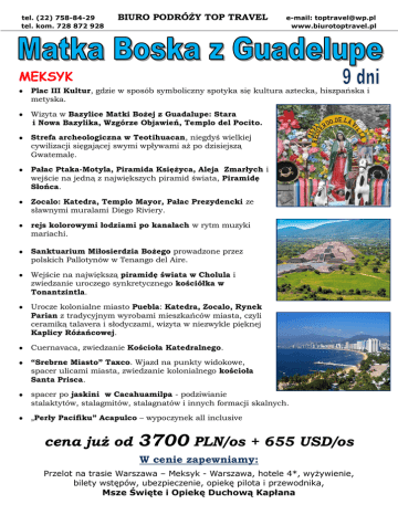 tel. (22) 758-84-29 tel. kom. 728 872 928 BIURO PODRÓŻY TOP TRAVEL e-mail: [email protected] www.biurotoptravel.pl MEKSYK Plac III Kultur, gdzie w sposób symboliczny spotyka się kultura aztecka, hiszpańska i metyska. Wizyta w Bazylice Matki Bożej z Guadalupe: Stara i Nowa Bazylika, Wzgórze Objawień, Templo del Pocito. Strefa archeologiczna w Teotihuacan, niegdyś wielkiej cywilizacji sięgającej swymi wpływami aż po dzisiejszą Gwatemalę. Pałac Ptaka-Motyla, Piramida Księżyca, Aleja Zmarłych i wejście na jedną z największych piramid świata, Piramidę Słońca. Zocalo: Katedra, Templo Mayor, Pałac Prezydencki ze sławnymi muralami Diego Riviery. rejs kolorowymi łodziami po kanałach w rytm muzyki mariachi. Sanktuarium Miłosierdzia Bożego prowadzone przez polskich Pallotynów w Tenango del Aire. Wejście na największą piramidę świata w Cholula i zwiedzanie uroczego synkretycznego kościółka w Tonantzintla. Urocze kolonialne miasto Puebla: Katedra, Zocalo, Rynek Parian z tradycyjnym wyrobami mieszkańców miasta, czyli ceramiką talavera i słodyczami, wizyta w niezwykle pięknej Kaplicy Różańcowej. Cuernavaca, zwiedzanie Kościoła Katedralnego. “Srebrne Miasto” Taxco. Wjazd na punkty widokowe, spacer ulicami miasta, zwiedzanie kolonialnego kościoła Santa Prisca. spacer po jaskini w Cacahuamilpa - podziwianie stalaktytów, stalagmitów, stalagnatów i innych formacji skalnych. „Perły Pacifiku” Acapulco – wypoczynek all inclusive cena już od 3700 PLN/os + 655 USD/os W cenie zapewniamy: Przelot na trasie Warszawa – Meksyk - Warszawa, hotele 4*, wyżywienie, bilety wstępów, ubezpieczenie, opiekę pilota i przewodnika, Msze Święte i Opiekę Duchową Kapłana