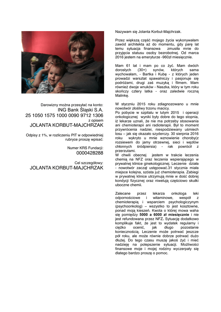 Nazywam się Jolanta Korbut-Majchrzak. Przez większą część mojego życia wykonywałam zawód architekta aż do momentu, gdy parę lat temu sytuacja finansowa zmusiła mnie do przyjęcia statusu osoby bezrobotnej. Od marca 2016 jestem na emeryturze -960zł miesięcznie. Mam 61 lat i mam po co żyć. Mam dwóch dorosłych (30+) synów, których sama wychowałam, - Bartka i Kubę - z których jeden prowadzi warsztat spawalniczy i pasjonuje się podróżami, drugi zaś muzyką i filmem. Mam również dwoje wnuków - Naszka, który w tym roku skończy cztery latka - oraz zaledwie roczną Malinkę. Darowizny można przesyłać na konto: ING Bank Śląski S.A. 25 1050 1575 1000 0090 9712 1306 z opisem JOLANTA KORBUT-MAJCHRZAK Odpisy z 1%, w rozliczeniu PIT w odpowiedniej rubryce proszę wpisać: Numer KRS Fundacji: 0000428288 Cel szczegółowy: JOLANTA KORBUT-MAJCHRZAK W styczniu 2015 roku zdiagnozowano u mnie nowotwór złośliwy trzonu macicy. Po pobycie w szpitalu w lutym 2015 i operacji onkologicznej wyniki były dobre do tego stopnia, iż lekarze uznali, że nie ma potrzeby stosowania ani chemioterapii ani radioterapii. Był to moment przywrócenia nadziei, niespodziewany uśmiech losu – jak się okazało szyderczy. 30 sierpnia 2016 roku wykryto u mnie wznowienie choroby(z rozsiewem do jamy otrzewnej, sieci i węzłów chłonnych śródpiersia) - rak powrócił z przerzutami. W chwili obecnej jestem w trakcie leczenia chemią na NFZ oraz leczenia wspierającego w prywatnej klinice ginekologicznej. Leczenie działa - nowotwór zaczął ustępować.31 stycznia miała miejsce kolejna, szósta już chemioterapia. Zabiegi w prywatnej klinice utrzymują mnie w dość dobrej kondycji fizycznej oraz niwelują częściowo skutki uboczne chemii. Zalecane przez lekarza onkologa leki odpornościowe i witaminowe, wespół z chemioterapią i wsparciem psychologiczynym (psychoonkolog) – wszystko to jest kosztowne, ponad moją kieszeń. Kwota o której mowa waha się pomiędzy 5000 a 6000 zł miesięcznie i nie jest refundowana przez NFZ. Sytuację dodatkowo komplikuje fakt, że jest to wydatek regularny i ciężko ocenić, jak długo pozostanie koniecznością. Leczenie może potrwać jeszcze pół roku, ale może równie dobrze potrwać dużo dłużej. Do tego czasu muszę jakoś żyć i mieć nadzieję na polepszenie sytuacji. Możliwości finansowe moje i mojej rodziny wyczerpały się dlatego bardzo proszę o pomoc.