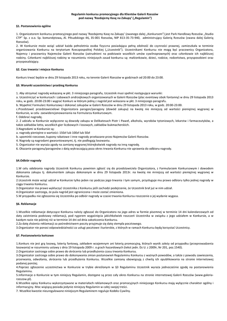 Regulamin konkursu promocyjnego dla Klientów Galerii Rzeszów pod nazwą ‘Rozdajemy Kasę na Zakupy’ („Regulamin”) §1. Postanowienia ogólne 1. Organizatorem konkursu promocyjnego pod nazwą ‘Rozdajemy Kasę na Zakupy’ (zwanego dalej „Konkursem”) jest Park Handlowy Rzeszów „Studio CTP” Sp. z o.o. Sp. komandytowa, Al. Piłsudskiego 44, 35-001 Rzeszów, NIP 813-35-73-940, administrujący Galerią Rzeszów (zwana dalej Galerią Rzeszów). 2. W Konkursie może wziąć udział każda pełnoletnia osoba fizyczna posiadająca pełną zdolność do czynności prawnej, zamieszkała w terminie organizowania Konkursu na terytorium Rzeczpospolitej Polskiej („Uczestnik”). Uczestnikami Konkursu nie mogą być pracownicy Organizatora, Najemcy i pracownicy Najemców Galerii Rzeszów (zatrudnieni na podstawie wszelkich umów cywilnoprawnych) oraz członkowie ich najbliższej rodziny. Członkami najbliższej rodziny w rozumieniu niniejszych zasad konkursu są: małżonkowie, dzieci, rodzice, rodzeństwo, przysposobieni oraz przysposabiający. §2. Czas trwania i miejsce Konkursu Konkurs trwać będzie w dniu 29 listopada 2013 roku, na terenie Galerii Rzeszów w godzinach od 20:00 do 23:00. §3. Warunki uczestnictwa i przebieg Konkursu 1. Aby otrzymać nagrodę wskazaną w pkt. 3 niniejszego paragrafu, Uczestnik musi spełnić następujące warunki: a. Uczestniczyć w konkursach i zabawach andrzejkowych organizowanych w Galerii Rzeszów (plac eventowy obok fontanny) w dniu 29 listopada 2013 roku, w godz. 20:00-23:00 i wygrać Konkurs w którym jedną z nagród jest wskazana w pkt. 3 niniejszego paragrafu. b. Wypełnić Formularz Konkursowy i dokonać zakupów w Galerii Rzeszów w dniu 29 listopada 2013 roku, w godz. 20:00-23:00. c.Przedstawić przedstawicielowi Organizatora paragon/paragony (dowód zakupu) na kwotę nie mniejszą od wartości pieniężnej wygranej w Konkursie, w celu zaewidencjonowaniania na Formularzu Konkursowym. f. Odebrać nagrodę. 2. Z udziału w Konkursie wyłączone są dowody zakupu w Delikatesach Piotr i Paweł, alkoholu, wyrobów tytoniowych, lekarstw i farmaceutyków, a także zakładów lotto, wszelkich gier liczbowych i losowych, zakładów bukmacherskich. 3.Nagrodami w Konkursie są: a. nagrody pieniężne o wartości: 150zł lub 100zł lub 50zł b. upominki rzeczowe, kupony rabatowe i inne nagrody przekazane przez Najemców Galerii Rzeszów. 4. Nagrody są nagrodami gwarantowanymi, tj. nie podlegają losowaniu. 5. Organizator nie wyraża zgody na zamianę wygranej którejkolwiek nagrody na inną nagrodę. 6. Okazanie paragonu/paragonów z datą wykraczającą poza okres trwania Konkursu nie uprawnia do odbioru nagrody. §4.Odbiór nagrody 1.W celu odebrania nagrody Uczestnik Konkursu powinien zgłosić się do przedstawiciela Organizatora, z Formularzem Konkursowym i dowodem dokonania zakupu tj. dokumentem zakupu dokonanym w dniu 29 listopada 2013r. na kwotę nie mniejszą od wartości pieniężnej wygranej w Konkursie. 2.Uczestnik może wziąć udział w Konkursie tylko jeden raz podczas jego trwania i tym samym, przysługuje mu prawo odbioru tylko jednej nagrody w ciągu trwania Konkursu. 3.Organizator ma prawo wykluczyć Uczestnika z Konkursu jeśli zachodzi podejrzenie, że Uczestnik brał już w nim udział. 4.Organizator zastrzega, że pula nagród jest ograniczona i może zostać zmieniona. 5.W przypadku nie zgłoszenia się Uczestnika po odbiór nagrody w czasie trwania Konkursu roszczenie o jej wydanie wygasa. §6. Reklamacje 1.Wszelkie reklamacje dotyczące Konkursu należy zgłaszać do Organizatora na jego adres w formie pisemnej w terminie 14 dni kalendarzowych od daty zaistnienia podstawy reklamacji, pod rygorem wygaśnięcia jakichkolwiek roszczeń Uczestnika w związku z jego udziałem w Konkursie, a w każdym razie nie później niż w terminie 14 dni od dnia zakończenia Konkursu. 2.Za datę złożenia reklamacji za pośrednictwem poczty przyjmuje się datę stempla pocztowego. 3.Organizator nie ponosi odpowiedzialności za usługi pocztowe i kurierskie, z których w ramach Konkursu będą korzystać Uczestnicy. §7. Postanowienia końcowe 1.Konkurs nie jest grą losową, loterią fantową, zakładem wzajemnym ani loterią promocyjną, których wynik zależy od przypadku (przeprowadzenia losowania) w rozumieniu ustawy z dnia 19 listopada 2009 r. o grach hazardowych (tekst jedn. Dz U. z 2009r, Nr 201, poz.1540). 2.Organizator zastrzega sobie prawo do skrócenia lub przedłużenia czasu trwania Konkursu. 3.Organizator zastrzega sobie prawo do dokonywania zmian postanowień Regulaminu Konkursu z ważnych powodów, a także z powodu zawieszenia, przerwania, odwołania, skrócenia lub przedłużenia Konkursu. Wszelkie zamiany obowiązują z chwilą ich opublikowania na stronie internetowej podanej poniżej. 4.Poprzez zgłoszenie uczestnictwa w Konkursie w trybie określonym w §3 Regulaminu Uczestnik wyraża jednocześnie zgodę na postanowienia Regulaminu. 5.Informacje o Konkursie w tym niniejszy Regulamin, dostępne są przez cały okres Konkursu na stronie internetowej Galerii Rzeszów (www.galeriarzeszow.pl). 6.Wszelkie opisy Konkursu wykorzystywane w materiałach reklamowych oraz promocyjnych niniejszego Konkursu mają wyłącznie charakter ogólny i informacyjny. Moc wiążącą posiada jedynie niniejszy Regulamin w całej swojej treści. 7. Wszelkie kwestie nieuregulowane niniejszym Regulaminem reguluje Kodeks Cywilny.