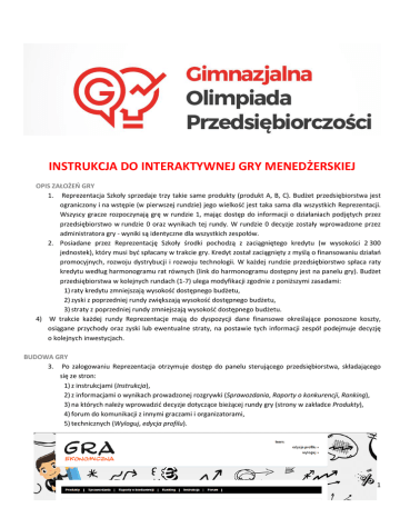 INSTRUKCJA DO INTERAKTYWNEJ GRY MENEDŻERSKIEJ OPIS ZAŁOŻEŃ GRY 1. Reprezentacja Szkoły sprzedaje trzy takie same produkty (produkt A, B, C). Budżet przedsiębiorstwa jest ograniczony i na wstępie (w pierwszej rundzie) jego wielkość jest taka sama dla wszystkich Reprezentacji. Wszyscy gracze rozpoczynają grę w rundzie 1, mając dostęp do informacji o działaniach podjętych przez przedsiębiorstwo w rundzie 0 oraz wynikach tej rundy. W rundzie 0 decyzje zostały wprowadzone przez administratora gry - wyniki są identyczne dla wszystkich zespołów. 2. Posiadane przez Reprezentację Szkoły środki pochodzą z zaciągniętego kredytu (w wysokości 2 300 jednostek), który musi być spłacany w trakcie gry. Kredyt został zaciągnięty z myślą o finansowaniu działań promocyjnych, rozwoju dystrybucji i rozwoju technologii. W każdej rundzie przedsiębiorstwo spłaca raty kredytu według harmonogramu rat równych (link do harmonogramu dostępny jest na panelu gry). Budżet przedsiębiorstwa w kolejnych rundach (1-7) ulega modyfikacji zgodnie z poniższymi zasadami: 1) raty kredytu zmniejszają wysokość dostępnego budżetu, 2) zyski z poprzedniej rundy zwiększają wysokość dostępnego budżetu, 3) straty z poprzedniej rundy zmniejszają wysokość dostępnego budżetu. 4) W trakcie każdej rundy Reprezentacje mają do dyspozycji dane finansowe określające ponoszone koszty, osiągane przychody oraz zyski lub ewentualne straty, na postawie tych informacji zespół podejmuje decyzję o kolejnych inwestycjach. BUDOWA GRY 3. Po zalogowaniu Reprezentacja otrzymuje dostęp do panelu sterującego przedsiębiorstwa, składającego się ze stron: 1) z instrukcjami (Instrukcja), 2) z informacjami o wynikach prowadzonej rozgrywki (Sprawozdania, Raporty o konkurencji, Ranking), 3) na których należy wprowadzić decyzje dotyczące bieżącej rundy gry (strony w zakładce Produkty), 4) forum do komunikacji z innymi graczami i organizatorami, 5) technicznych (Wyloguj, edycja profilu). 1 4. Reprezentacja Szkoły wprowadza decyzje na stronach dostępnych w zakładce "Produkty". Główna strona Produktów zawiera tabele podsumowujące, łącza do stron produktów oraz podpowiedzi dotyczące gry. 5. Pierwsza tabela na stronie „Produkty” prezentuje informacje o całkowitym budżecie na wydatki promocyjne, rozwój dystrybucji i rozwój produktów dla bieżącej rundy, zaplanowanych wydatkach oraz kwocie pozostającej do dyspozycji. Druga tabela prezentuje wprowadzone dane dla produktów oraz zawiera łącza umożliwiające przejście na stronę wybranego produktu. Obok nagłówków obu tabeli znajdują się symbole . Najechanie kursorem na symbol umożliwia wyświetlenie podpowiedzi. 6. Strona każdego z trzech produktów składa się z nagłówka i formularza danych. W nagłówku znajdują się tabele podsumowujące informacje na temat budżetu do dyspozycji oraz podjętych decyzji dla wszystkich produktów. Nagłówek zawiera również opis danego produktu wraz z podstawowymi informacjami o nim: 1) Siła marki – jest mierzona rozpoznawalnością marki wśród konsumentów; rozpoznawalność jest obrazowana gwiazdkami w skali od 1 do 10, a po najechaniu kursorem na grafikę zostaje wyświetlona dodatkowa informacja o sile marki w skali od 0 do 100, 2) Szybkie podsumowanie – dane prezentujące wydatki i cenę z poprzedniej rundy oraz planowane na rundę bieżącą, wraz z informacjami o wolumenie sprzedaży z poprzedniej rundy oraz aktualnym jednostkowym koszcie zmiennym produktu, który jest sumą jednostkowych kosztów wytworzenia (wyszczególnione w pozycji B w sprawozdaniu za ostatni kwartał) i jednostkowych kosztów innych (wyszczególnione w pozycji D w sprawozdaniu za ostatni kwartał). 7. Formularz do wprowadzania danych podzielony jest na cztery obszary. Do każdej części przyporządkowany jest dyrektor odpowiadający za aktywności w danym obszarze. Jego zadaniem jest przekazywanie praktycznych wskazówek dotyczących podejmowanych decyzji. Istnieją cztery rodzaje wskazówek: 2 1) wskazówki na białym tle mają charakter ogólno-informacyjny, 2) wskazówki na zielonym tle informują o prawidłowym wprowadzeniu danych z danego obszaru, 3) wskazówki na żółtym tle informują o podejmowaniu decyzji o większym stopniu ryzyka. Takie decyzje w grze są dopuszczalne i traktowane jako decyzje prawidłowo wprowadzone (nie wymagają korekty, ani powtórnego wprowadzenia), 4) wskazówki na czerwonym tle informują o próbie podjęcia błędnej decyzji, np. wprowadzeniu zbyt wysokiej kwoty, która powoduje przekroczenie budżetu -te decyzje nie są zapisywane – wymagają korekty i ponownego zatwierdzenia danych. 8. 9. 10. 11. 12. W każdym z 4 obszarów formularza znajduje się przycisk „podpowiedź”. Najechanie na niego kursorem powoduje wyświetlenie podpowiedzi dla danego obszaru. Możliwość podejmowania decyzji w kolejnych obszarach jest udostępniana stopniowo w miarę postępu rozgrywki: 1) decyzje dotyczące ceny są dostępne od rundy 1, 2) decyzje dotyczące promocji i rozwoju są dostępne od rundy 3, 3) decyzje dotyczące dystrybucji są dostępne od rundy 5. Podjęcie decyzji w sprawie działalności w danej rundzie należy poprzedzić analizą informacji finansowych przedsiębiorstwa oraz danych o sytuacji rynkowej. Są one dostępne w zakładkach: „Sprawozdania” i „Raporty o konkurencji”. Dodatkowo w zakładce „Ranking” dostępne są dane o pozycji poszczególnych zespołów w grze. Na stronie głównej sprawozdań znajdują się: 1) streszczenie menedżerskie, 2) lista szczegółowych sprawozdań z rundy startowej (Runda 0) oraz wszystkich rund, które odbyły się w trakcie gry. W streszczeniu menedżerskim znajdują się zebrane najważniejsze informacje o działaniach podejmowanych przez przedsiębiorstwo i ich efektach ze wszystkich rund w rozbiciu na produkty oraz wyniki sumarczyne (zysk i wielkość budżetu). 3 13. Szczegółowe infor
