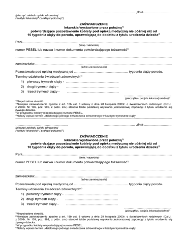 ……………………………………….. ………………………. ,dnia ............................. (pieczęć zakładu opieki zdrowotnej Praktyki lekarskiej* / praktyki położnej1)) ZAŚWIADCZENIE lekarskie/wystawione przez położną1) potwierdzające pozostawienie kobiety pod opieką medyczną nie później niż od 10 tygodnia ciąży do porodu, uprawniającą do dodatku z tytułu urodzenia dziecka 2) Pani……………………………………………………………………………………………………………………. (imię i nazwisko) numer PESEL lub nazwa i numer dokumentu potwierdzającego tożsamość3) …………………………………………………………………………………………………………………………. zamieszkała:………………………………………………………………………………………………………….. (adres zamieszkania) Pozostawała pod opieką medyczną od ………………………………………… tygodnia ciąży porodu. Terminy udzielenia świadczeń zdrowotnych 4) 1) pierwszy trymestr ciąży - ……………………………………….. 2) drugi trymestr ciąży 3) trzeci trymestr ciąży - ……………………………………….. ………………………………………. ………………………………....... (pieczątka i podpis lekarza/położnej1) Niepotrzebne skreślić. 2) Niniejsze zaświadczenie zgodne z art. 15b ust. 6 ustawy z dnia 28 listopada 2003r. o świadczeniach rodzinnych (Dz.U. z 2006r. Nr 139, poz. 992, z późn. zm.) stanowi także podstawę uzyskania jednorazowej zapomogi z tytułu urodzenia się żywego dziecka. 3) W przypadku kobiety nieposiadającej numeru PESEL. 4) Należy wpisać termin udzielonego jednego świadczenia zdrowotnego w każdym trymestrze ciąży. -------------------------------------------------------------------------------------------------------------------------------------------------------------------------1) ……………………………………….. ………………………. ,dnia ............................. (pieczęć zakładu opieki zdrowotnej Praktyki lekarskiej* / praktyki położnej1)) ZAŚWIADCZENIE lekarskie/wystawione przez położną1) potwierdzające pozostawienie kobiety pod opieką medyczną nie później niż od 10 tygodnia ciąży do porodu, uprawniającą do dodatku z tytułu urodzenia dziecka 2) Pani……………………………………………………………………………………………………………………. (imię i nazwisko) numer PESEL lub nazwa i numer dokumentu potwierdzającego tożsamość3) …………………………………………………………………………………………………………………………. zamieszkała:………………………………………………………………………………………………………….. (adres zamieszkania) Pozostawała pod opieką medyczną od ………………………………………… tygodnia ciąży porodu. Terminy udzielenia świadczeń zdrowotnych 4) 1) pierwszy trymestr ciąży - ……………………………………….. 2) drugi trymestr ciąży - ……………………………………….. 3) trzeci trymestr ciąży - ………………………………………. ………………………………....... (pieczątka i podpis lekarza/położnej1) Niepotrzebne skreślić. 2) Niniejsze zaświadczenie zgodne z art. 15b ust. 6 ustawy z dnia 28 listopada 2003r. o świadczeniach rodzinnych (Dz.U. z 2006r. Nr 139, poz. 992, z późn. zm.) stanowi także podstawę uzyskania jednorazowej zapomogi z tytułu urodzenia się żywego dziecka. 3) W przypadku kobiety nieposiadającej numeru PESEL. 4) Należy wpisać termin udzielonego jednego świadczenia zdrowotnego w każdym trymestrze ciąży. 1)