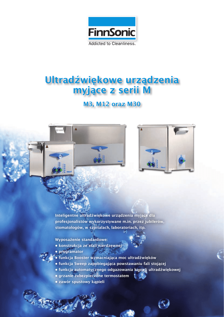 Ultradźwiękowe urządzenia myjące z serii M M3, M12 oraz M30 Inteligentne ultradźwiękowe urządzenia myjące dla profesjonalistów wykorzystywane m.in. przez jubilerów, stomatologów, w szpitalach, laboratoriach, itp. Wyposażenie standardowe: • konstrukcja ze stali nierdzewnej • programator • funkcja Booster wzmacniająca moc ultradźwięków • funkcja Sweep zapobiegająca powstawaniu fali stojącej • funkcja automatycznego odgazowania kąpieli ultradźwiękowej • grzanie zabezpieczone termostatem • zawór spustowy kąpieli Inteligentna moc myjąca Sercem urządzenia jest system ultradźwięków składający się z generatora oraz nowoczesnych przetworników piezoelektrycznych. Funkcja Booster dodatkowo wzmacnia moc ultradźwięków i jest stosowana do mycia części bardzo precyzyjnych. Funkcja Sweep zapobiega powstawaniu fali stojącej i powoduje równomierne rozłożenie fali ultradźwiękowej w każdym miejscu zbiornika. Myjki ultradźwiękowe wyposażone są w grzałki kontrolowane przez termostat, aby zapewnić właściwą i optymalną temperaturę mycia. Trwałość i higiena Zbiornik jest wykonany z polerowanej stali nierdzewnej a jego rogi są zaokrąglone. Dzięki temu urządzenie łatwo utrzymać w czystości. Panel sterowania jest chroniony przed zalaniem dzięki zamontowanemu ochraniaczowi z logo firmy. Bezpieczeństwo i łatwość obsługi • ze względów bezpieczeństwa urządzenie jest zabezpieczone przed pracą “na sucho”. Dodatkowo urządzenie wyłącza się automatycznie po 12 godzinach ciągłej pracy • łatwy w obsłudze panel sterowania z obrotowymi pokrętłami do ustawiania czasu pracy i temperatury • wartość czasu oraz inne funkcje są czytelnie wskazywane przez diody LED •łatwy i szybki spust kąpieli następuje dzięki zamontowanemu zaworowi spustowemu • specjalna funkcja odgazowania pozwala usunąć uwięzione powietrze z kąpieli • dodatkowa funkcja pozwalająca uruchomić ultradźwięki po wcześniejszym osiągnięciu zadanej temperatury • łatwy transport urządzenia dzięki uchwytom transportowym, umieszczonym z boków myjki Akcesoria • • • koszyk obróbkowy ze stali nierdzewnej pokrywa wykonana z plastiku, spełniająca także funkcję podstawki pod koszyk. zlewki szklane oraz podstawka na dwie zlewki Prosimy o kontakt z naszą firmą w celu uzyskania więcej informacji o oferowanych przez nas produktach. Dane techniczne M3 1,9 240x137x100 198x106x50 300x179x214 80/160 40 200 220 – 240/ 50 - 60 280 R 3/8” 3,3 M12 9 300x240x200 250x190x115 365x278x321 200/400 40 800 220 – 240/ 50 - 60 1000 R 3/8” 7,5 M30 20,6 505x300x200 455x250x115 568x340x321 300/600 40 1200 220 – 240/ 50 - 60 1500 R 3/8” 11 01/12 Efektywna pojemność zbiornika Wymiary wewnętrzne zbiornika Wymiary wewnętrzne kosza obróbkowego Wymiary zewnętrzne Moc ultradźwięków Częstotliwość ultradźwięków Moc grzewcza Zasilanie Moc przyłączeniowa Zawór spustowy Ciężar FinnSonic Oy Parikankatu 8, 15170 Lahti, Finland tel. +358 3 883 030, fax +358 3 883 0330 [email protected], www.finnsonic.com Wyłączny dystrybutor ul. Krakowiaków 103, 02-255 Warszawa Tel. 22 868 61 37, fax 22 846 59 56 [email protected], www.ltt.pl Zmiany techniczne zastrzeżone. Wszystkie znaki towarowe i prawa autorskie, o których mowa w niniejszym dokumencie są wyłączną własnością ich właścicieli.