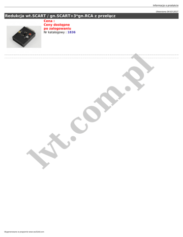 Informacje o produkcie Utworzono 04-03-2017 Redukcja wt.SCART / gn.SCART+3*gn.RCA z przełącz Cena : Ceny dostępne po zalogowaniu lv t. co m .p l Nr katalogowy : 1836 Wygenerowano w programie www.oscGold.com